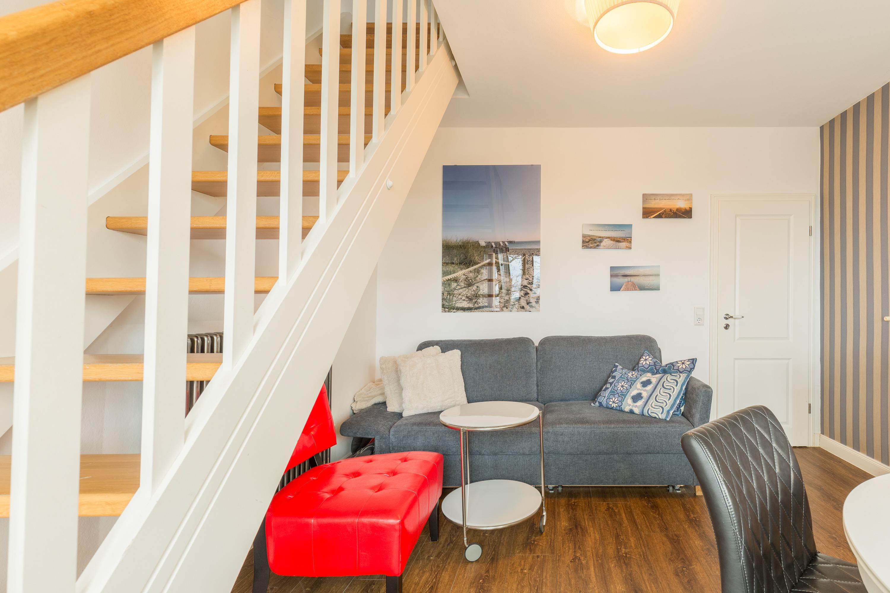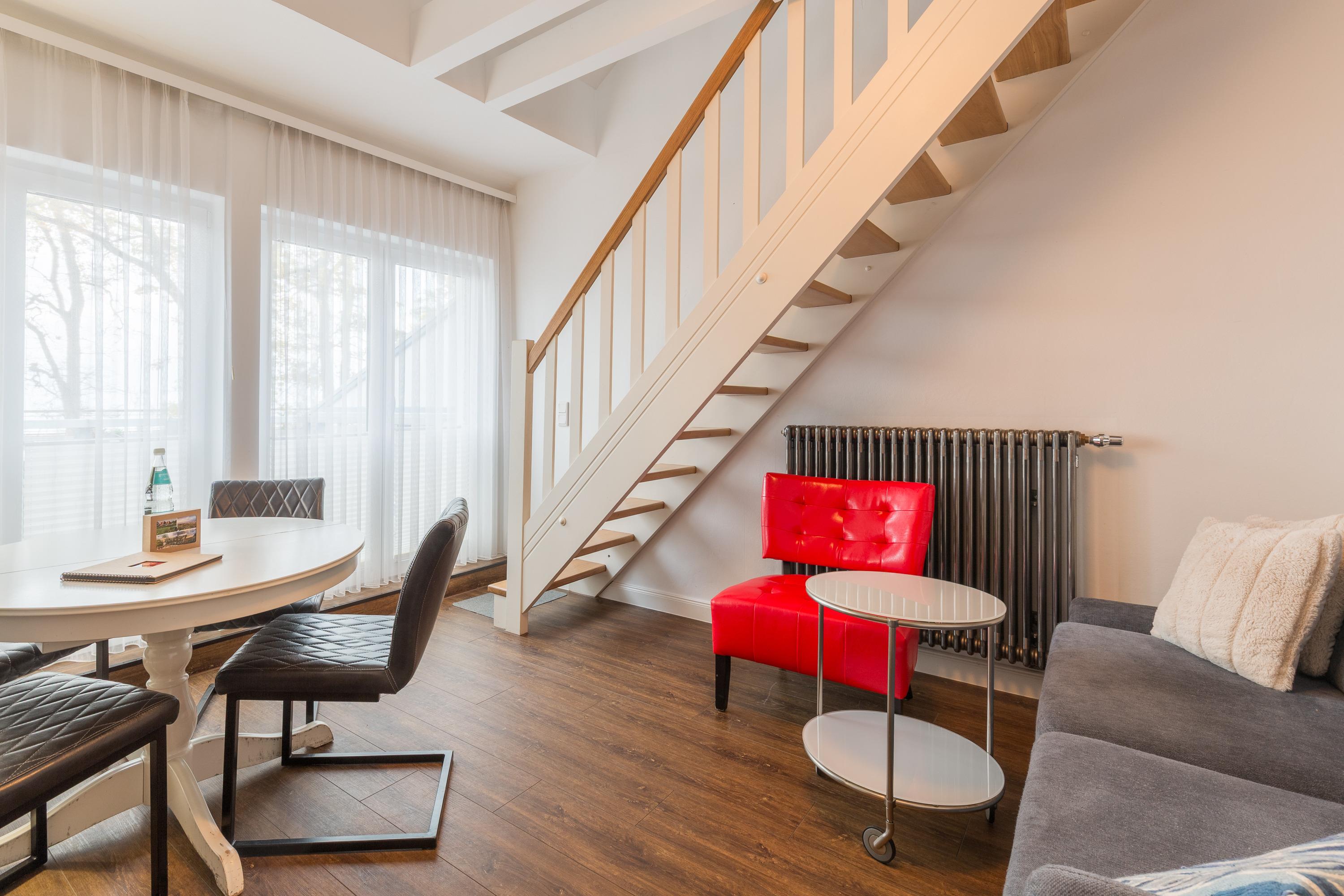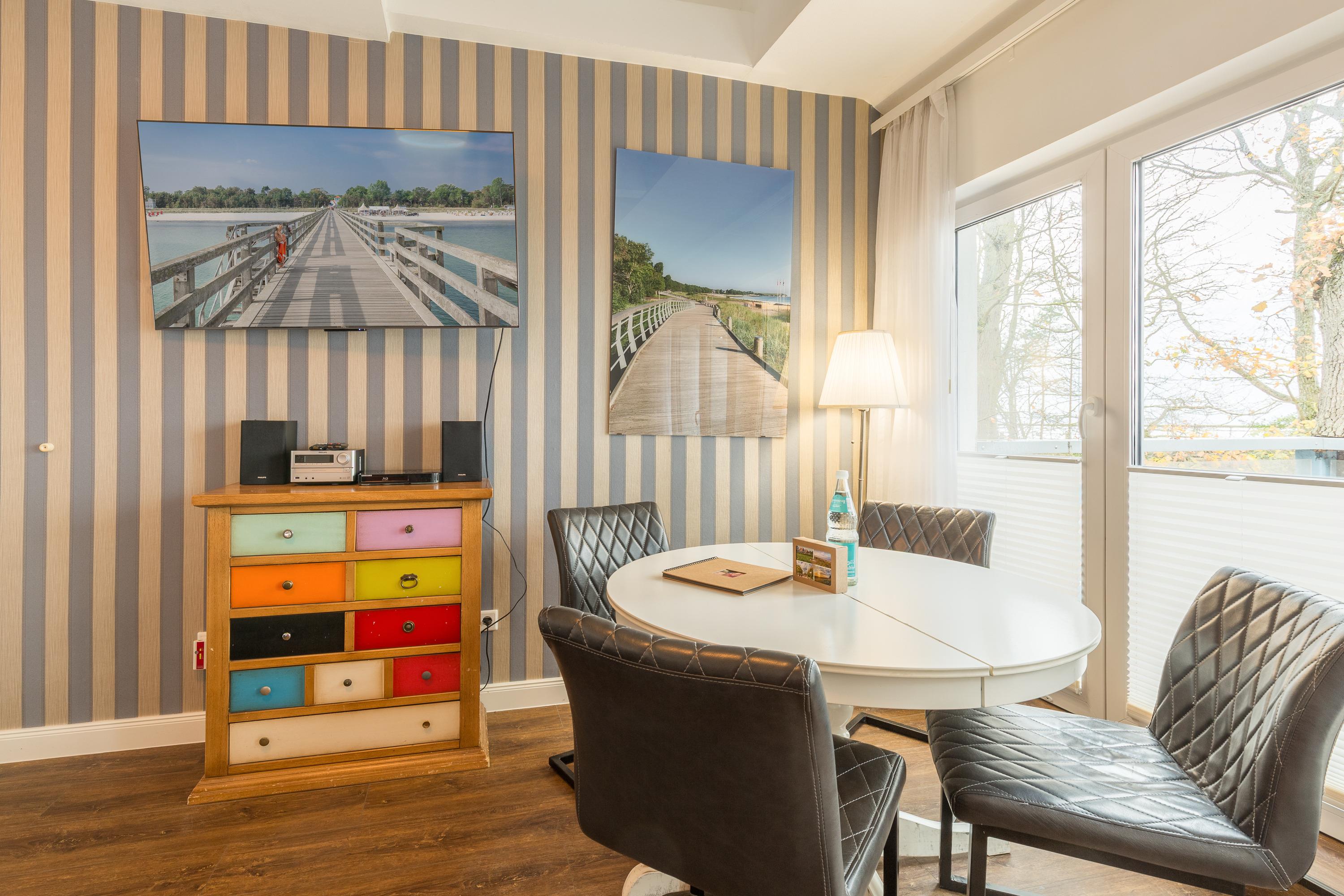 Der geräumige Schnitt der Wohnung erlaubt bis zu 4 Personen einen komfortablen Aufenthalt. Der Esstisch befindet sich im Wohnbereich. Strandurlaub. Komfort. Natur. Ruhe. Ostsee. Das Haus Strandhafer ist eine kleine Ostsee-Oase in allerbester Strandlage mit nur 4 Ferienwohnungen auf großzügigem Anwesen. Mit nur 30 m Entfernung zum Strandaufgang treffen Komfort des Hauses und bequemes Strandleben perfekt aufeinander.