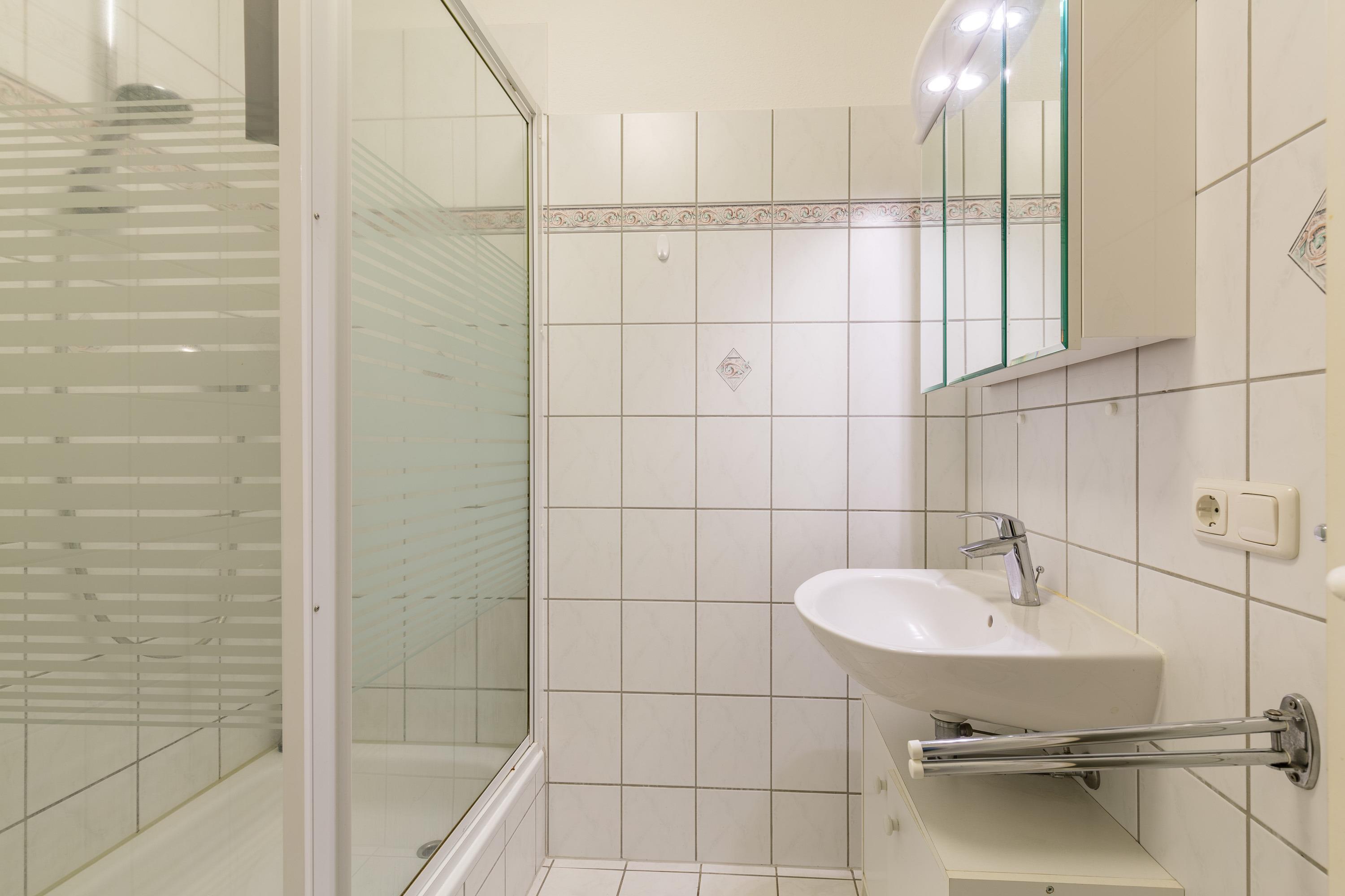 In der voll ausgestatteten Küchenzeile finden Sie einen Backofen mit Cerankochfeld, einen Geschirrspüler und einen Kühlschrank. Es gibt 1 Schlafzimmer mit einem Doppelbett (Liegefläche 180 cm x 200 cm). Im zweiten Schlafzimmer stehen 2 Einzelbetten . Auf dem Balkon ( Süd-Ostlage) stehen Balkonmöbel für 2 Personen bereit. Ihr Auto stellen Sie auf dem Außenstellplatz ab. Es gehört 1 Stellplatz zur Wohnung. Haustiere sind in dieser Wohnung nicht erlaubt.