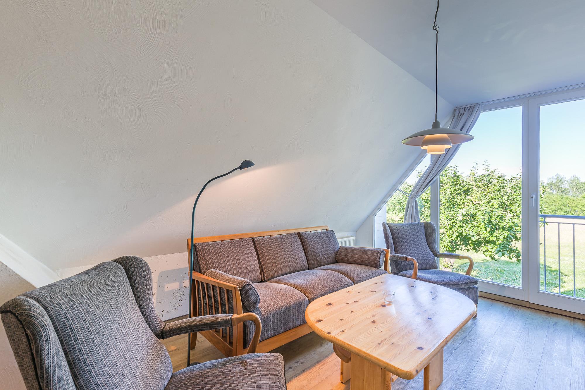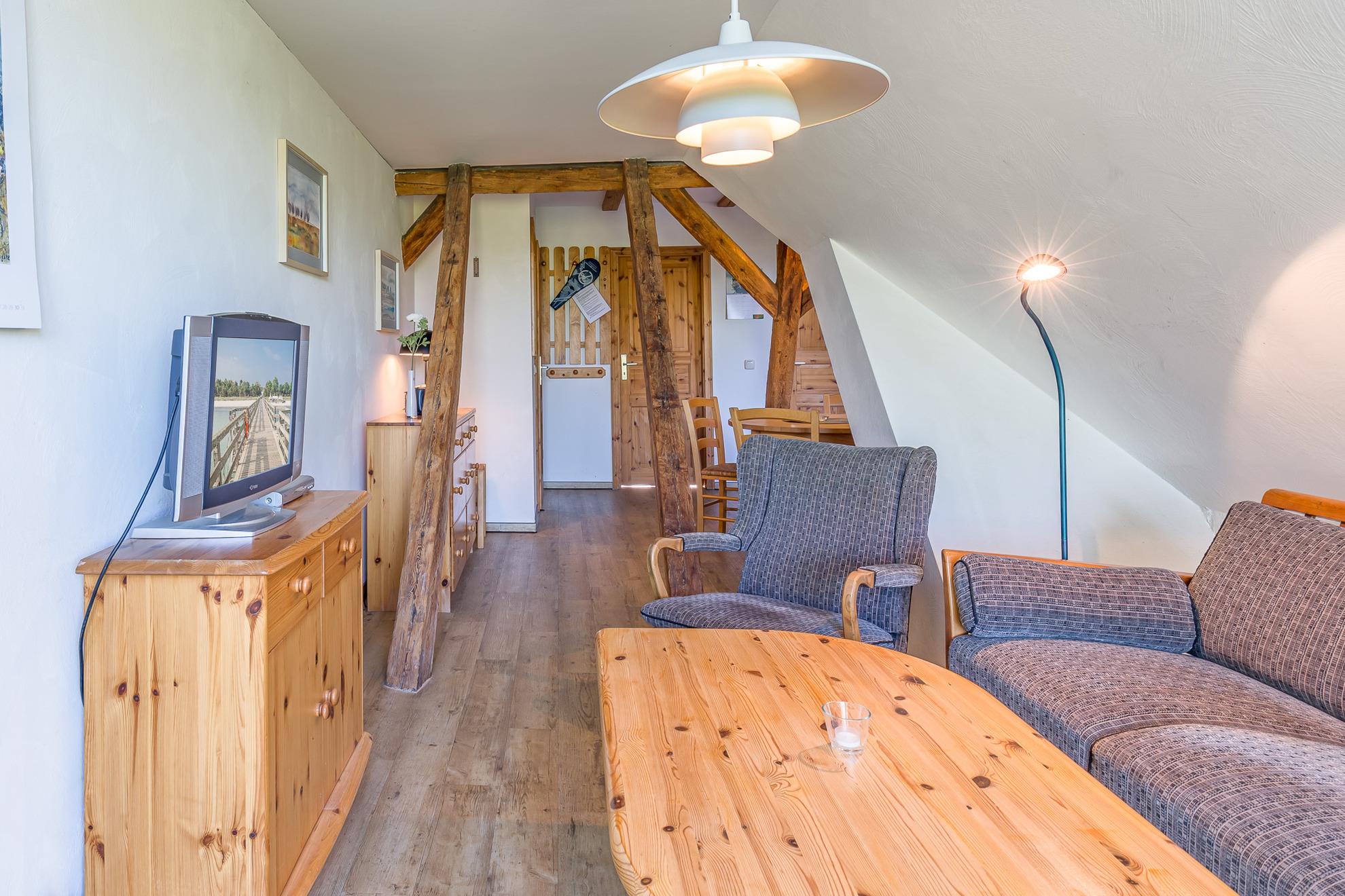 Der Wohnbereich der Wohnung liegt im Bereich des Ostgiebels, der bei guter Sicht den Blick auf die Ostsee frei gibt. Hier befindet sich auch das Satellitenfernsehgerät und ein Radio für die Unterhaltung.