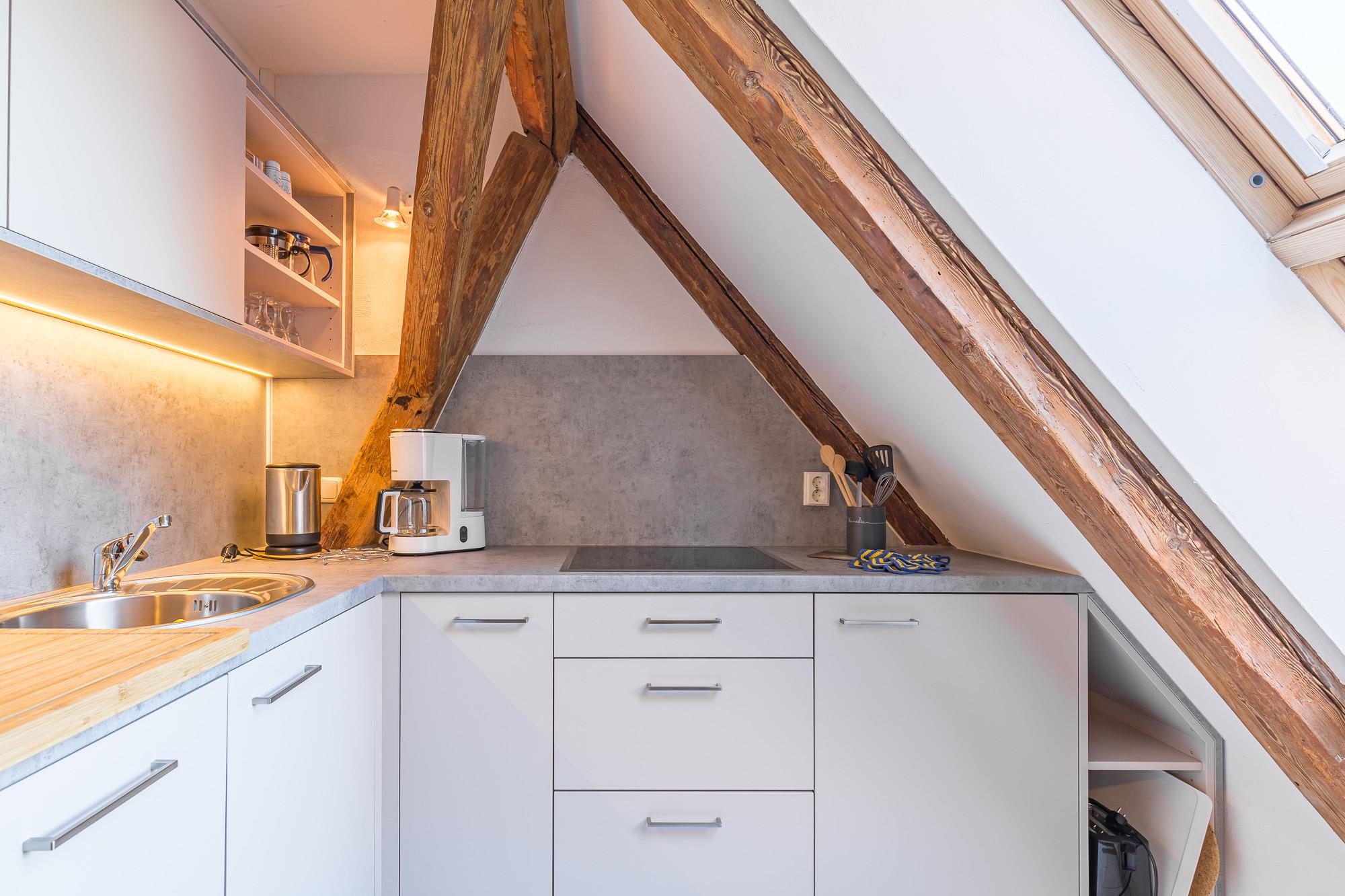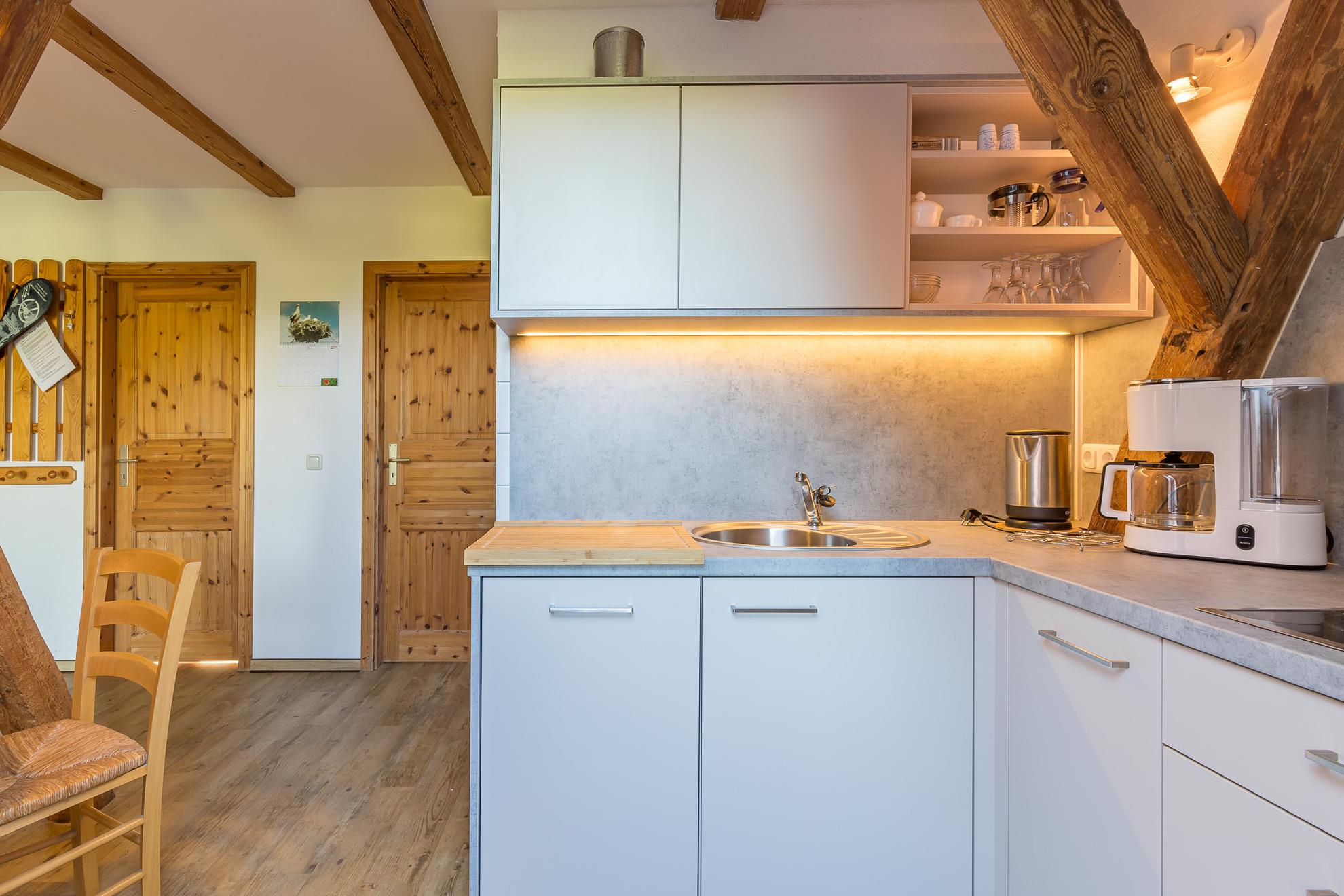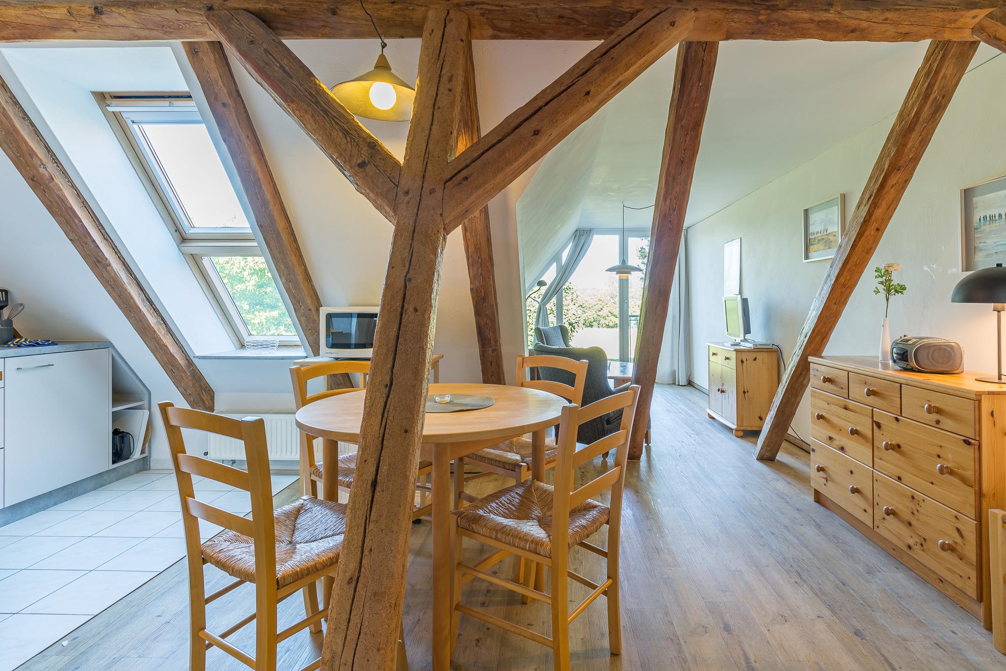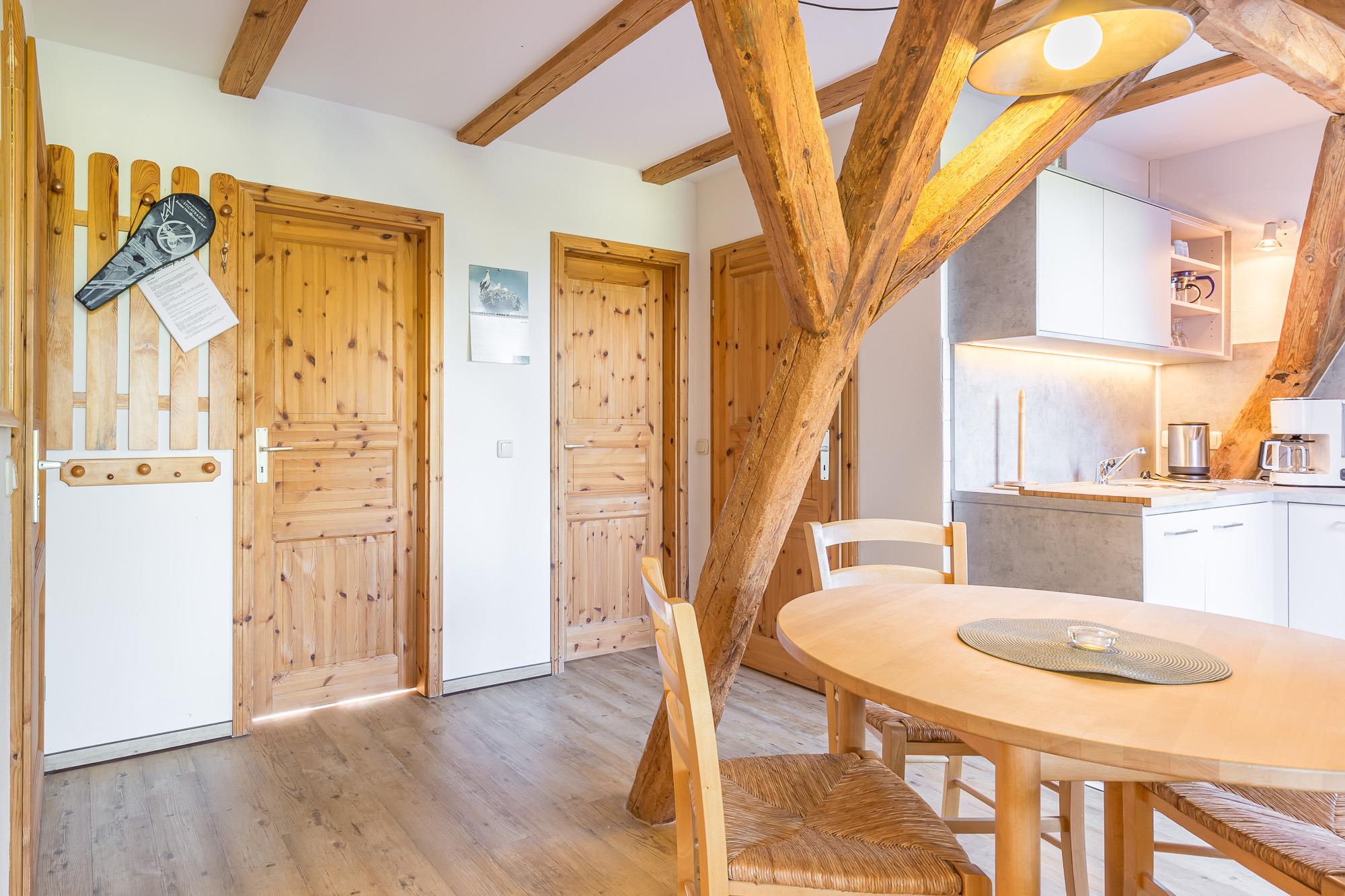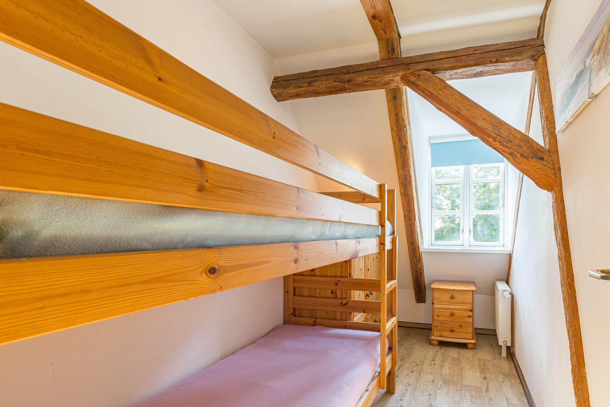 Die Wohnung 3 befindet sich im 1. Obergeschoss. Sie hat eine Größe von 48 m² und ist für bis zu 4 Personen geeignet. Die Wohnung besitzt zwei Schlafräume mit zwei Einzelbetten und einem Doppelstockbett. Die zum Wohnbereich offene Küche ist ausgestattet mit E-Herd (ohne Backofen), Kühlschrank mit Gefrierfach, Mikrowelle und Toaster.