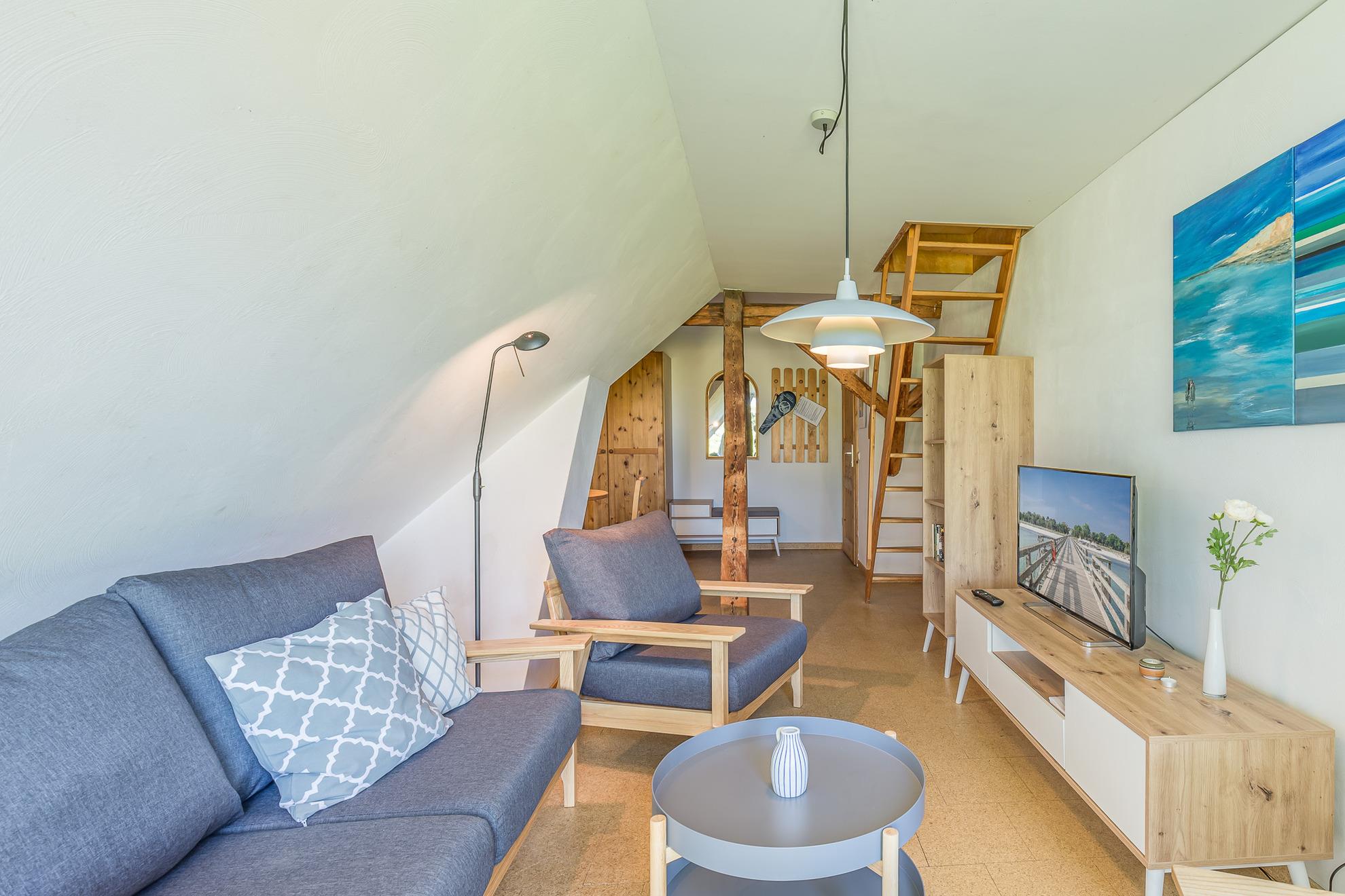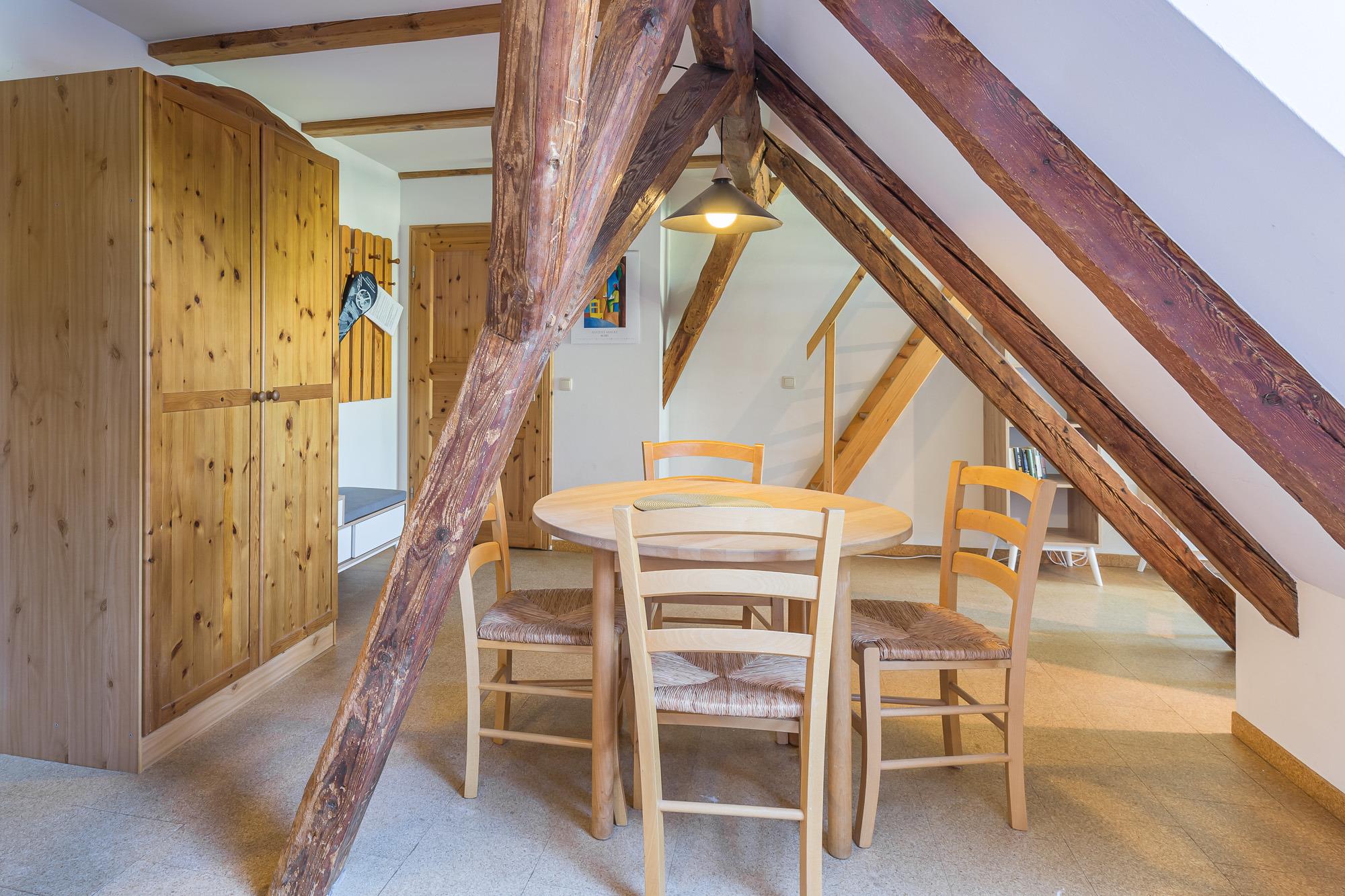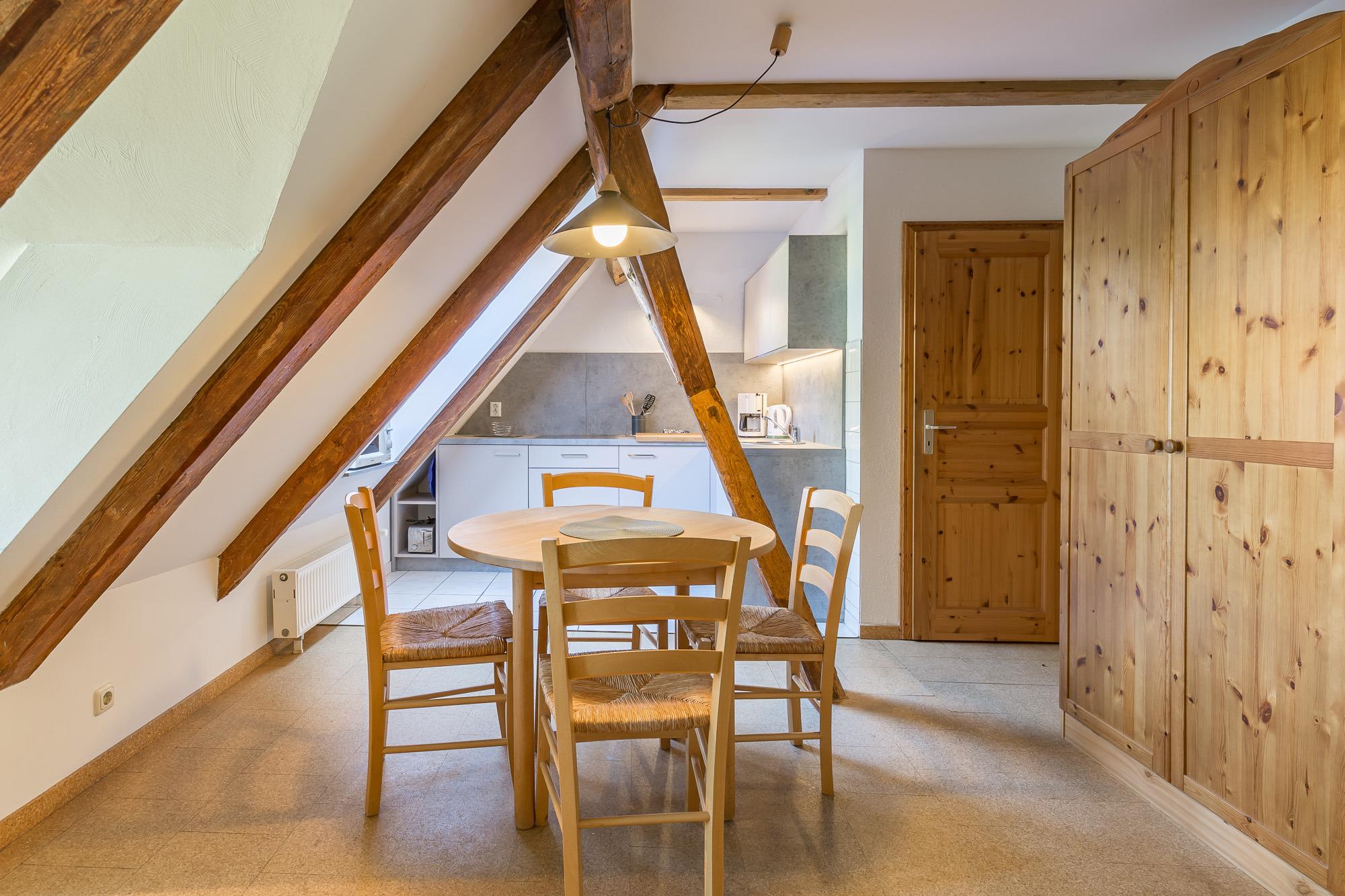 Die Wohnung 4 befindet sich im 1. Obergeschoss und ist mit seinen 52 m² Wohnfläche für maximal 3 Personen zugelassen. Ein Schlafzimmer mit Doppelbett und ein Spitzboden mit weiteren zwei Schlafmöglichkeiten und Seeblick ist über eine Leitertreppe erreichbar. Eine zum Wohnbereich offene Küche ist komplett mit E-Herd (ohne Backofen), Kühlschrank, Toaster und Mikrowelle mit Grillfunktion ausgestattet. Der Wohnbereich liegt im Bereich des Ostgiebels, von dem aus ein wunderschöner Blick auf die Ostsee zu genießen ist. Ein Radio und ein Satellitenfernsehgerät stehen zur Verfügung.