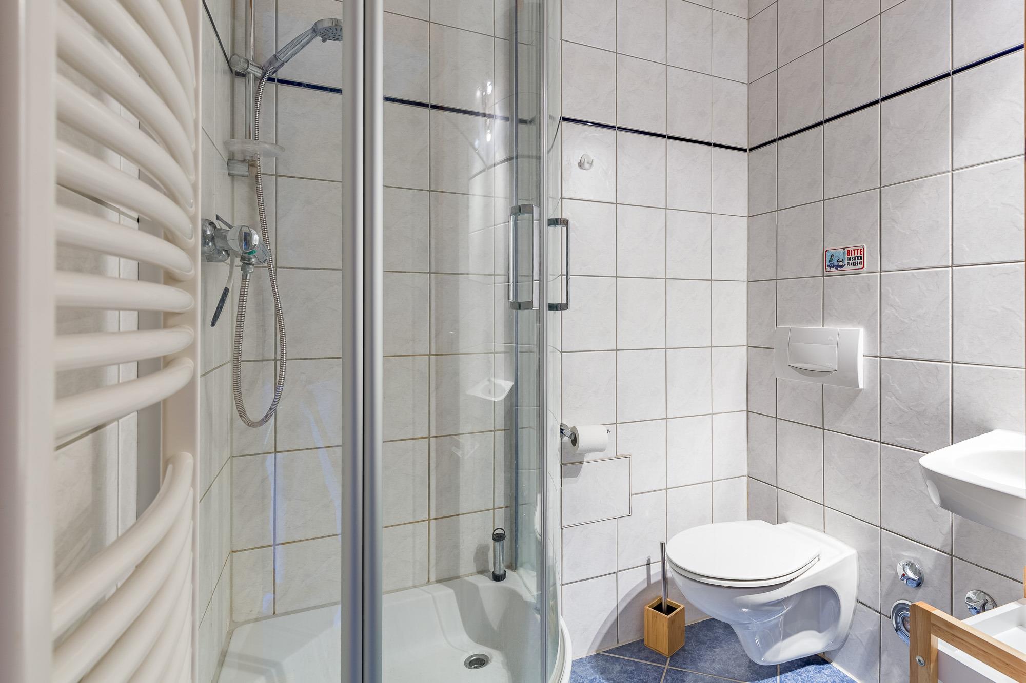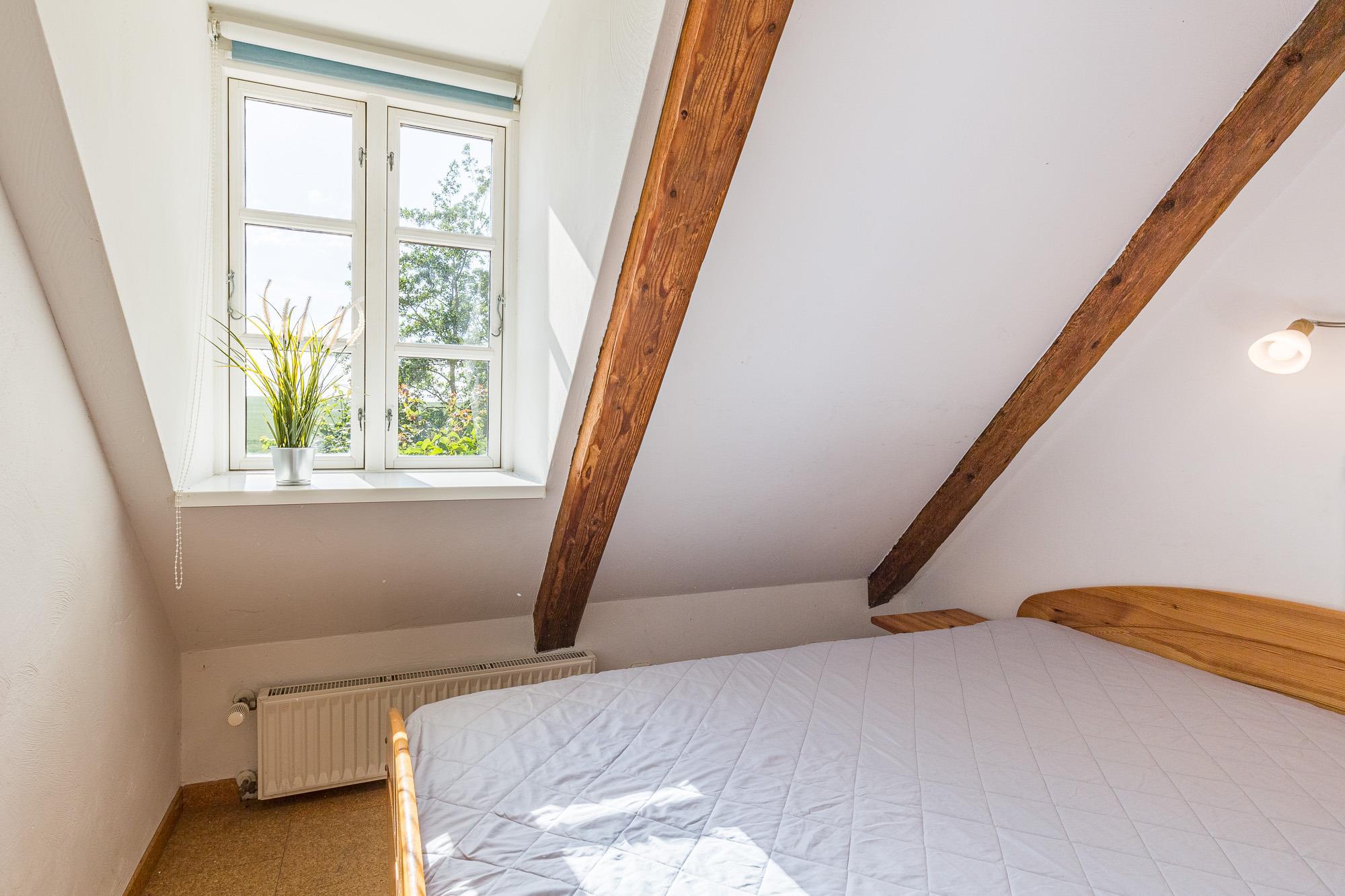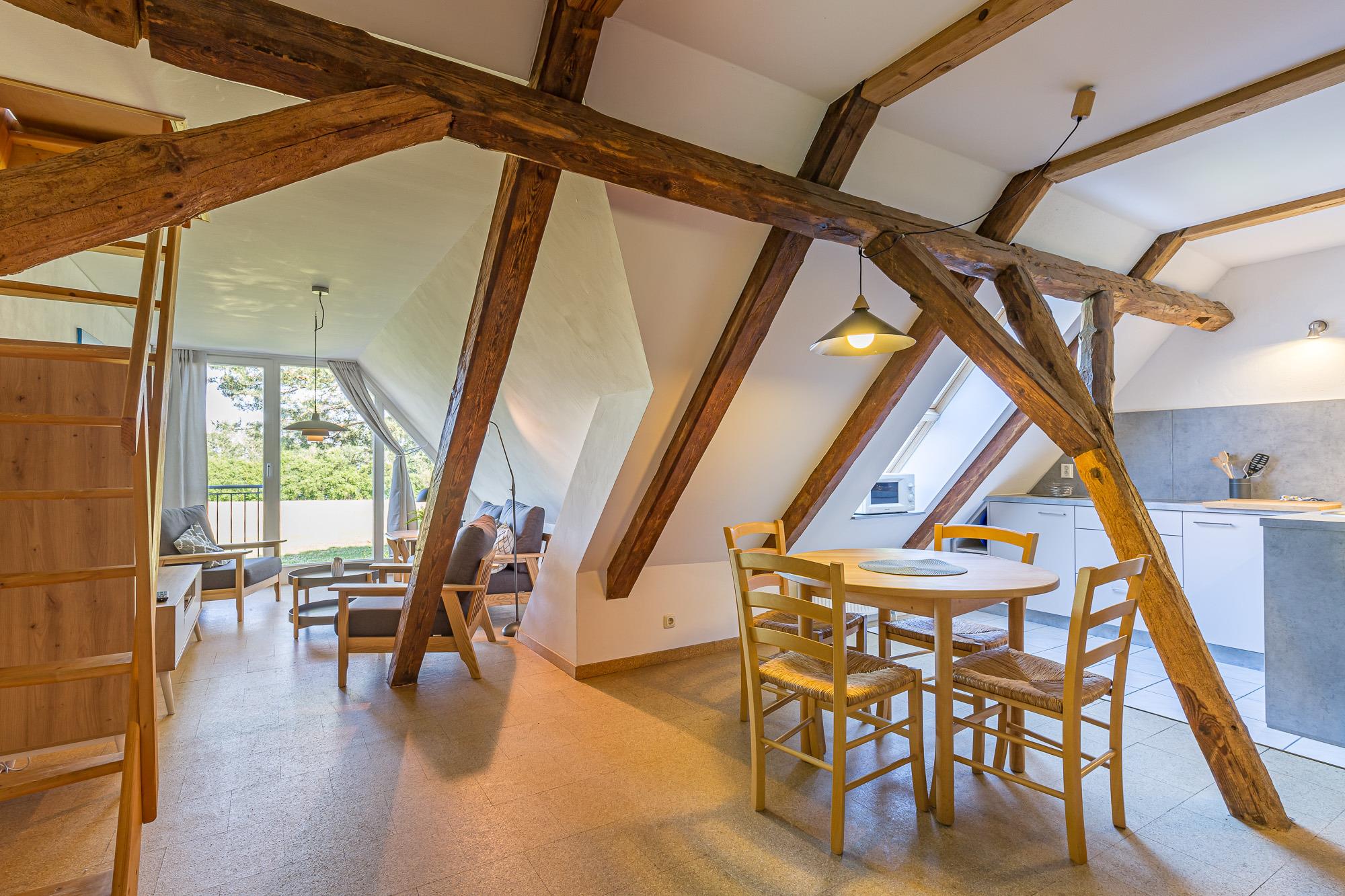 Die Wohnung 4 befindet sich im 1. Obergeschoss und ist mit seinen 52 m² Wohnfläche für maximal 3 Personen zugelassen. Ein Schlafzimmer mit Doppelbett und ein Spitzboden mit weiteren zwei Schlafmöglichkeiten und Seeblick ist über eine Leitertreppe erreichbar. Eine zum Wohnbereich offene Küche ist komplett mit E-Herd (ohne Backofen), Kühlschrank, Toaster und Mikrowelle mit Grillfunktion ausgestattet. Der Wohnbereich liegt im Bereich des Ostgiebels, von dem aus ein wunderschöner Blick auf die Ostsee zu genießen ist. Ein Radio und ein Satellitenfernsehgerät stehen zur Verfügung.