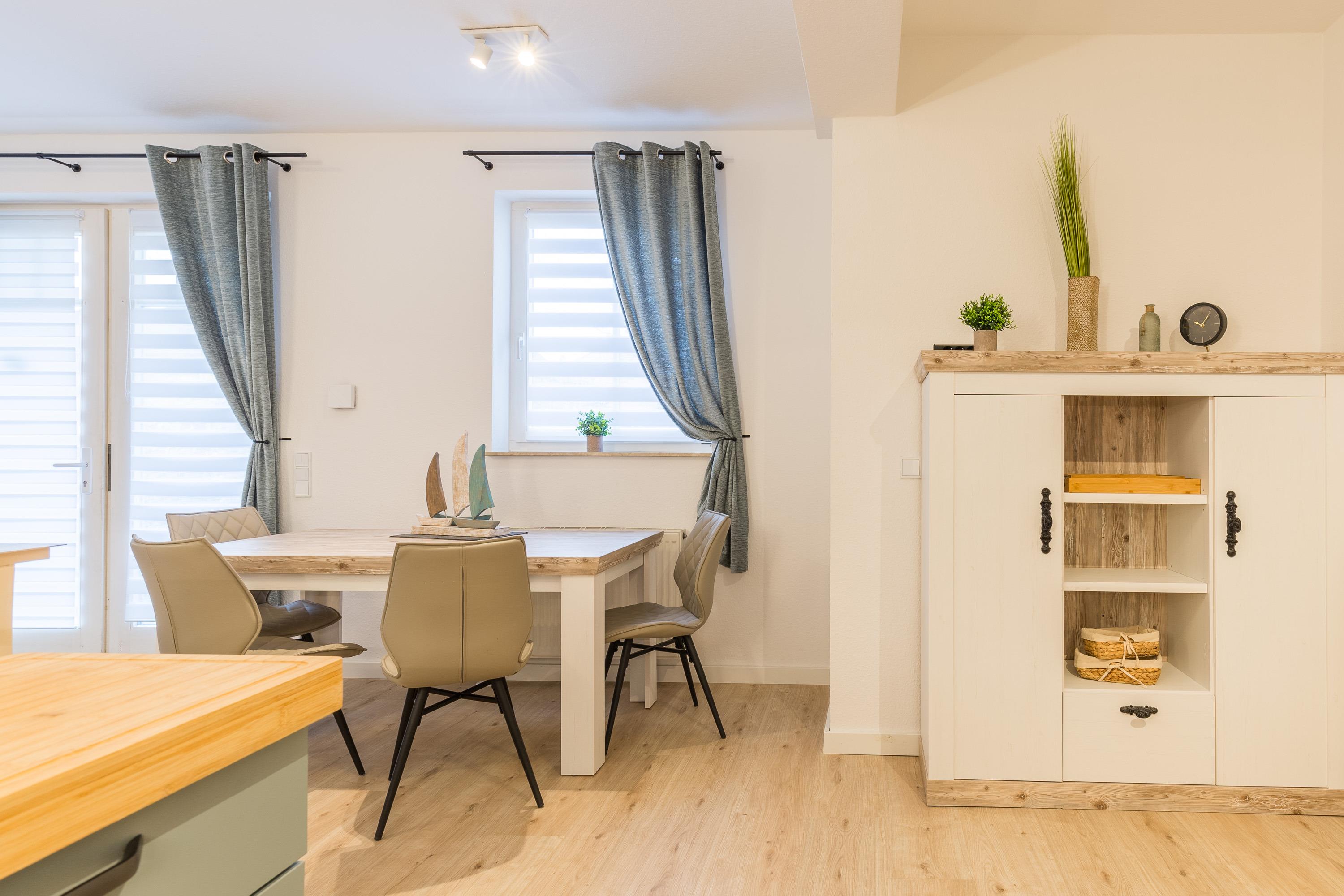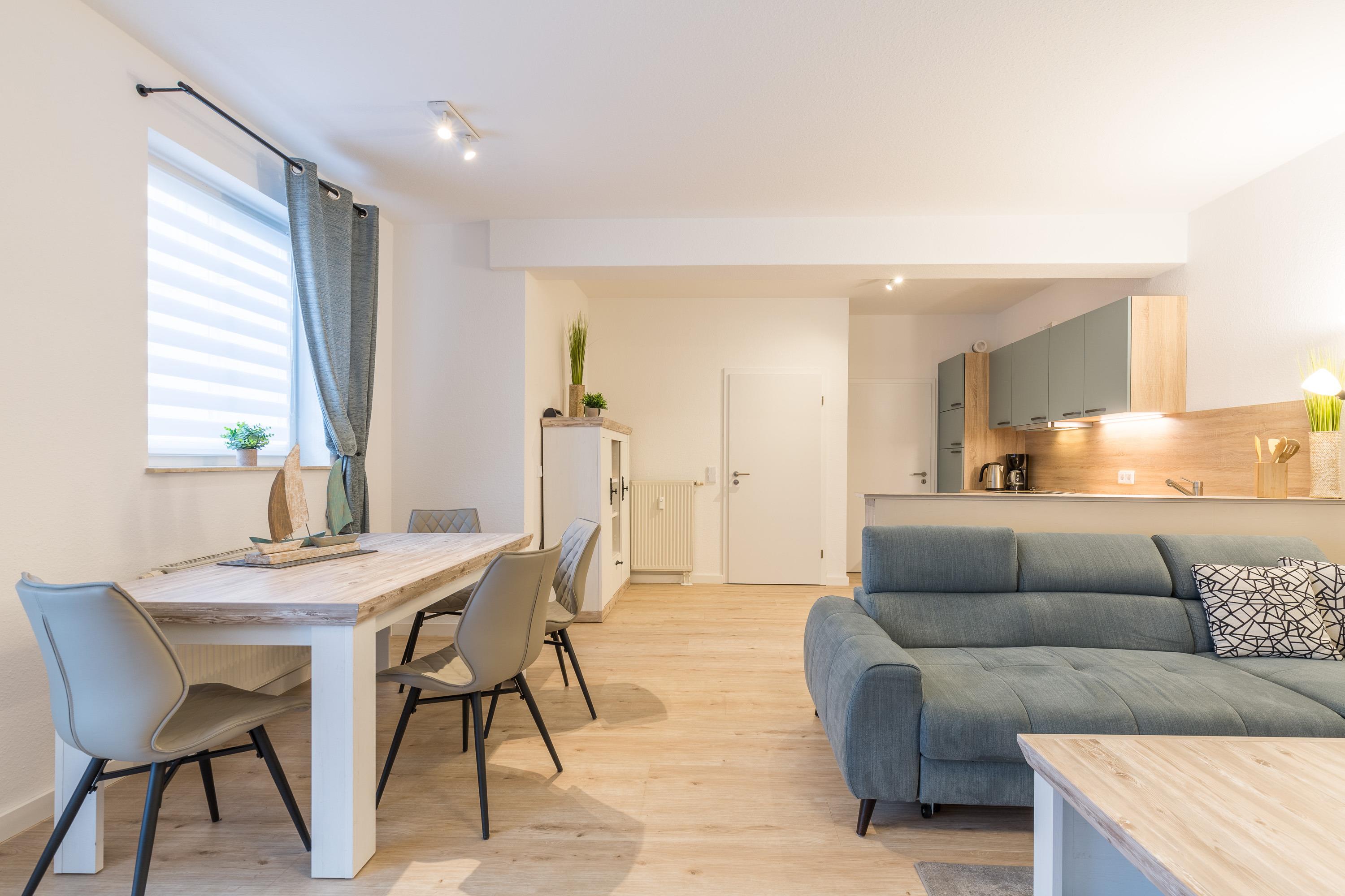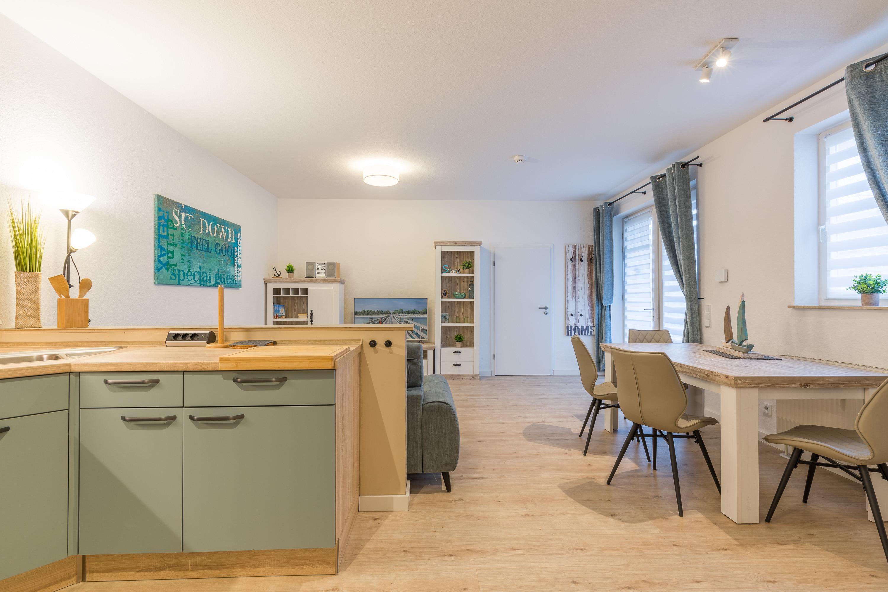 Das Schlafzimmer und das Duschbad mit bodengleicher Dusche haben eine großzügige Raumgröße. Im großen Wohnbereich befinden sich Essbereich und die moderne Einbauküche. Sie ist offen gestaltet und bietet einen schönen Blick in den angrenzenden Wohnraum. Der Geschirrspüler hilft beim Abwasch. Filter-Kaffeemaschine, Wasserkocher und Toaster zählen zur Grundausstattung in unseren Ferienwohnungen.