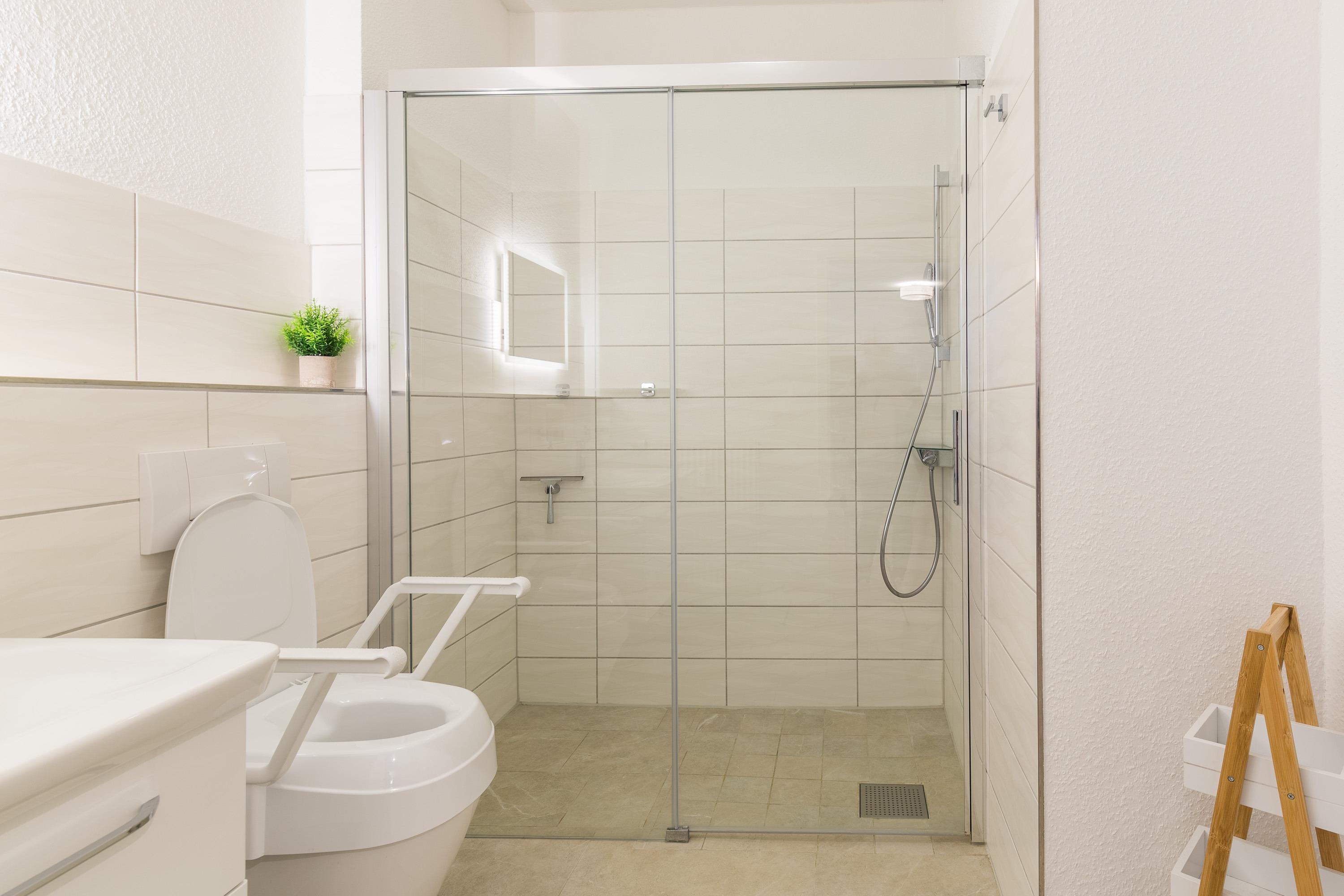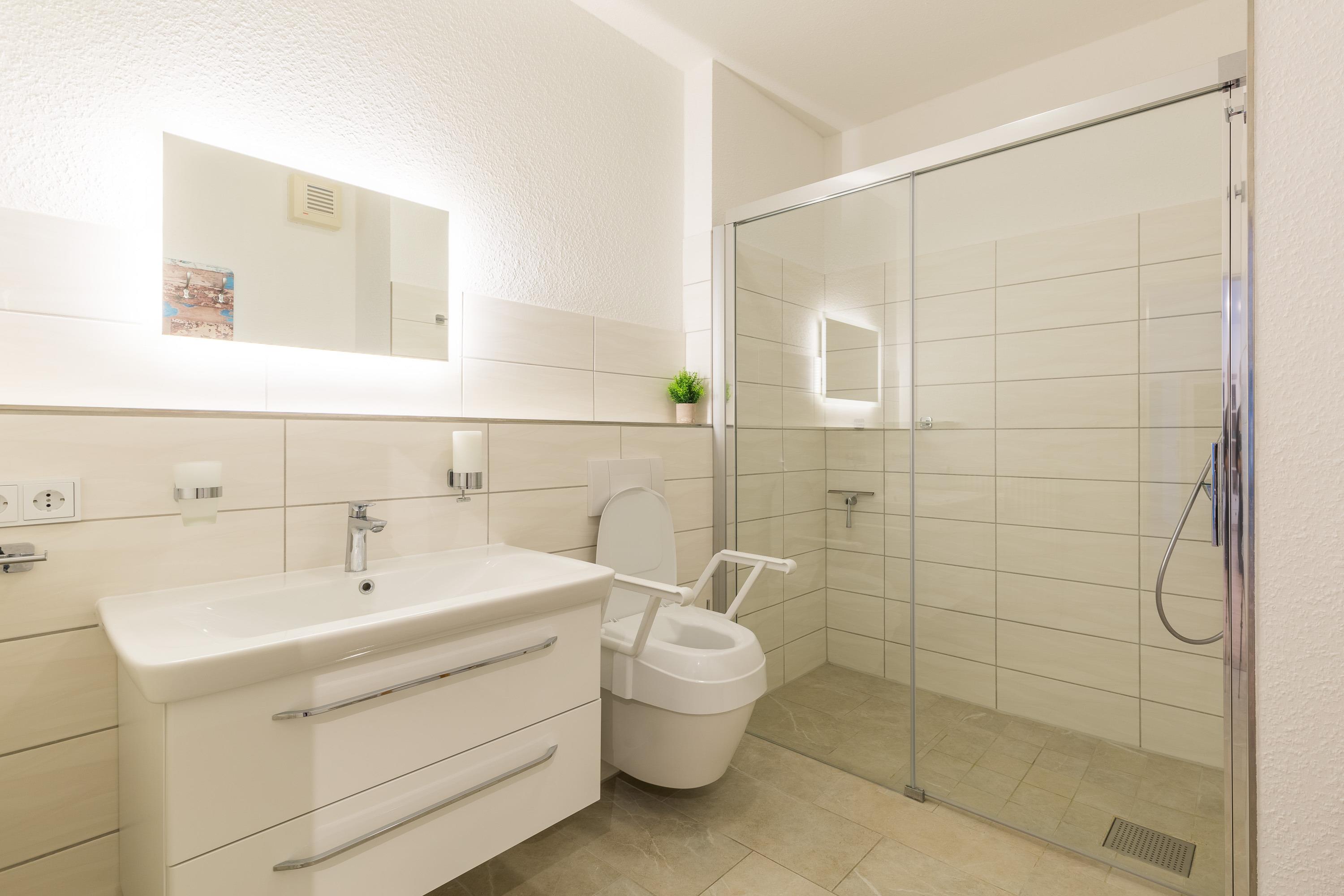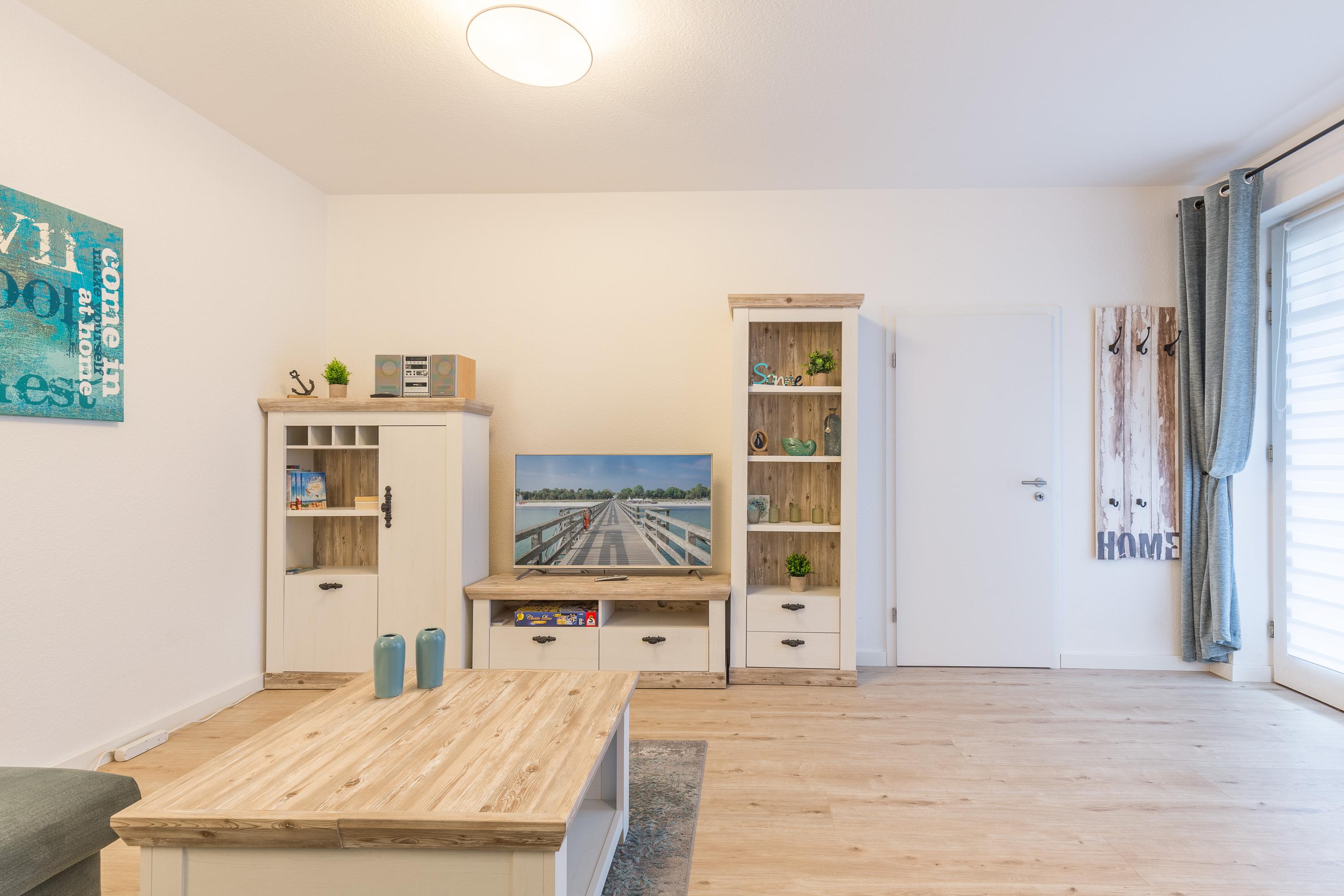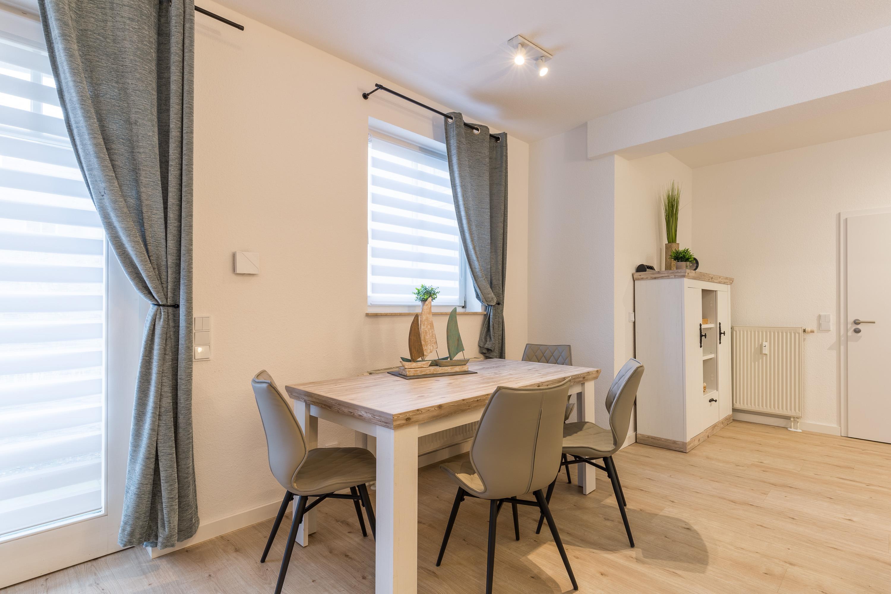Das Schlafzimmer und das Duschbad mit bodengleicher Dusche haben eine großzügige Raumgröße. Im großen Wohnbereich befinden sich Essbereich und die moderne Einbauküche. Sie ist offen gestaltet und bietet einen schönen Blick in den angrenzenden Wohnraum. Der Geschirrspüler hilft beim Abwasch. Filter-Kaffeemaschine, Wasserkocher und Toaster zählen zur Grundausstattung in unseren Ferienwohnungen.