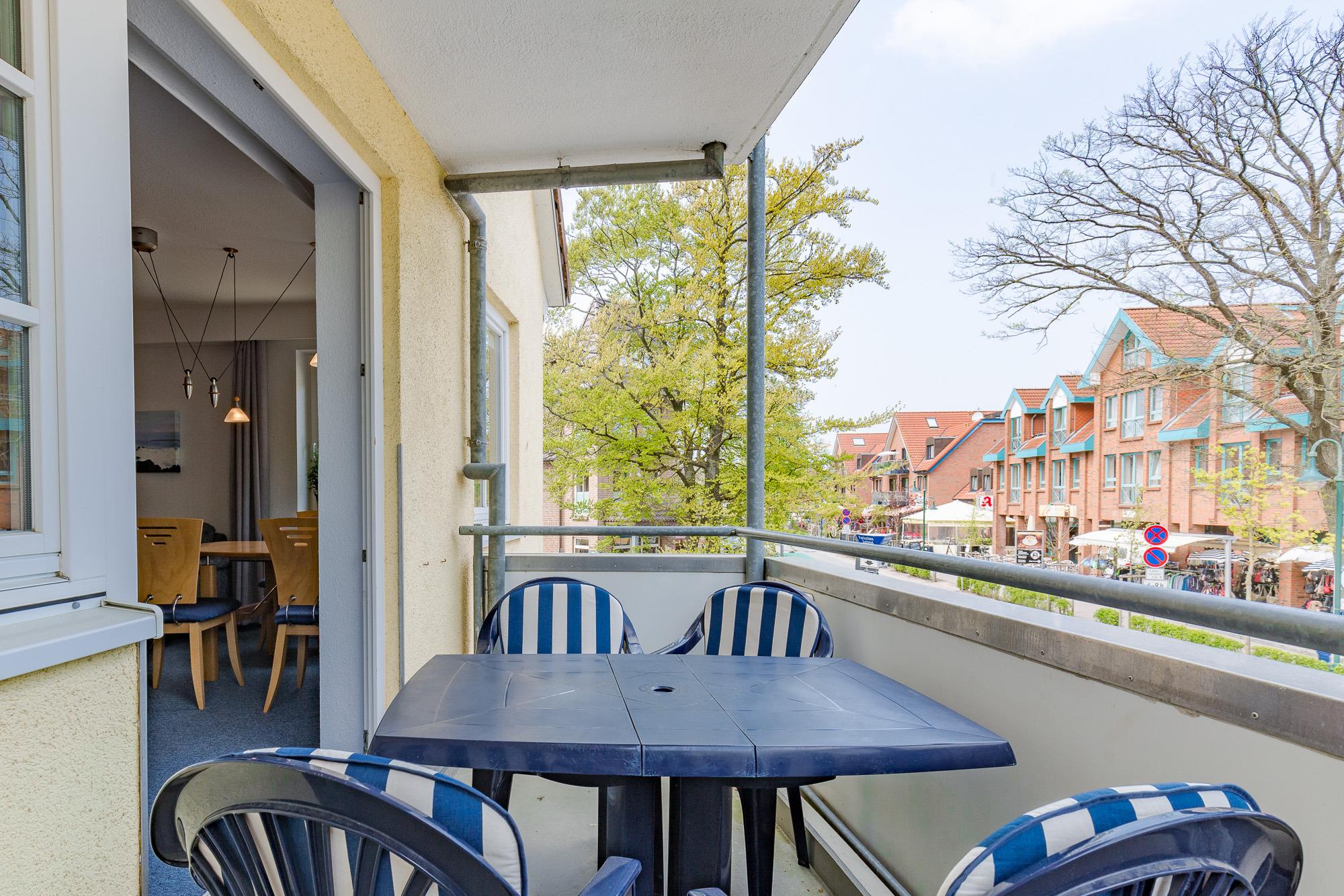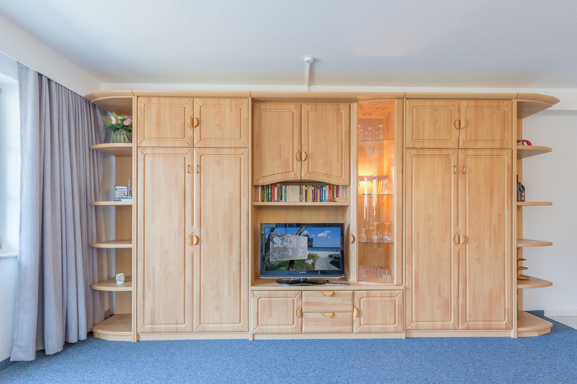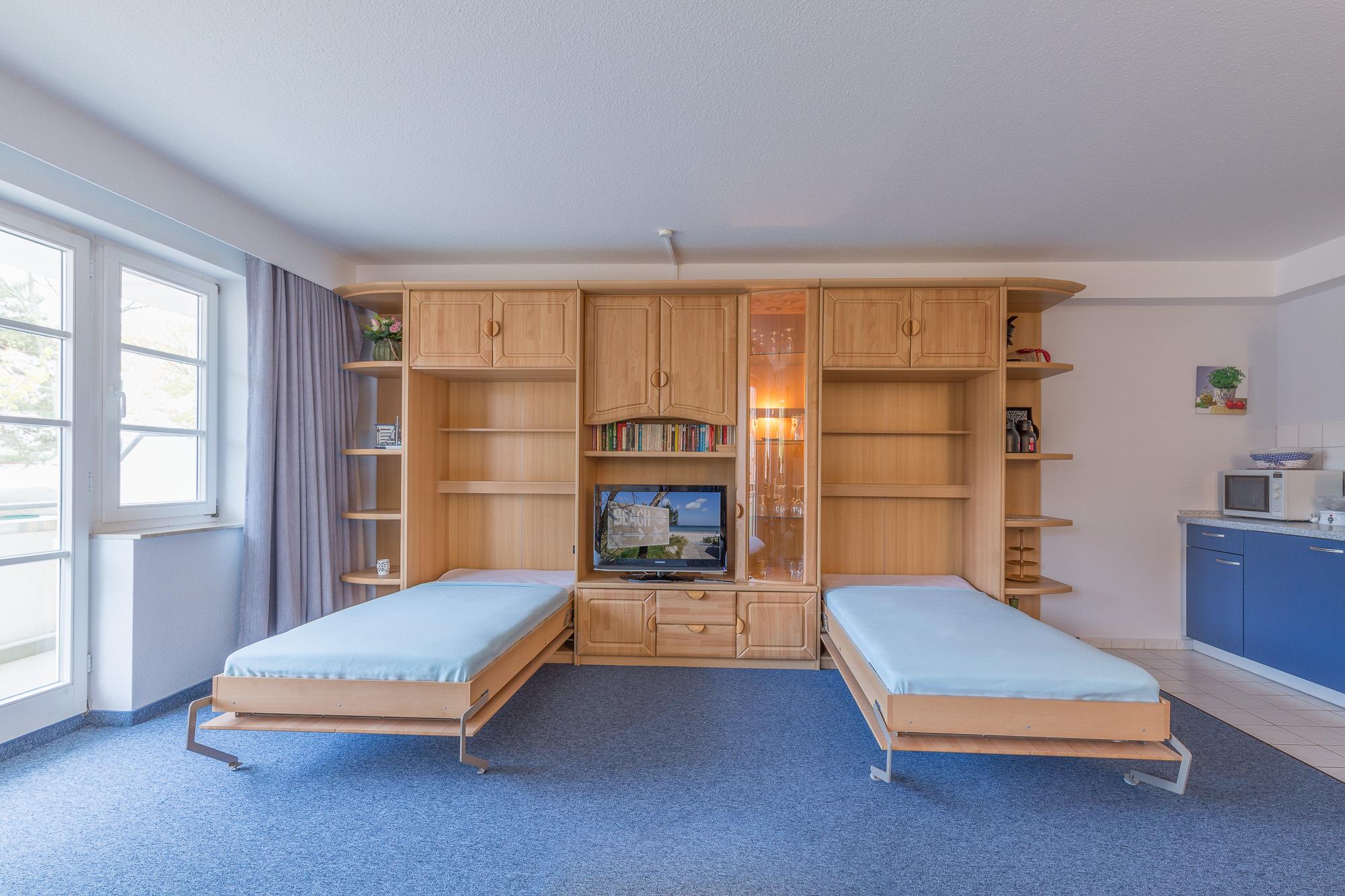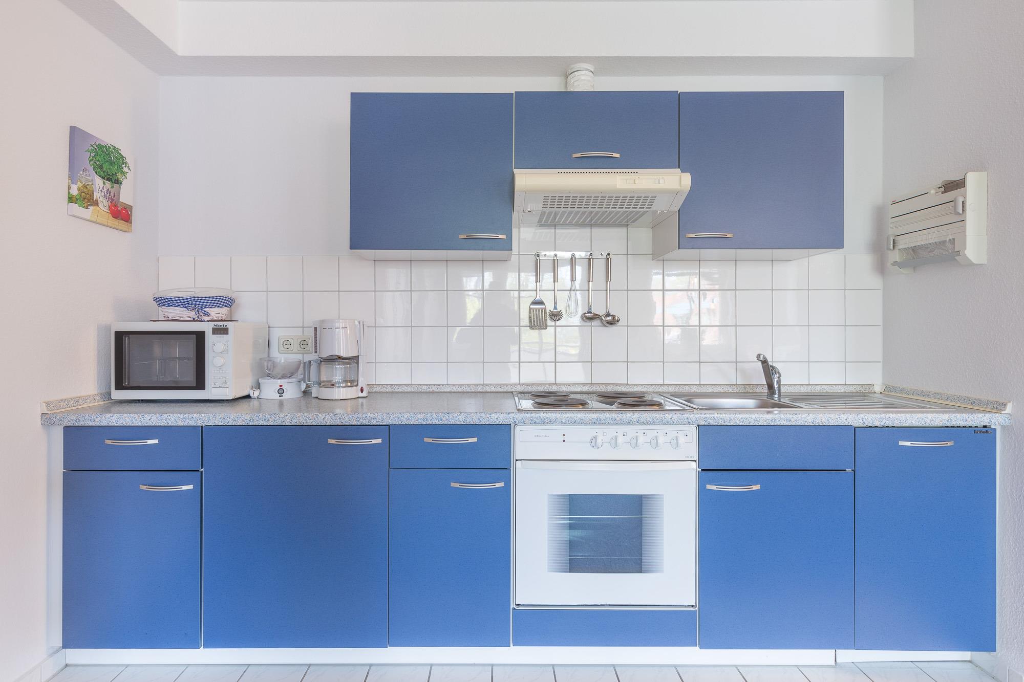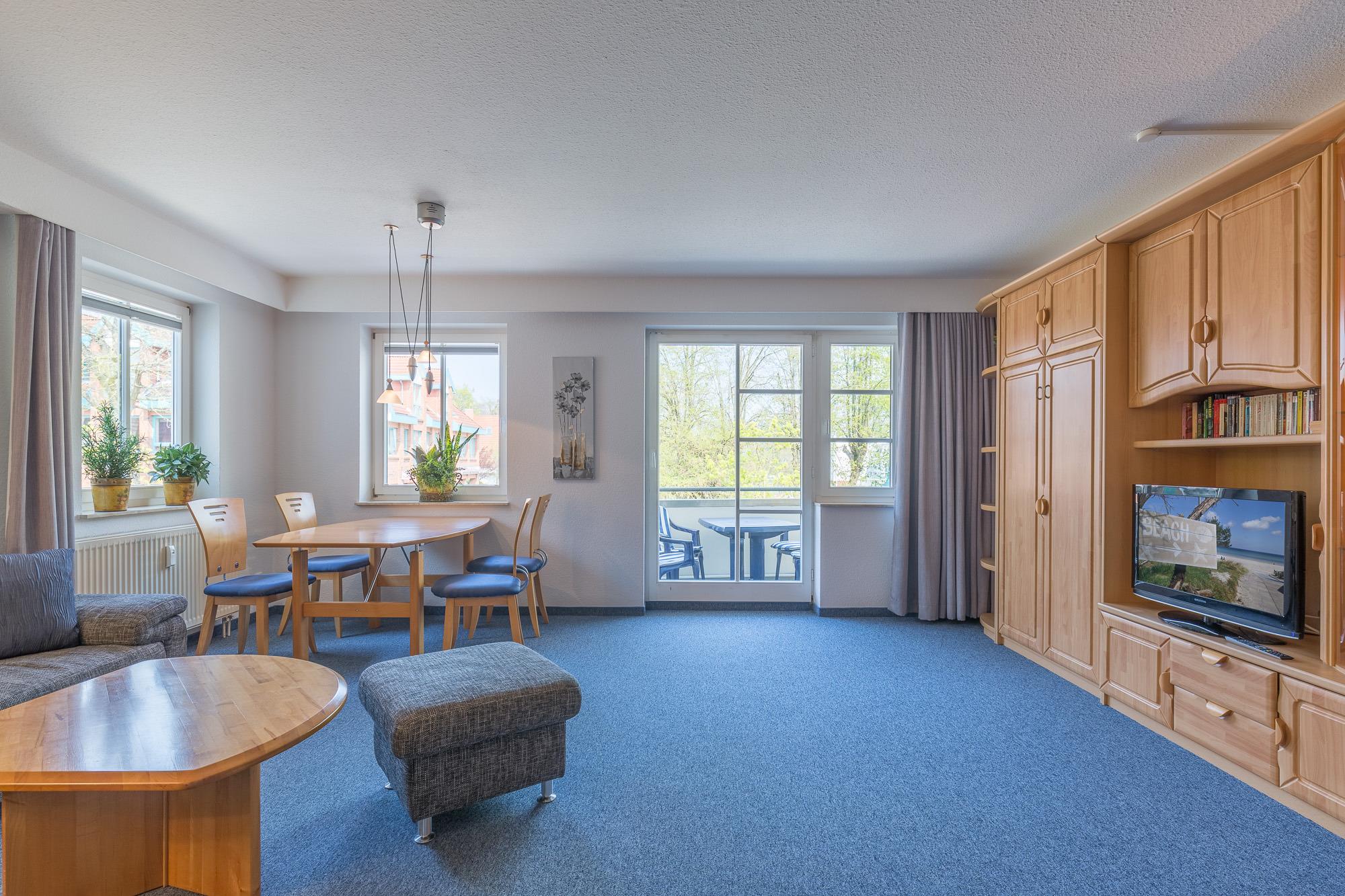 Die Ferienwohnung befindet sich im 1. Obergeschoss mit einem großzügigen Balkon, der nördlich in Richtung Ostsee ausgerichtet ist. Ein Doppelbett (180 x 200 cm) im Schlafzimmer und zwei bequemem einzelne Schrankbetten befinden sich im weitläufigen Wohnzimmer mit moderner Küchenzeile. Sie ist ausgestattet mit einem 4-Plattenherd mit Backofen, Abzugshaube, Geschirrspüler, Kühlschrank und Mikrowelle.