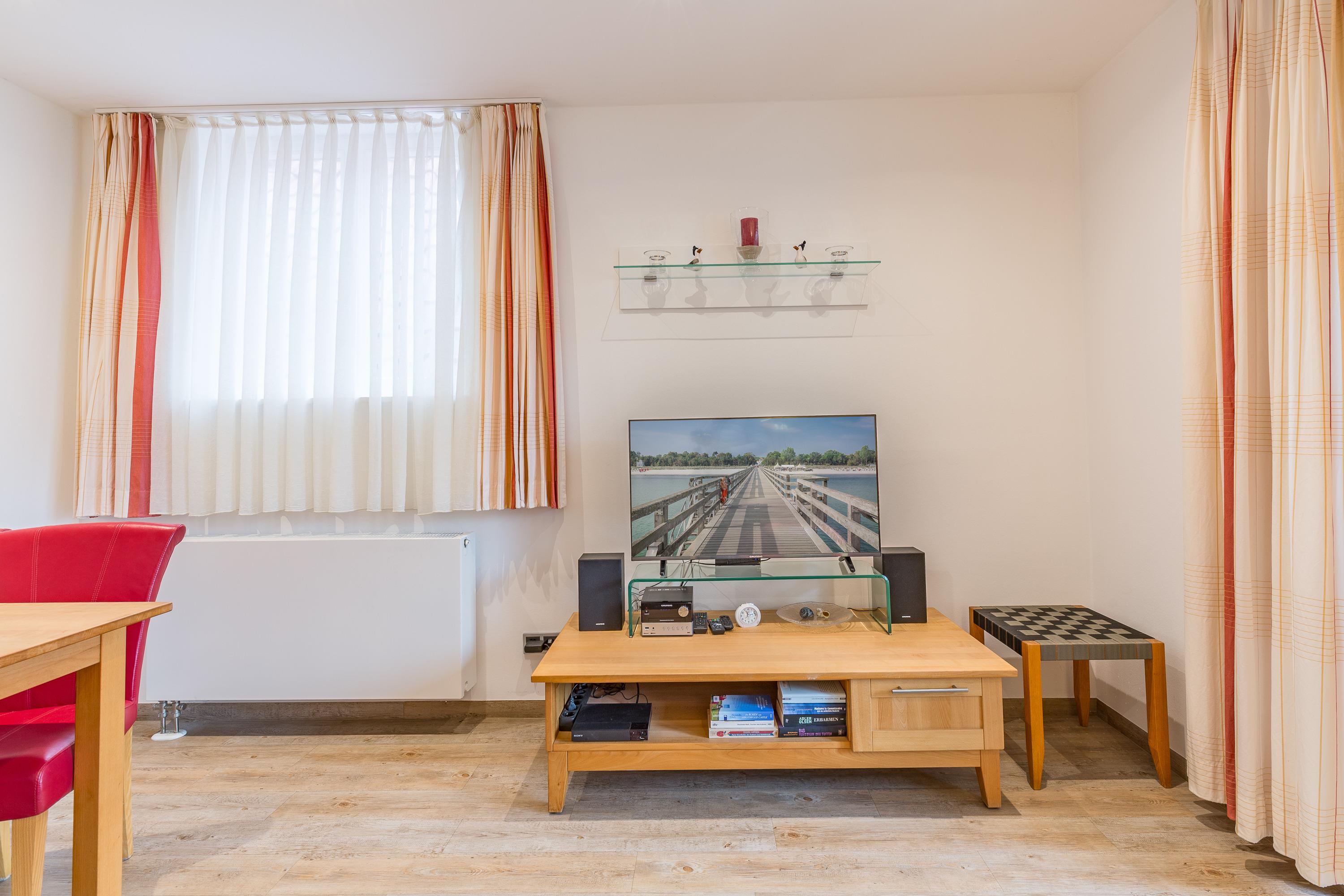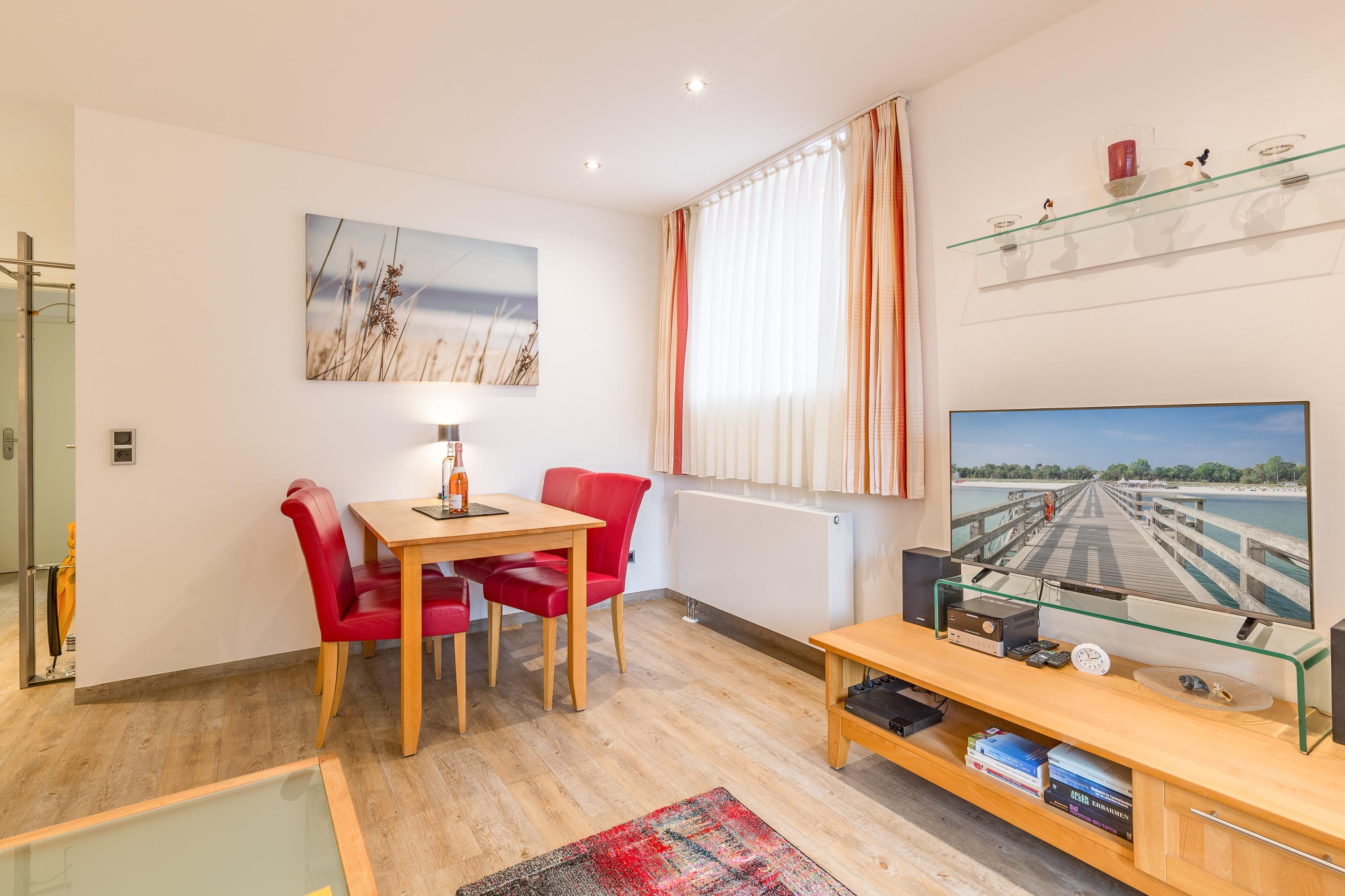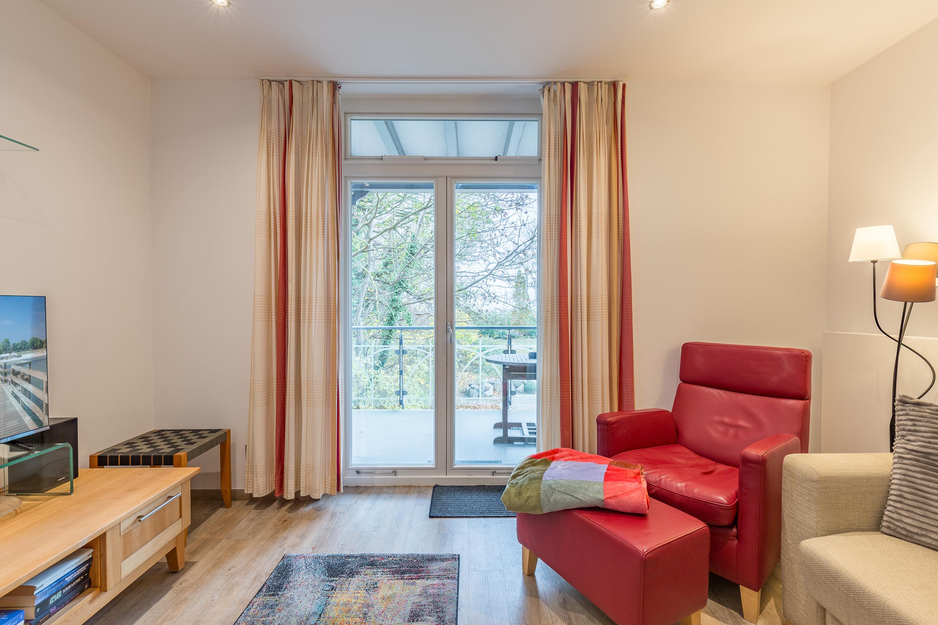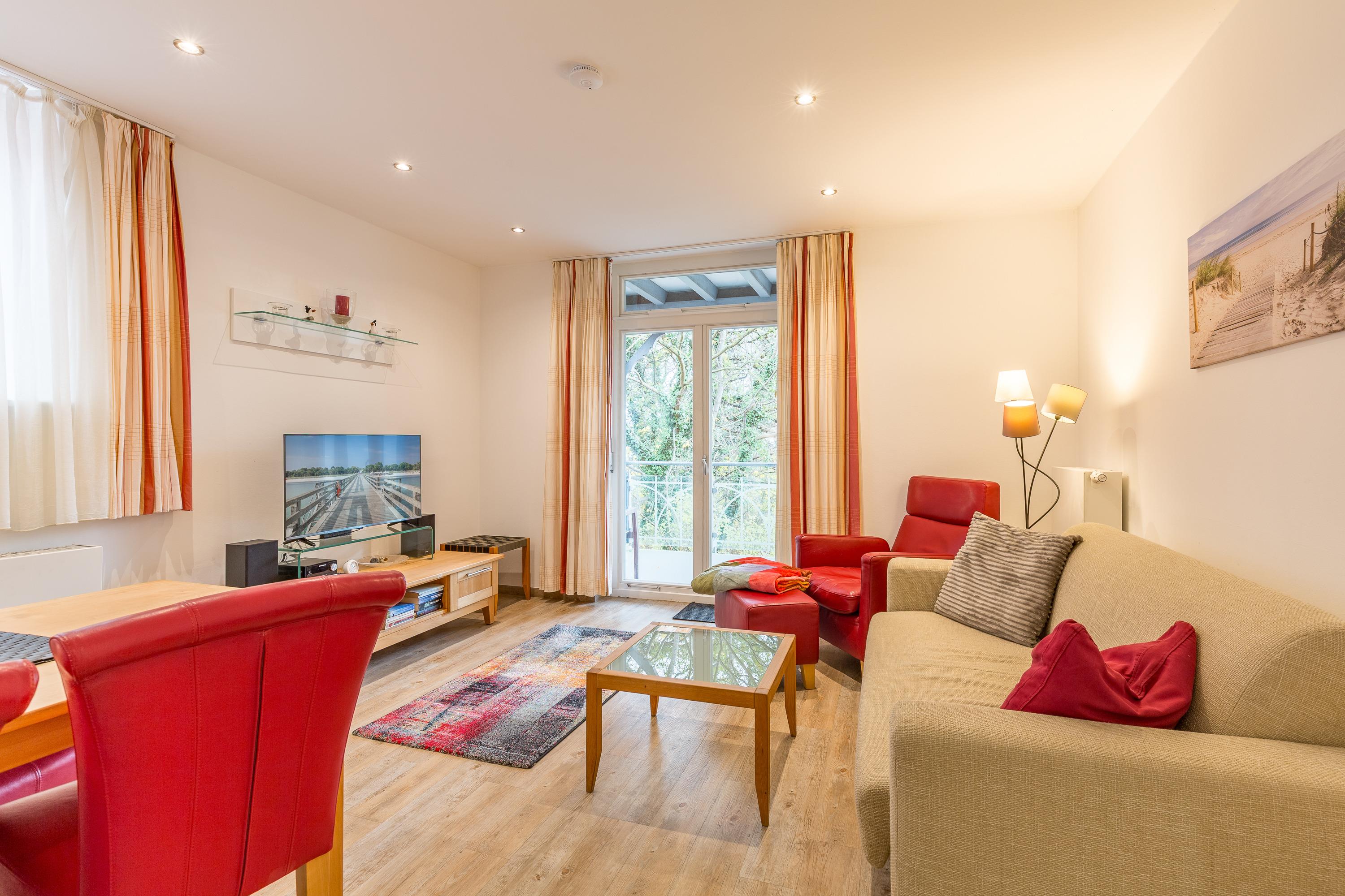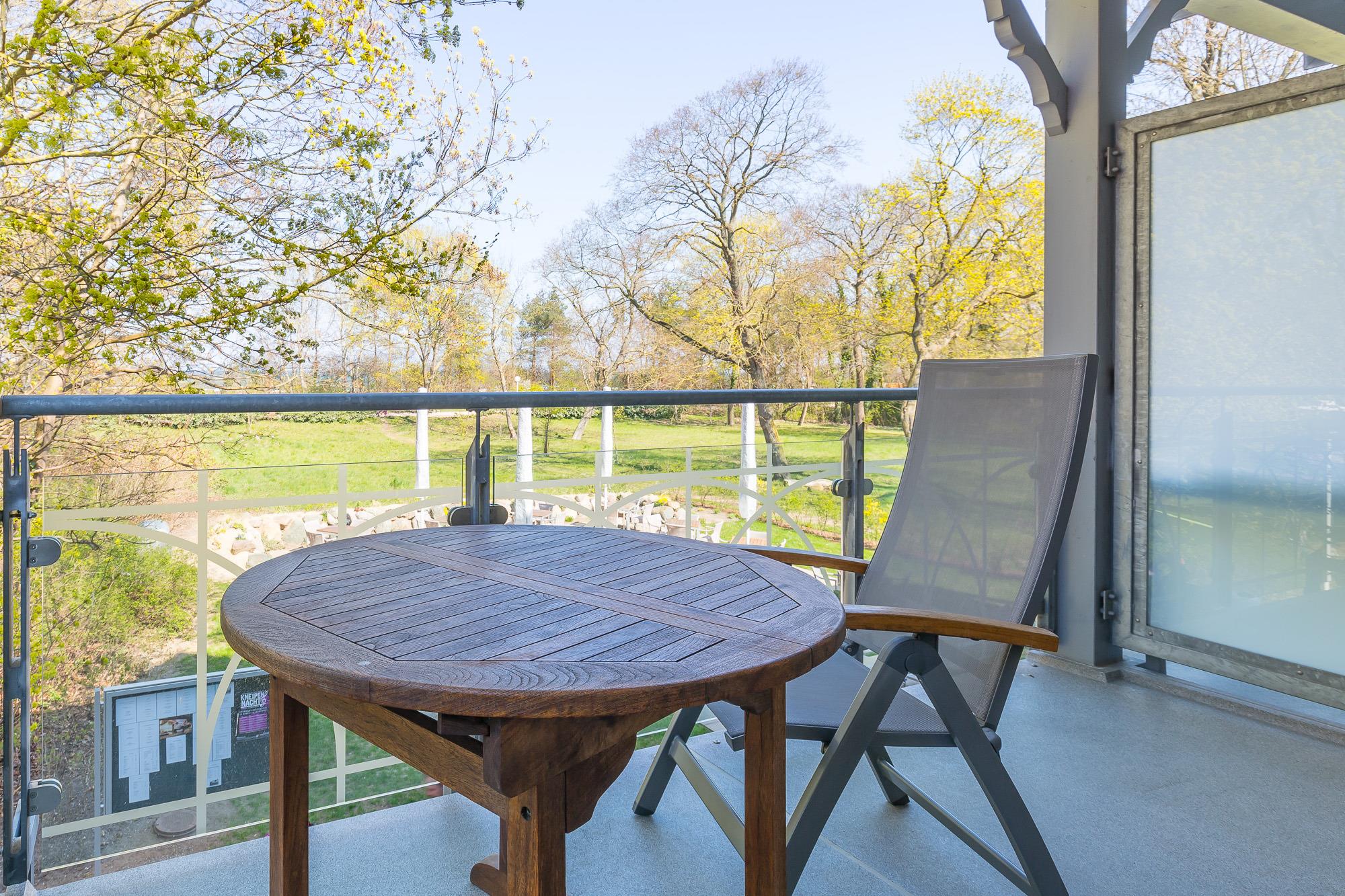 Das Wohnzimmer bietet Ihnen einen offenen und freundlichen Blick über die Gartenanlage in Richtung Ostsee. Der großzügige Balkon ist nur eines der vielen Highlights Ihres Appartements.