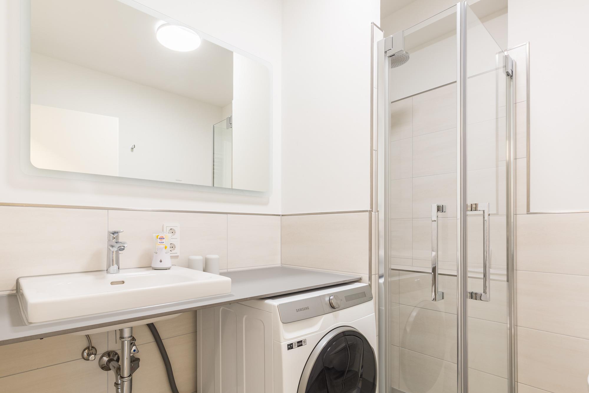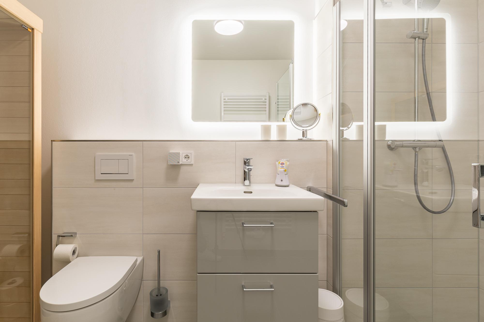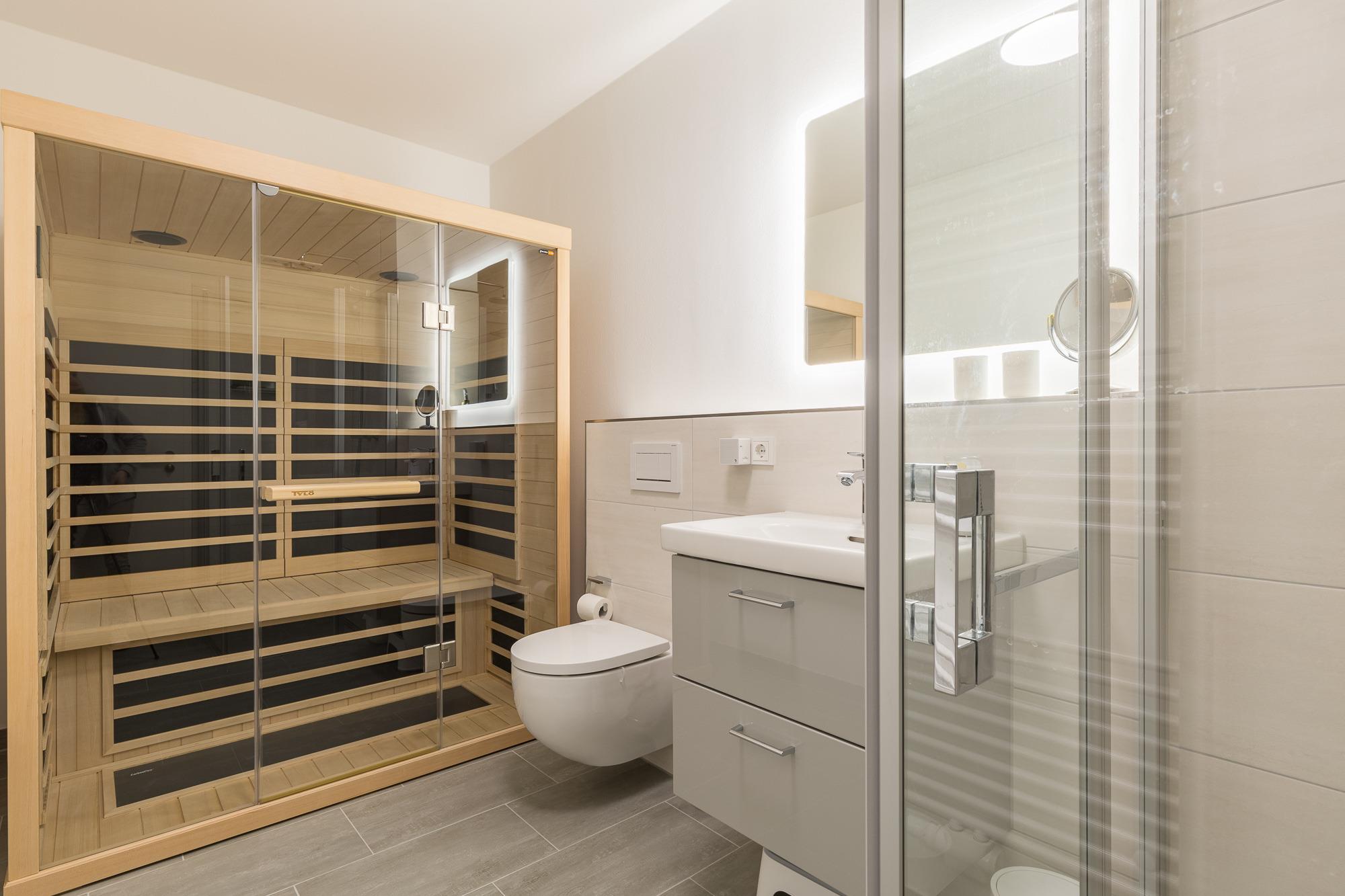 Die Ferienwohnung hat 3 Schlafzimmer, ein Wohnzimmer mit moderner Küche, 2 Bäder und einen Balkon. Zu den besonderen Extras zählen die Infrarot-Sauna und die Fußbodenheizung.