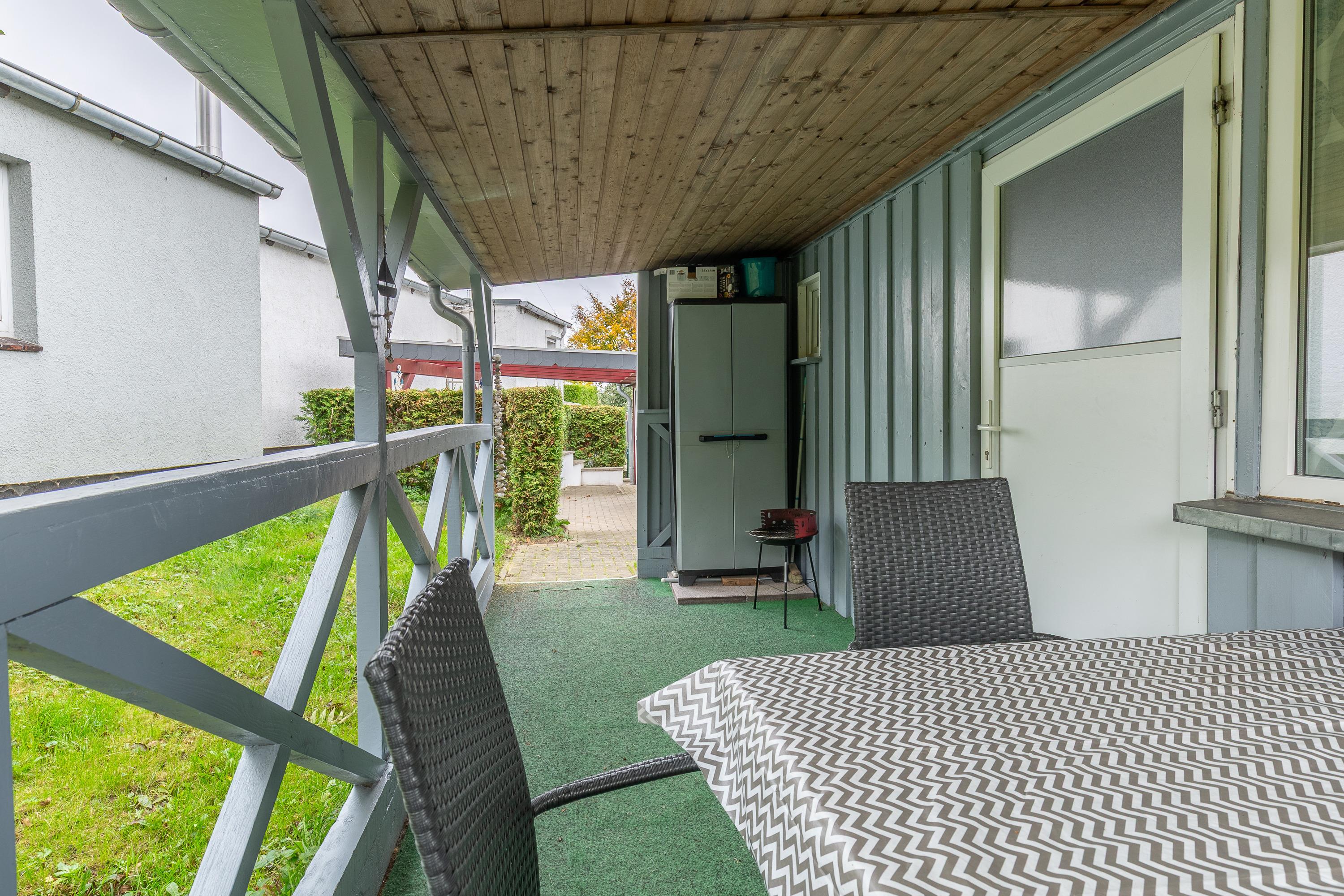 Die Terrasse mit erholsamen Blick lädt zum gemeinsamen Zusammensitzen ein. Der Strand ist ca. 1400 m entfernt. Ein PKW-Stellplatz ist selbstverständlich vorhanden.