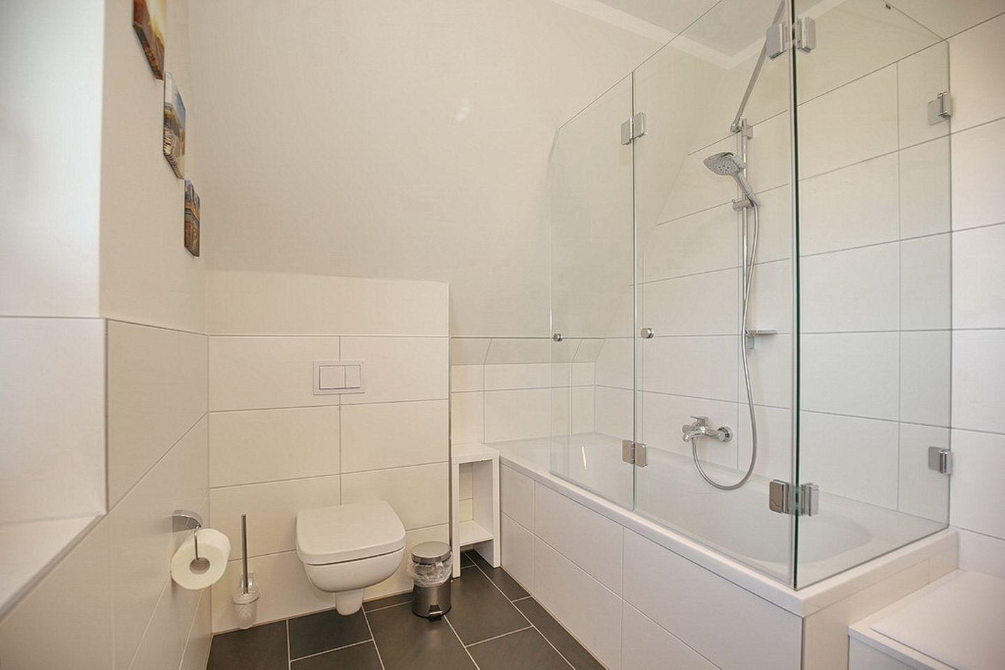 Im Dachgeschoss stehen zwei Schlafzimmer bereit. Beide Schlafzimmer sind mit jeweils einem 40"TV ausgestattet. In den Schlafzimmern stehen ein Boxspringbett (180 x 200 cm) bzw. ein Doppelbett (2x 90 x 200 cm) zur Verfügung. Weiter verfügt das Dachgeschoss über ein Bad, mit Badewanne und Dusche und den Flur, wo sich ein Schreibtisch befindet.