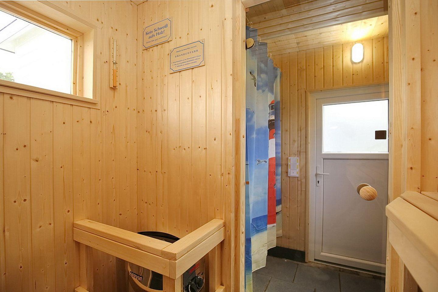 Die möblierte Terrasse ist zusätzlich mit einem Strandkorb ausgestattet. Auch ein Elektrogrill kann genutzt werden. Mitgebrachte Fahrräder sind im Fahrradschuppen sicher abgestellt. Zusätzlich befindet sich ein Fahrradständer am Haus. Die Sauna kann gegen Gebühr genutzt werden (den Schlüssel erhältst du in der Rezeption). Hier befindet sich eine zweite möblierte Terrasse.