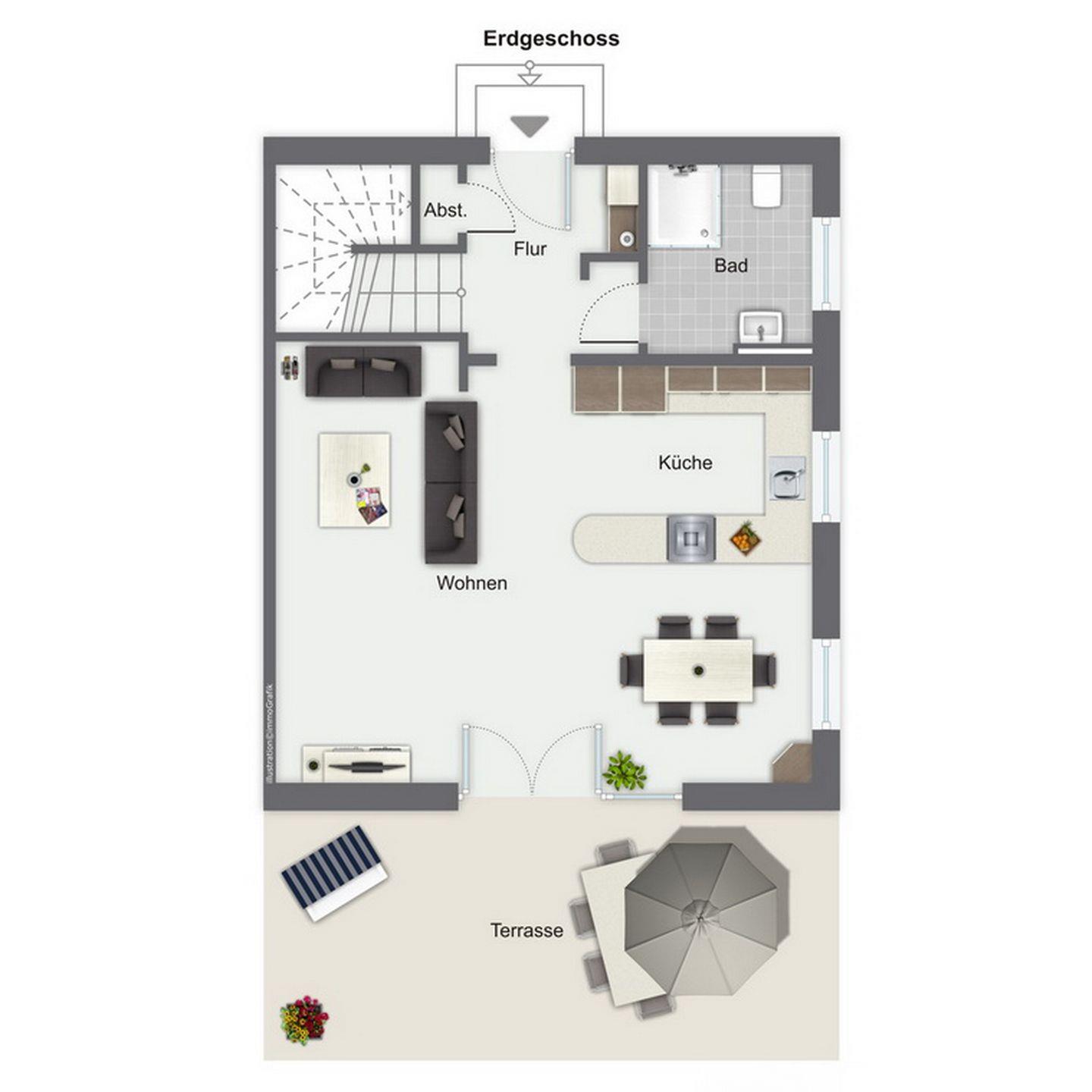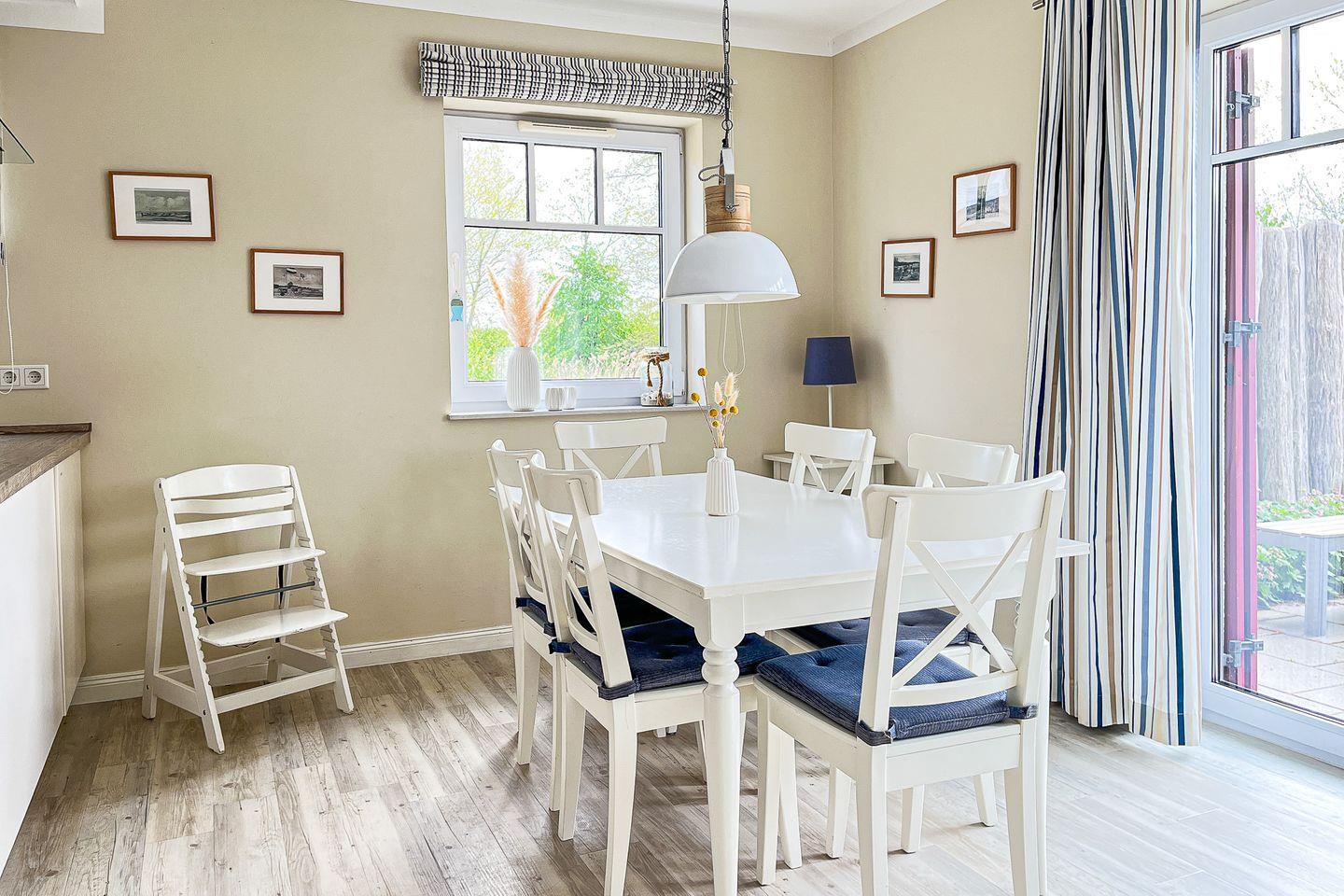 Im Erdgeschoss des Ferienhauses befindet sich der großzügige Wohnraum mit gemütlichem Essbereich, sowie der integrierten Küchenzeile. Hier steht dir auch ein Kinderhochstuhl zur Verfügung. Auch das Gäste-WC mit Dusche und den Eingangsbereich findest du hier.