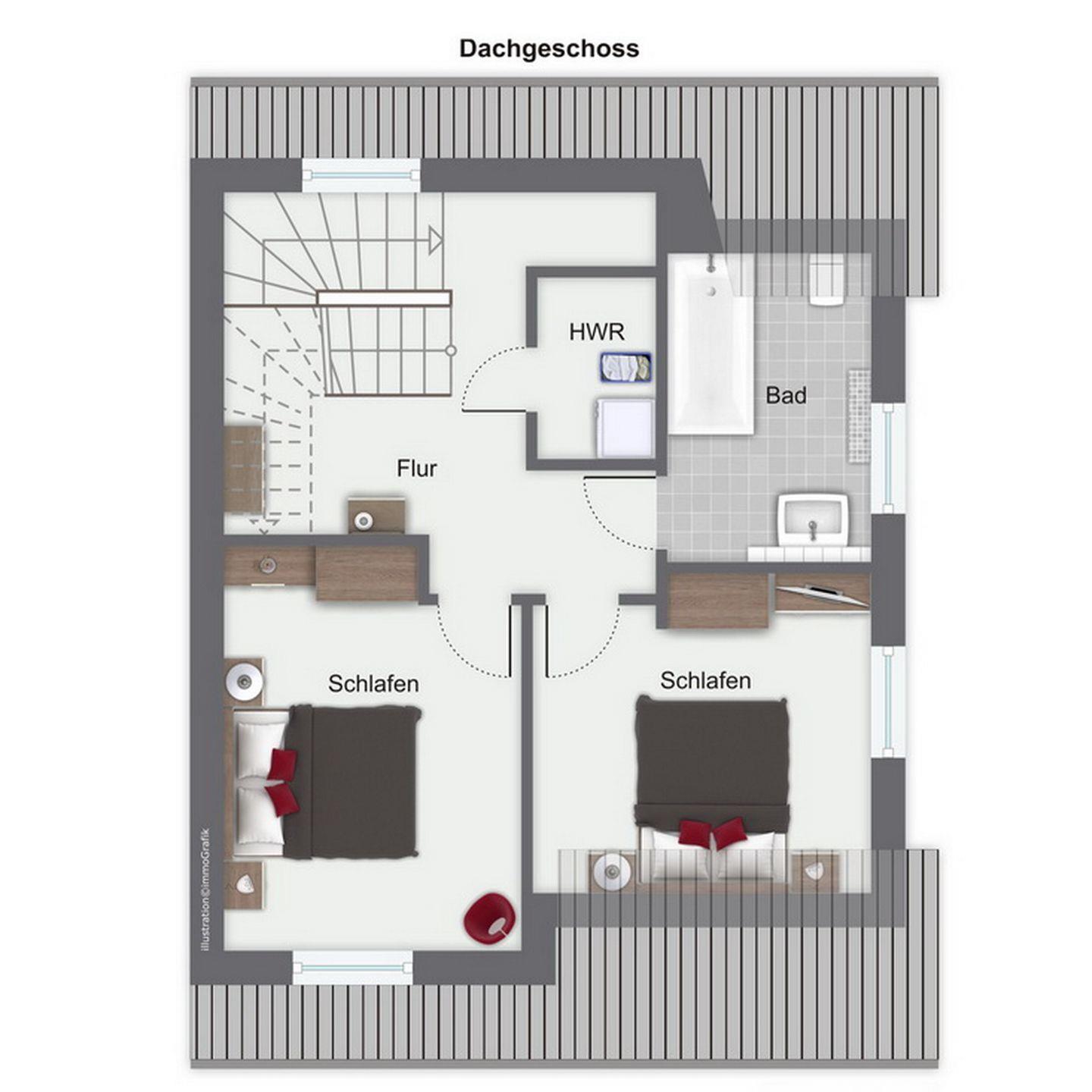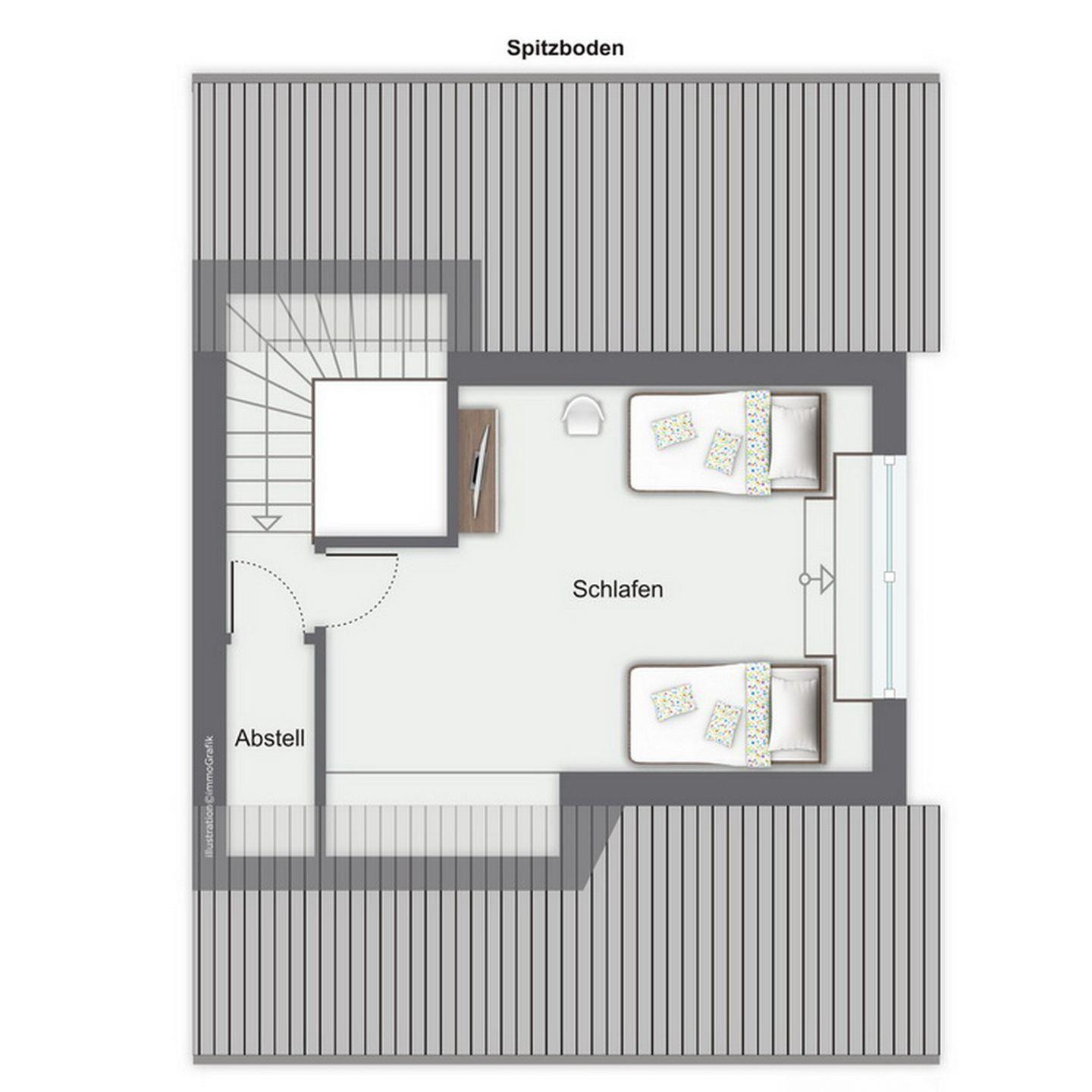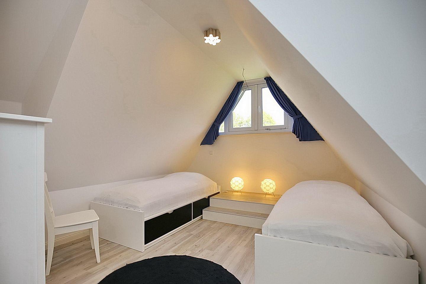 Die beiden Schlafzimmer im Dachgeschoss sind mit zwei Doppelbetten (2 x 90 x 200 cm) und zwei Flachbildfernsehern ausgestattet. Weiterhin stehen ein Kinderreisebett, eine Waschmaschine und ein Bad mit Badewanne zur Verfügung.