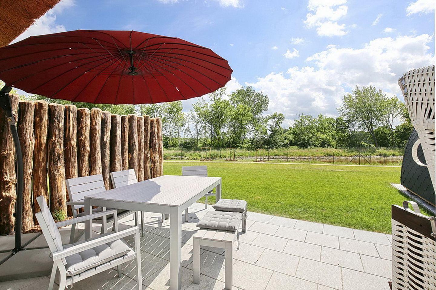Der Zugang zur Süd/West Terrasse erfolgt direkt vom Wohnzimmer und gibt den Blick frei in den Garten. Auf der Terrasse kannst du den vorhandenen Elektrogrill ausgiebig nutzen. Es steht dir eine kostenpflichtige Gartensauna zur Verfügung, die du gemeinsam mit dem Reethaus 15b nutzen kannst (den Schlüssel erhältst du in der Rezeption).