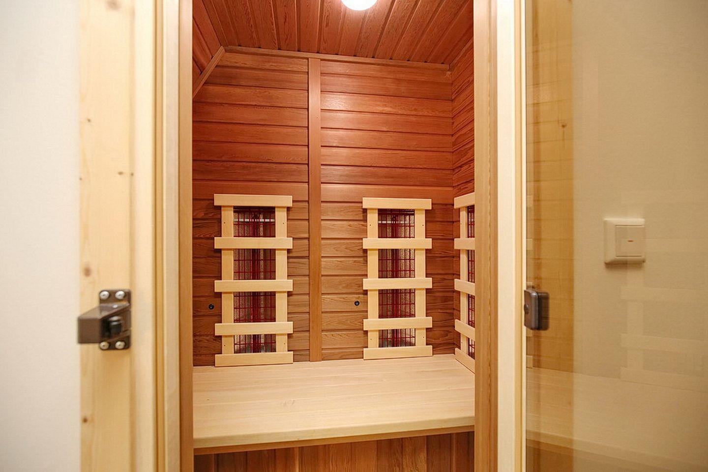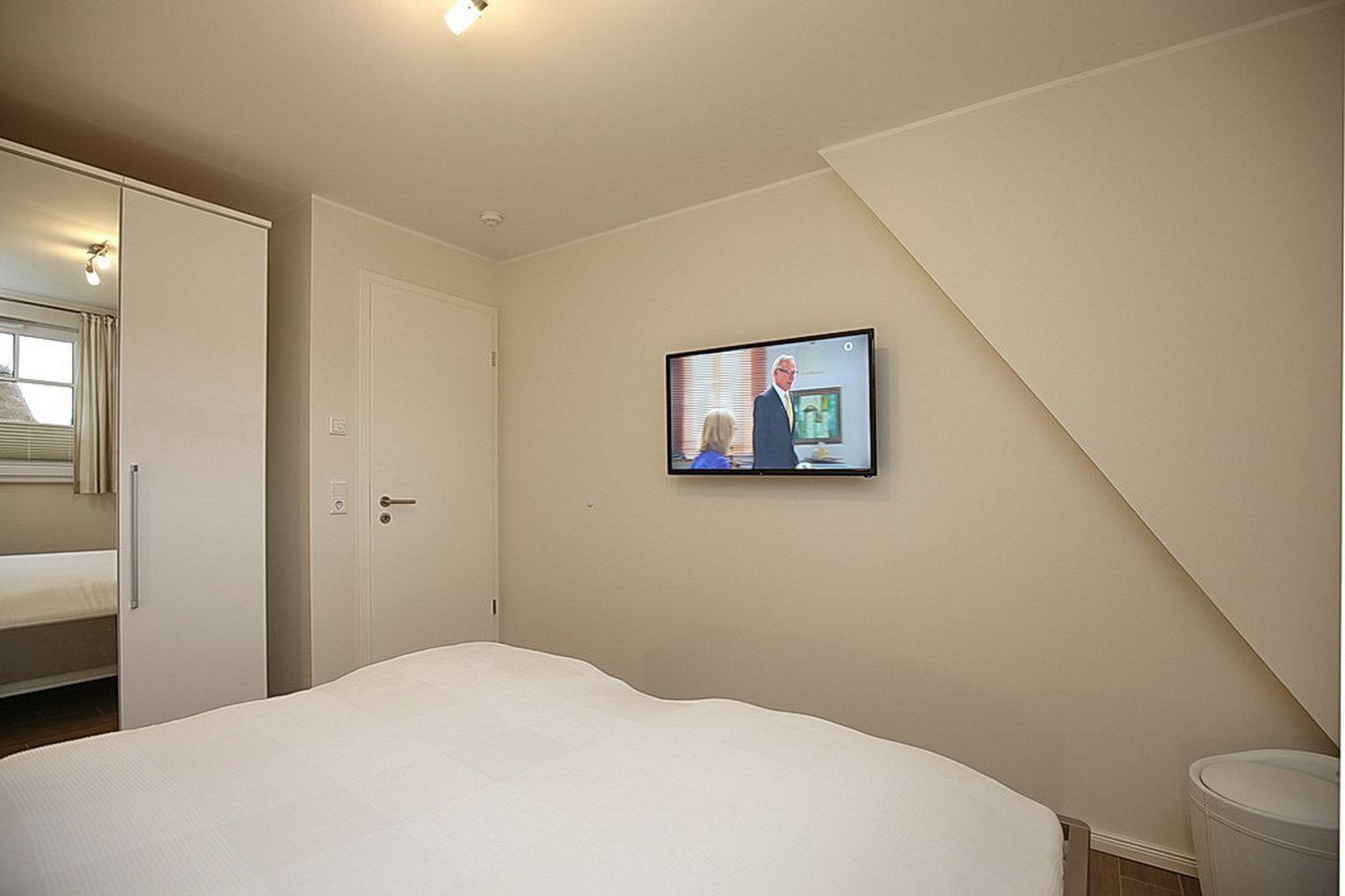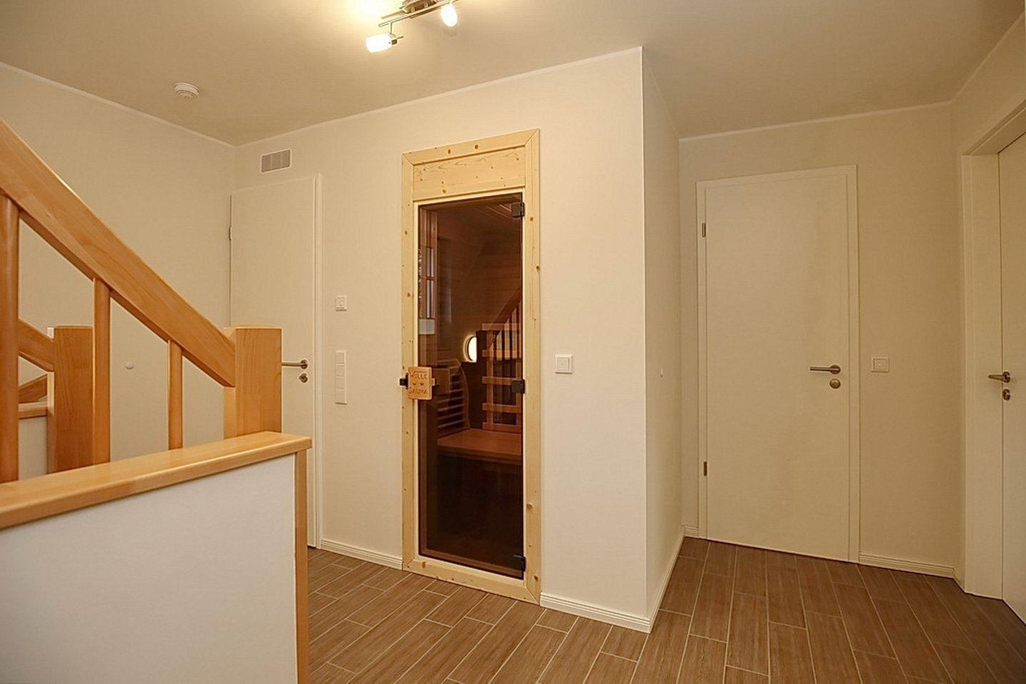 Im Obergeschoss befinden sich zwei Schlafzimmer. Ein Schlafzimmer mit Doppelbett (180 x 200 cm) und ein Schlafzimmer mit zwei Einzelbetten (90 x 200 cm u. 90 x 190 cm). In beiden Schlafzimmern findest du große Kleiderschränke für deine Wäsche und jeweils einen LED-TV. Weiterhin steht dir im Obergeschoss unsere gemütliche Infrarotsauna mit LED-Farblichtsystem zum Entspannen zur Verfügung. Das Bad ist mit einer Badewanne ausgestattet. Die Waschmaschine befindet sich ebenfalls im Obergeschoss.