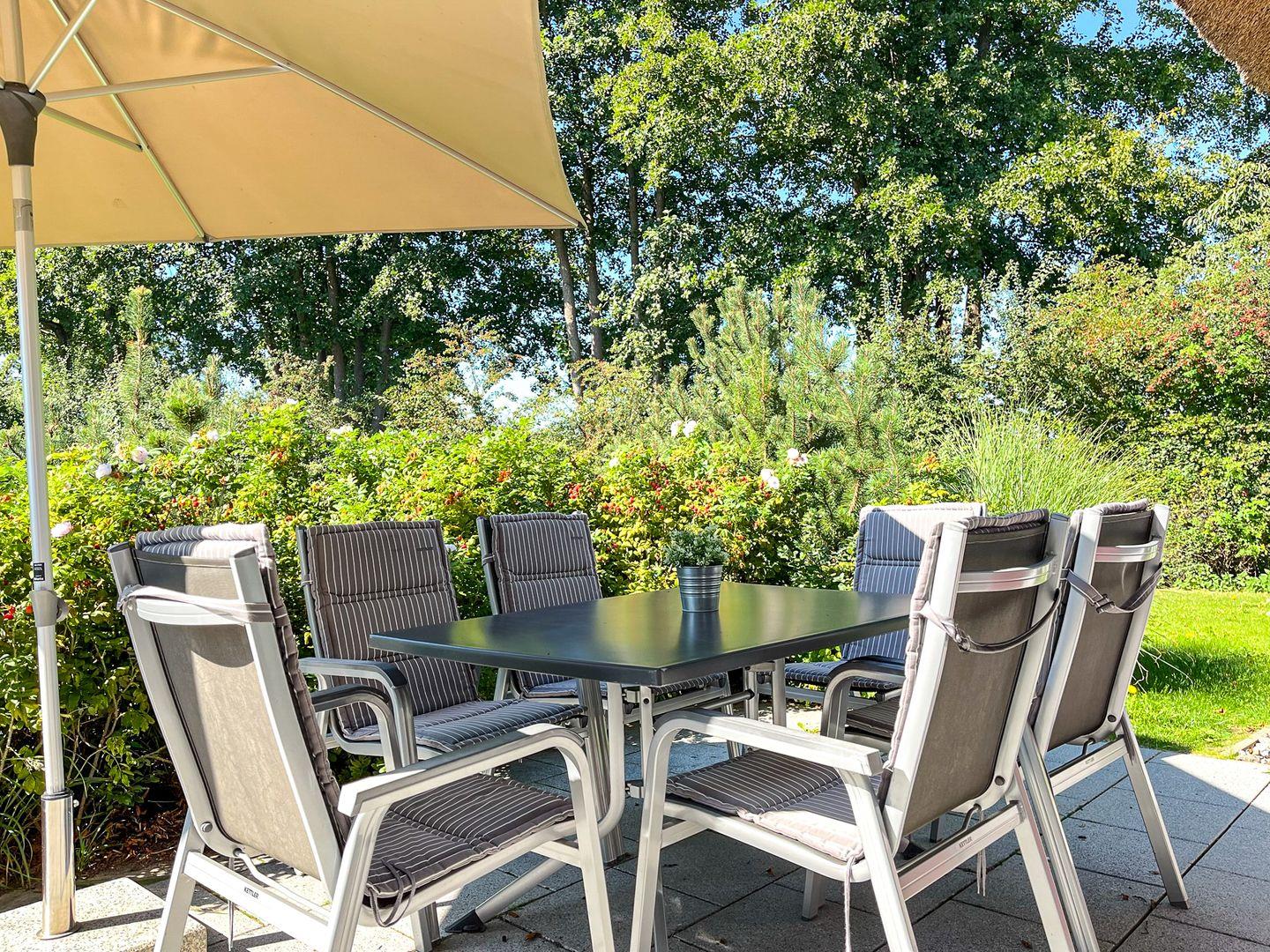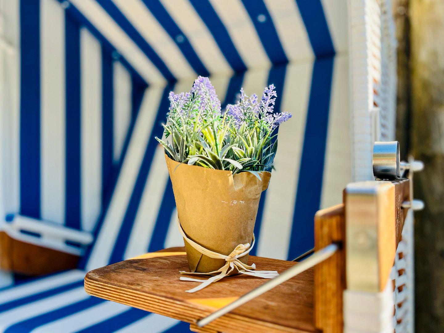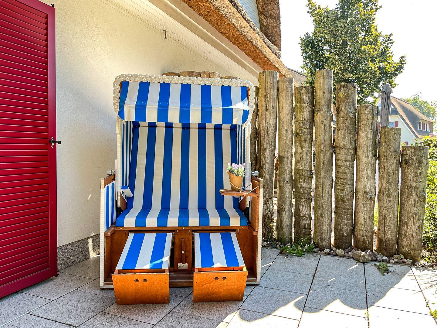 Der Zugang zur Terrasse mit Südausrichtung erfolgt direkt vom Wohnzimmer aus. Von morgens bis zum späten Nachmittag kannst du hier die Sonne auf der möblierten Terrasse genießen. Ein Strandkorb lädt ebenfalls zum Entspannen ein.
