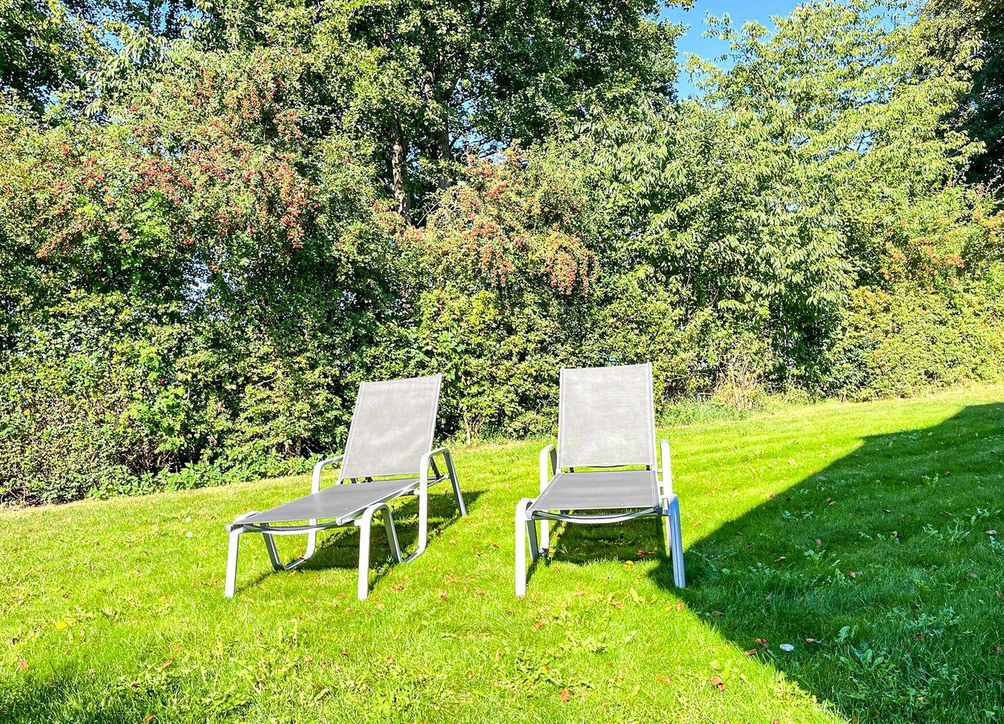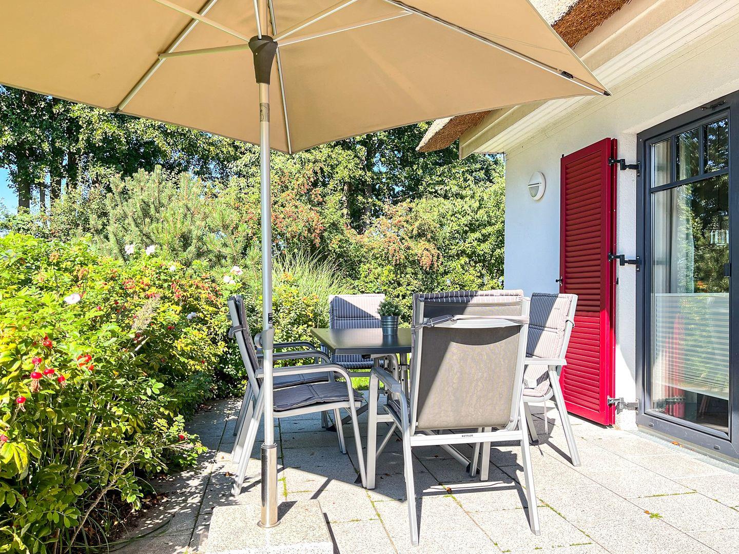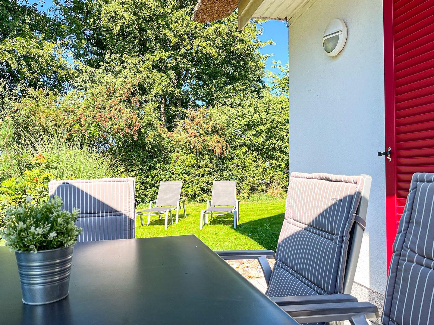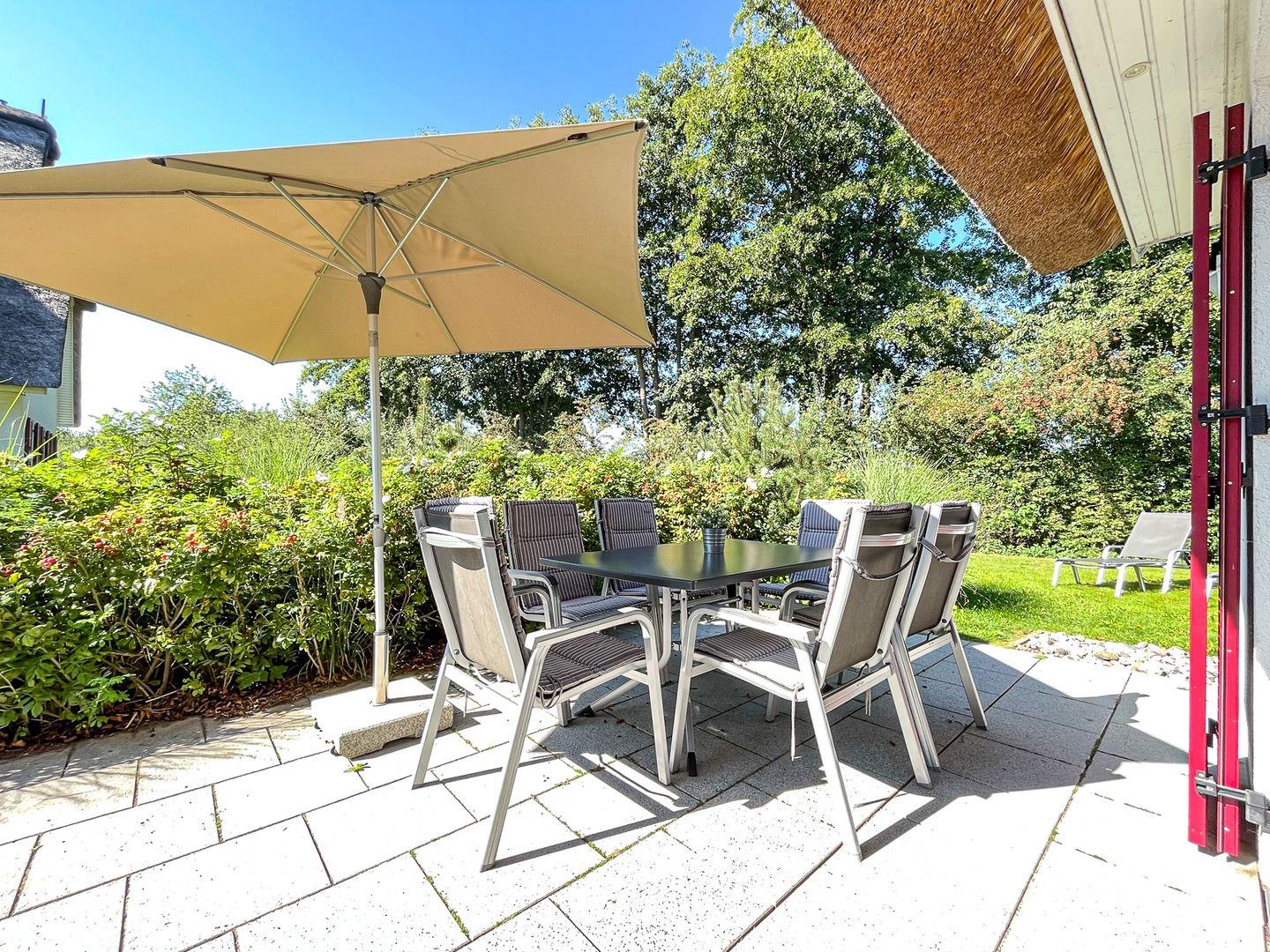 Der Zugang zur Terrasse mit Südausrichtung erfolgt direkt vom Wohnzimmer aus. Von morgens bis zum späten Nachmittag kannst du hier die Sonne auf der möblierten Terrasse genießen. Ein Strandkorb lädt ebenfalls zum Entspannen ein.