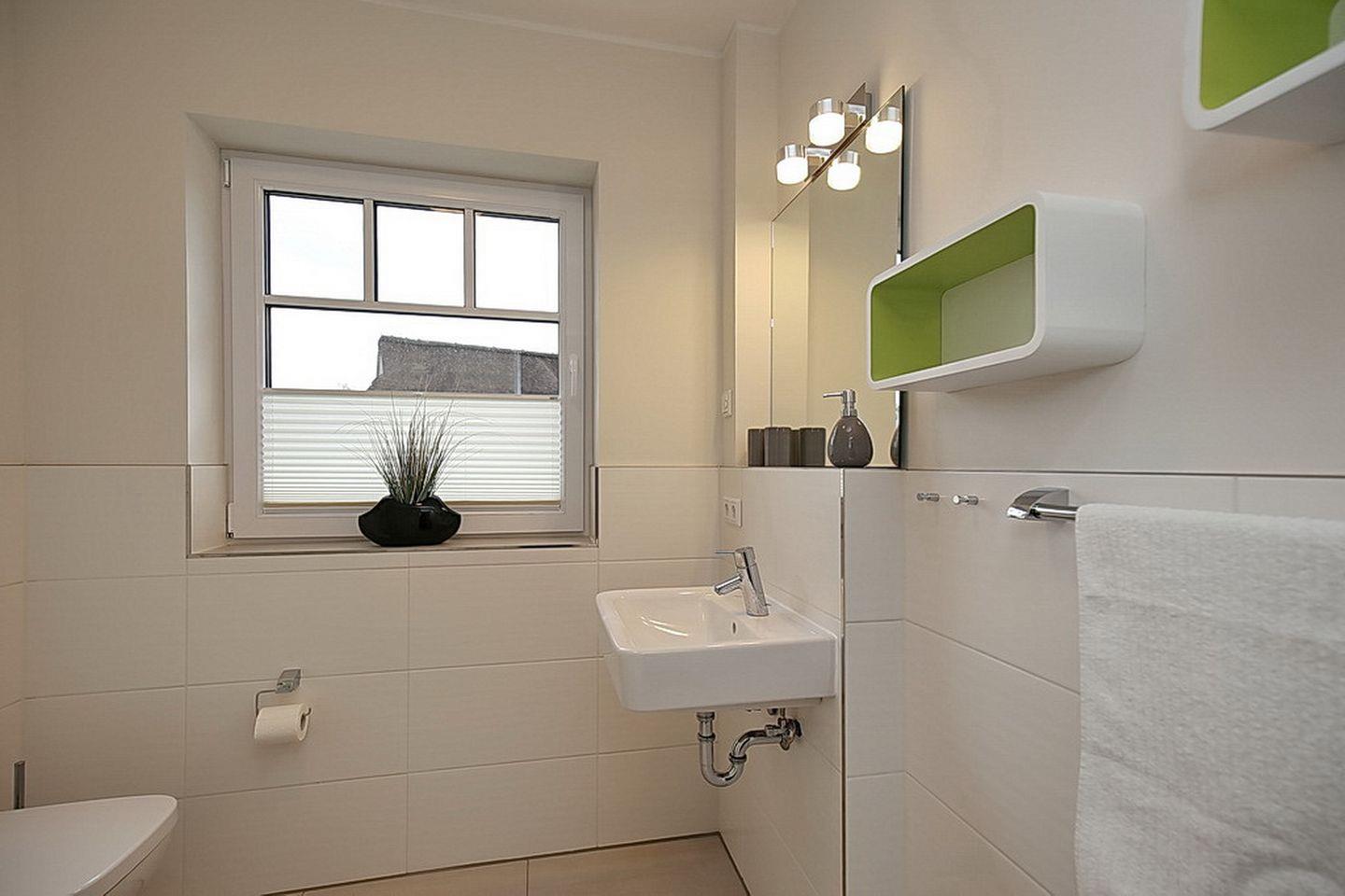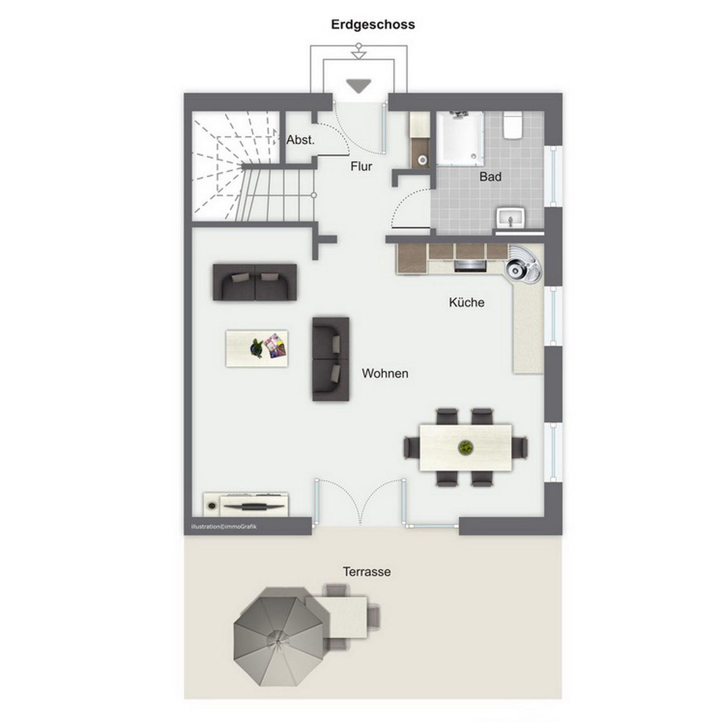 Im Erdgeschoss des Ferienhauses befindet sich der großzügige Wohnraum mit einer gemütlichen Essgruppe und der integrierten Küchenzeile. Auch ein Bad mit bodengleicher Dusche und den Eingangsbereich findest du hier.