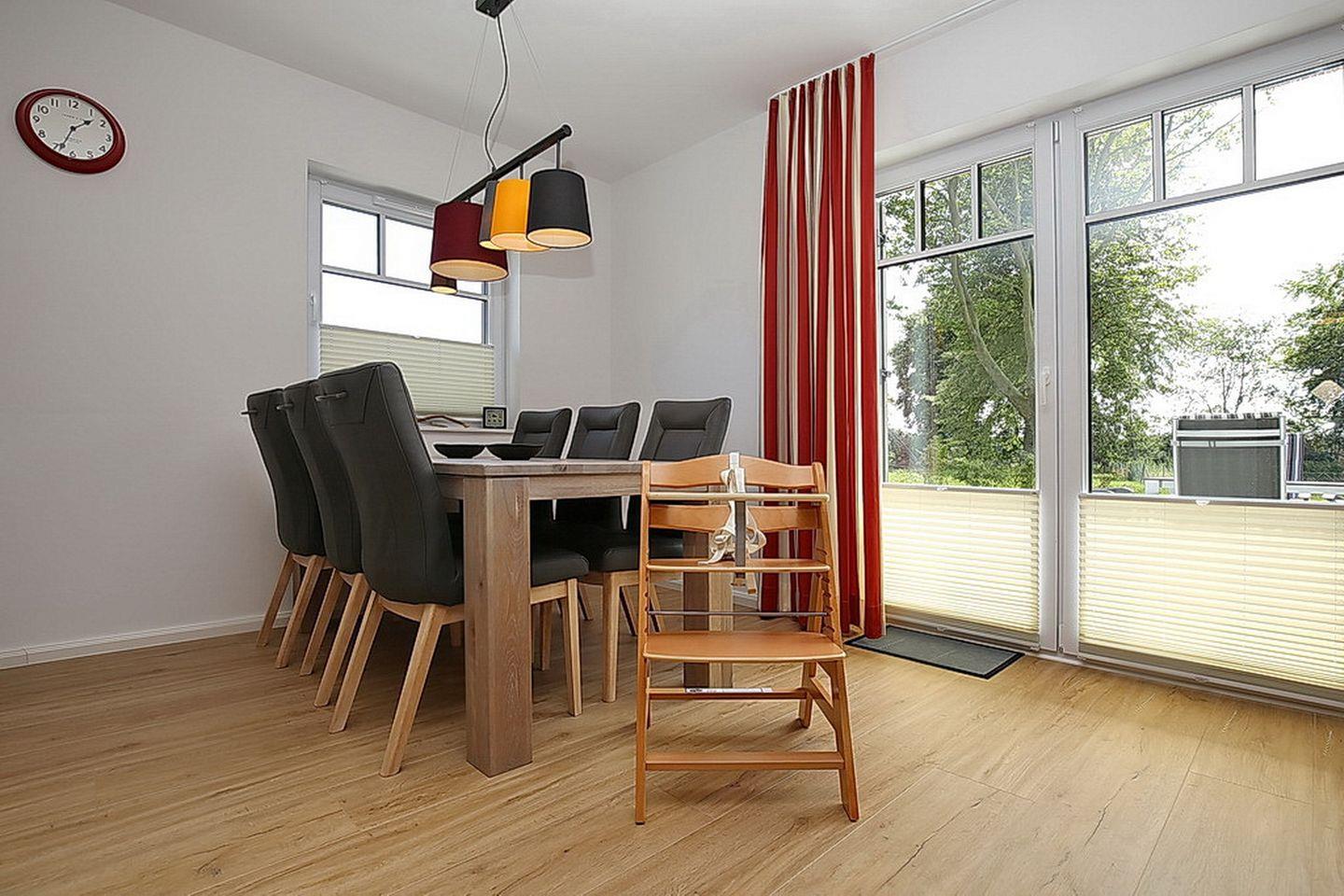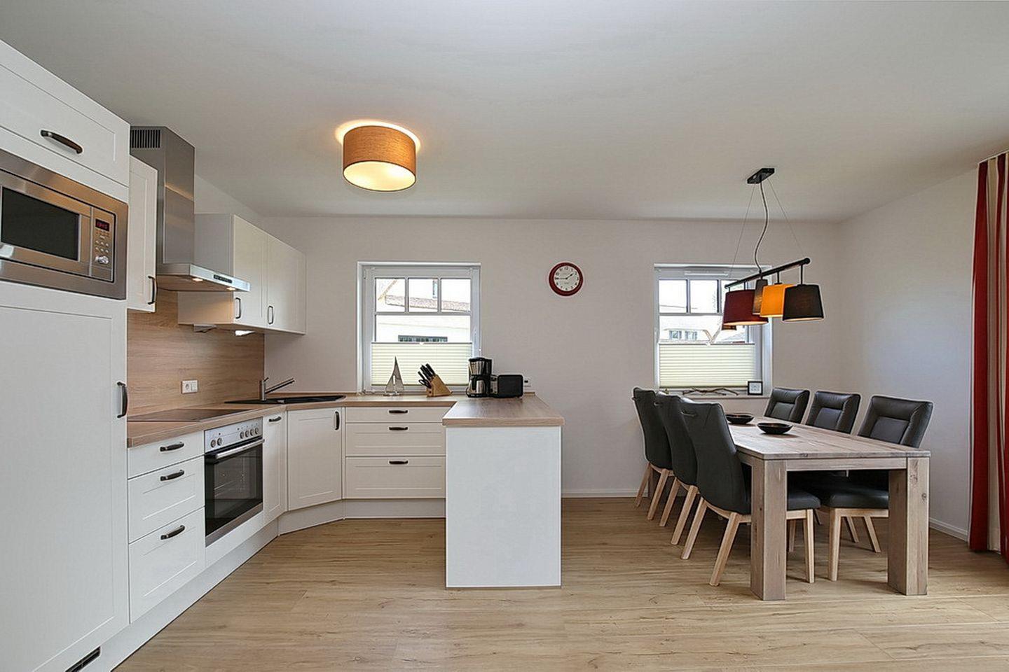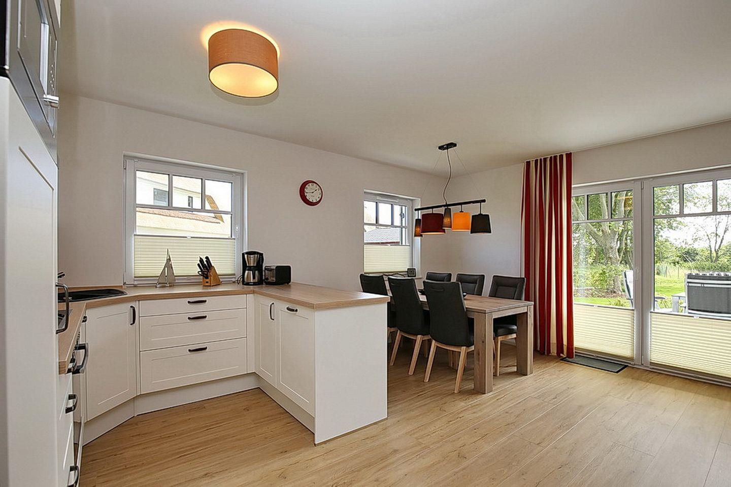 Im Erdgeschoss des Ferienhauses befindet sich der großzügige Wohnraum mit gemütlichem Essbereich, sowie der integrierten Küchenzeile. Die moderne Küchenzeile bietet Backofen, 4-Platten- Cerankochfeld, Geschirrspüler, Kühlschrank mit Gefrierfach und eine Mikrowelle.