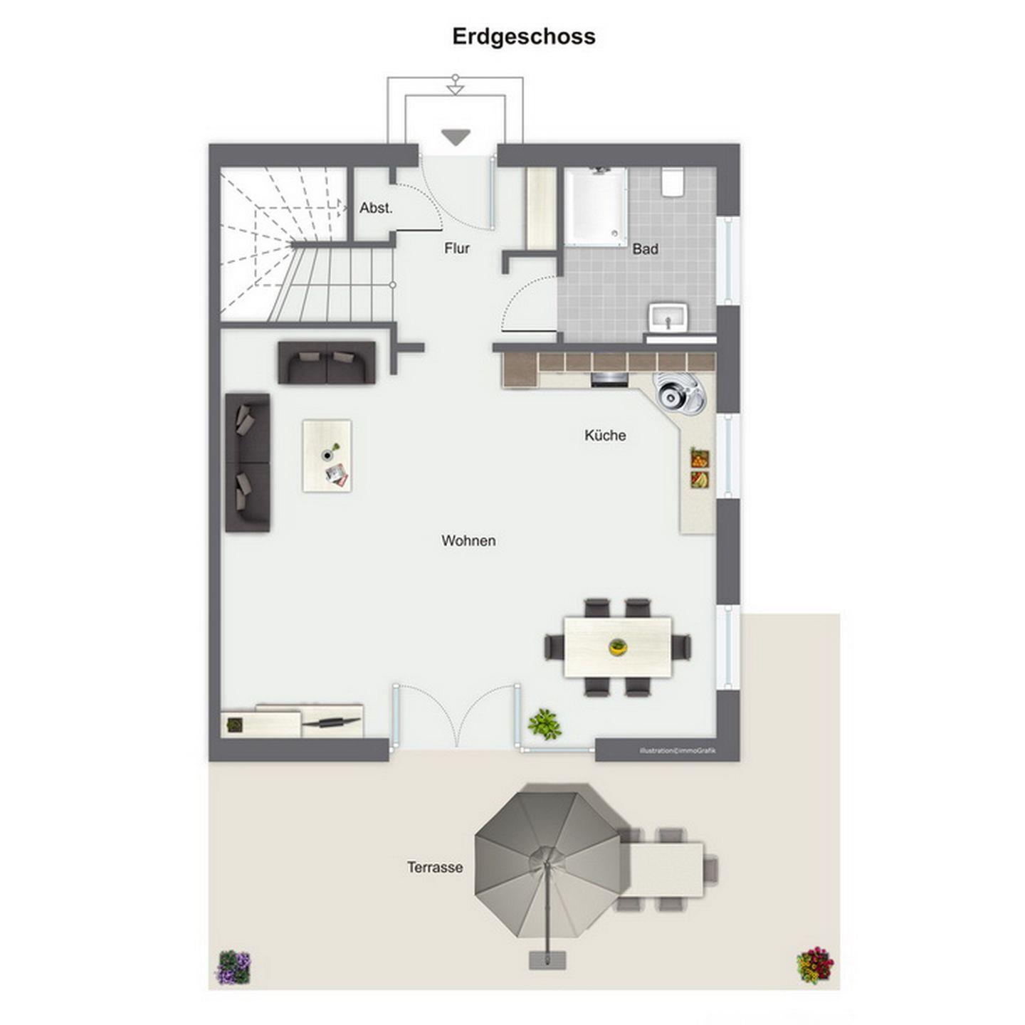 Im Erdgeschoss des Ferienhauses befinden sich der Wohnraum, eine gemütliche Essgruppe, ein Sofa sowie die integrierte Küchenzeile. Auch das Duschbad mit WC sowie der Eingangsbereich befinden sich hier.