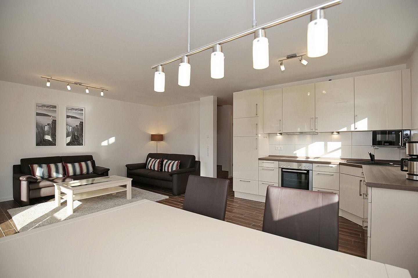 Modern und sehr geschmackvoll eingerichtet ist das Wohnzimmer. Für deine Unterhaltung stehen dir ein Flachbild-TV und eine Stereoanlage zur Verfügung. Der Zugang zur großzügigen Süd-West Terrasse, die selbstverständlich möbliert ist, erfolgt direkt vom Wohnzimmer aus. In der hochwertig eingerichteten Küchenzeile findest du u.a. einen Geschirrspüler, eine Mikrowelle, ein 4- Platten-Ceranfeld mit Backofen, einen Kühlschrank mit Gefrierfach, eine Kaffeemaschine, einen Toaster sowie einen Wasserkocher vor.
