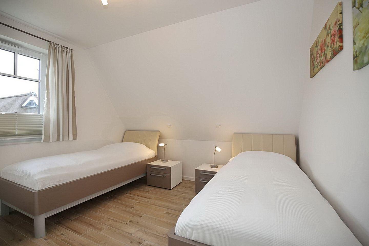 In den zwei Schlafzimmern im Obergeschoss stehen dir ein Doppelbett (2 x 90 x 200 cm) und zwei Einzelbetten (90 x 200 cm) sowie Schränke mit ausreichend Platz für deine Urlaubsgarderobe zur Verfügung. In einem der beiden Schlafzimmer gibt es einen weiteren großen Flachbild-TV. Des Weiteren verfügt das Obergeschoss über ein modernes Bad mit Badewanne sowie den Flur mit Abstellfläche.