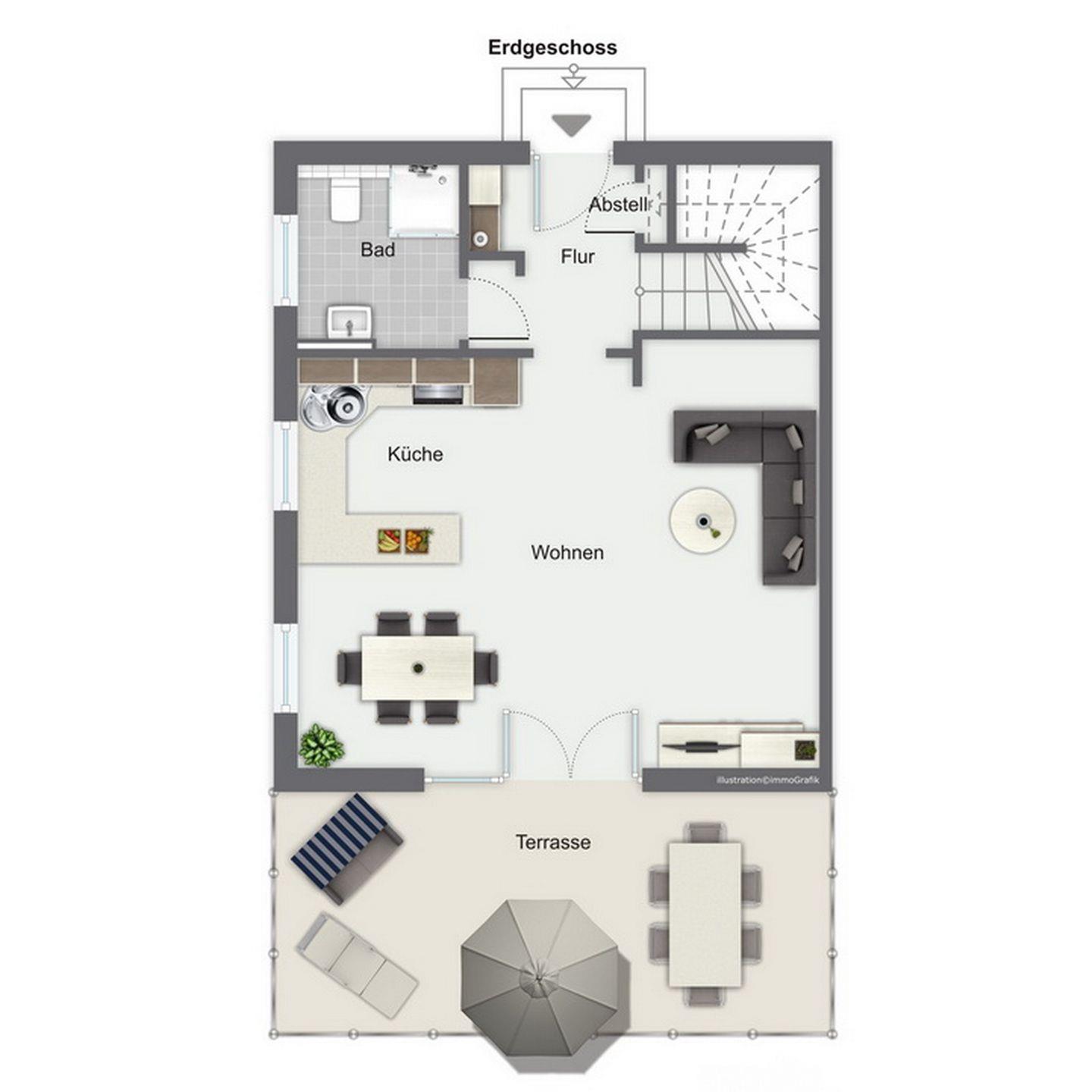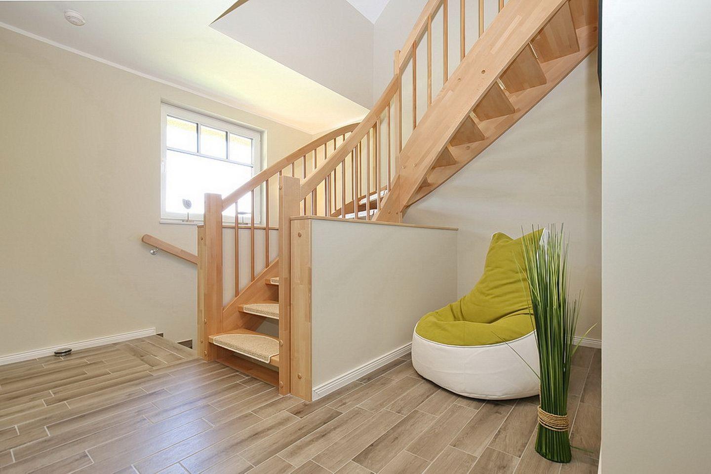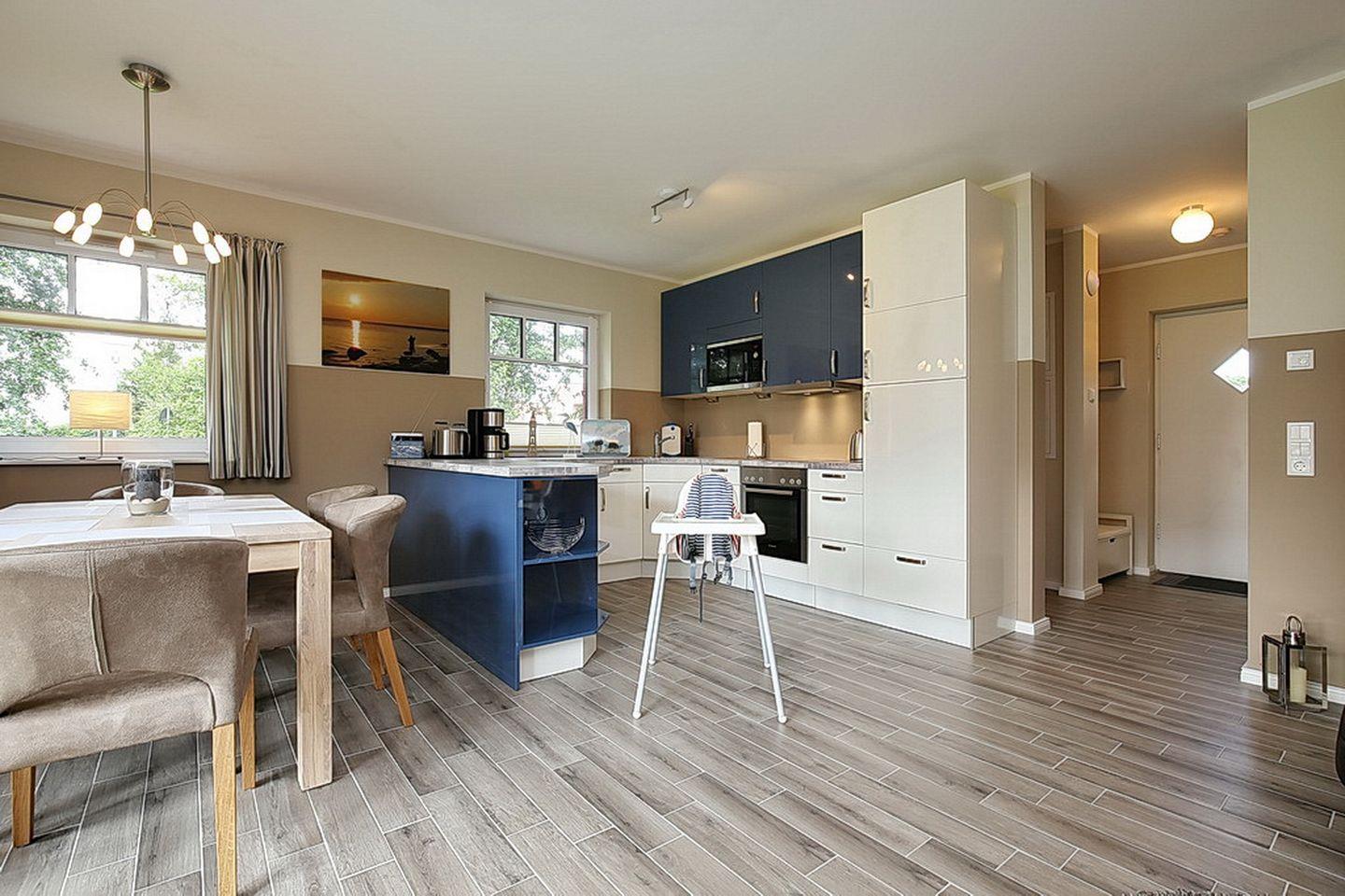 Im Erdgeschoss des Ferienhauses befinden sich der Wohnraum, eine gemütliche Essgruppe, ein Sofa sowie die integrierte Küchenzeile. Auch das Duschbad sowie der Eingangsbereich befinden sich hier.