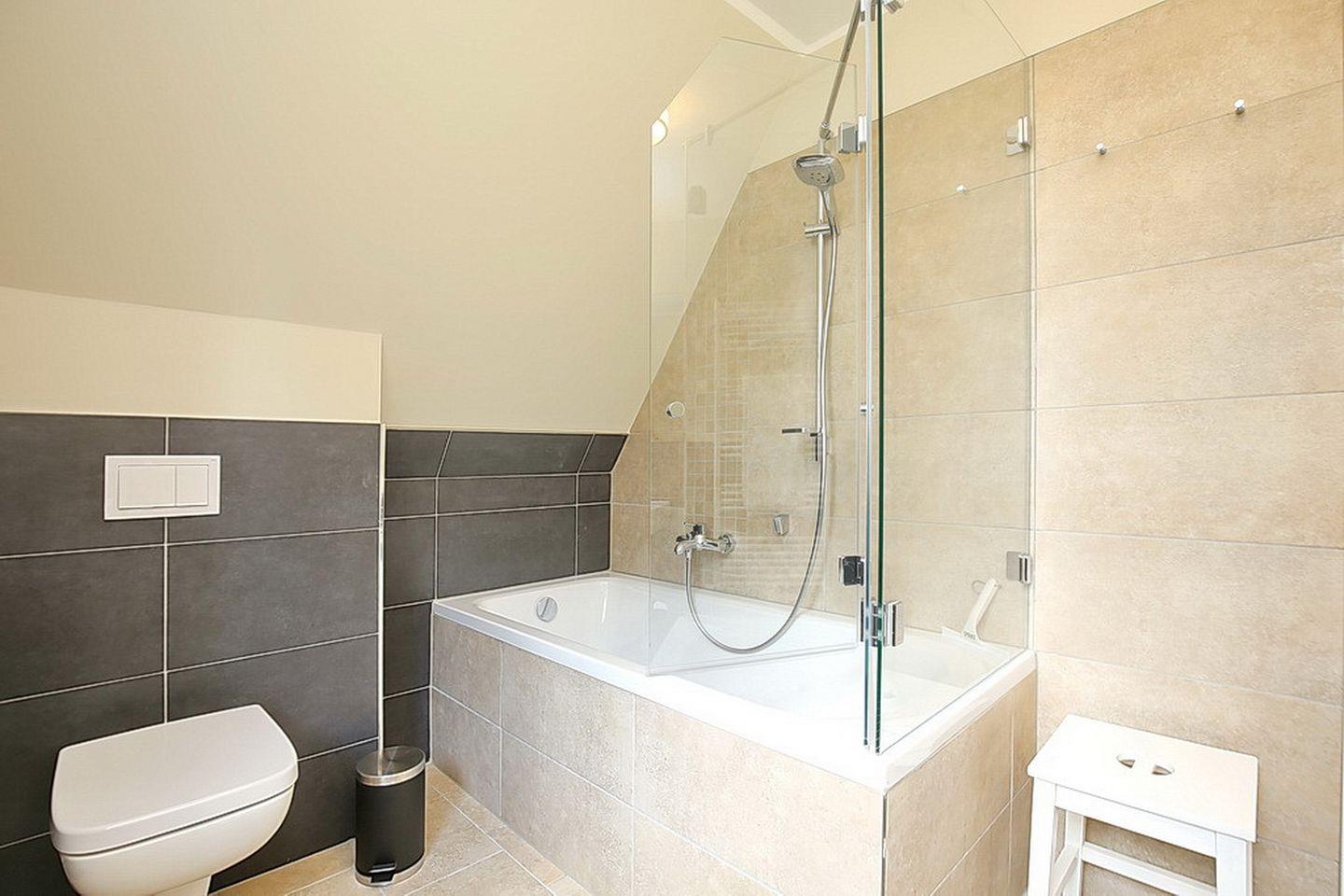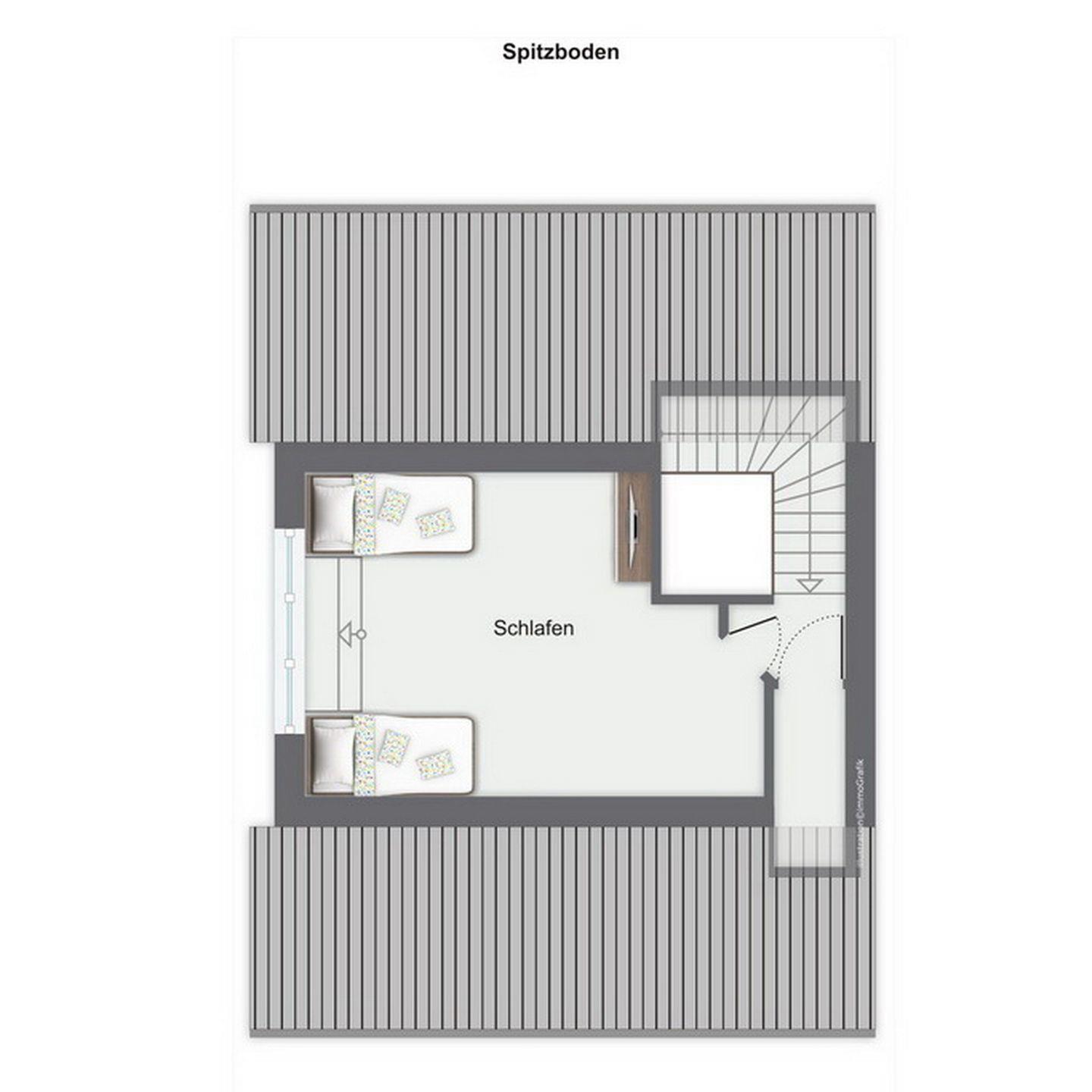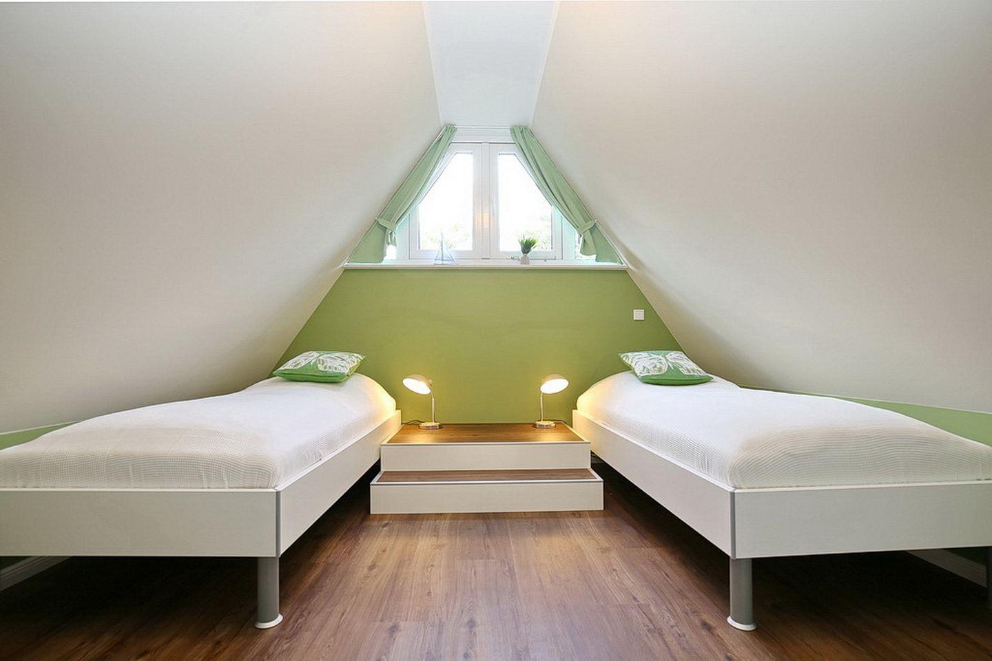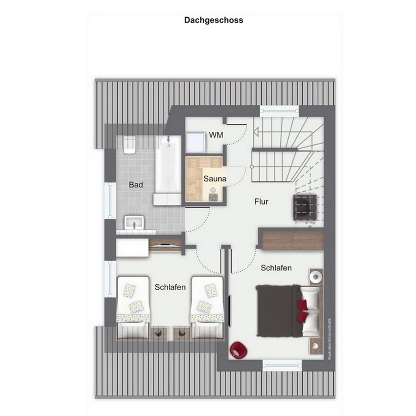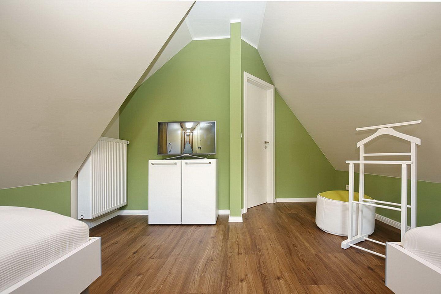In den Schlafzimmern im Dachgeschoss stehen dir ein Doppelbett (180 x 200 cm) bzw. 2 Einzelbetten (90 x 200 cm) und jeweils ein TV sowie Kleiderschränke mit ausreichend Platz für deine Urlaubsgarderobe zur Verfügung. Des Weiteren verfügt das Dachgeschoss über ein Bad mit Badewanne sowie den Flur.