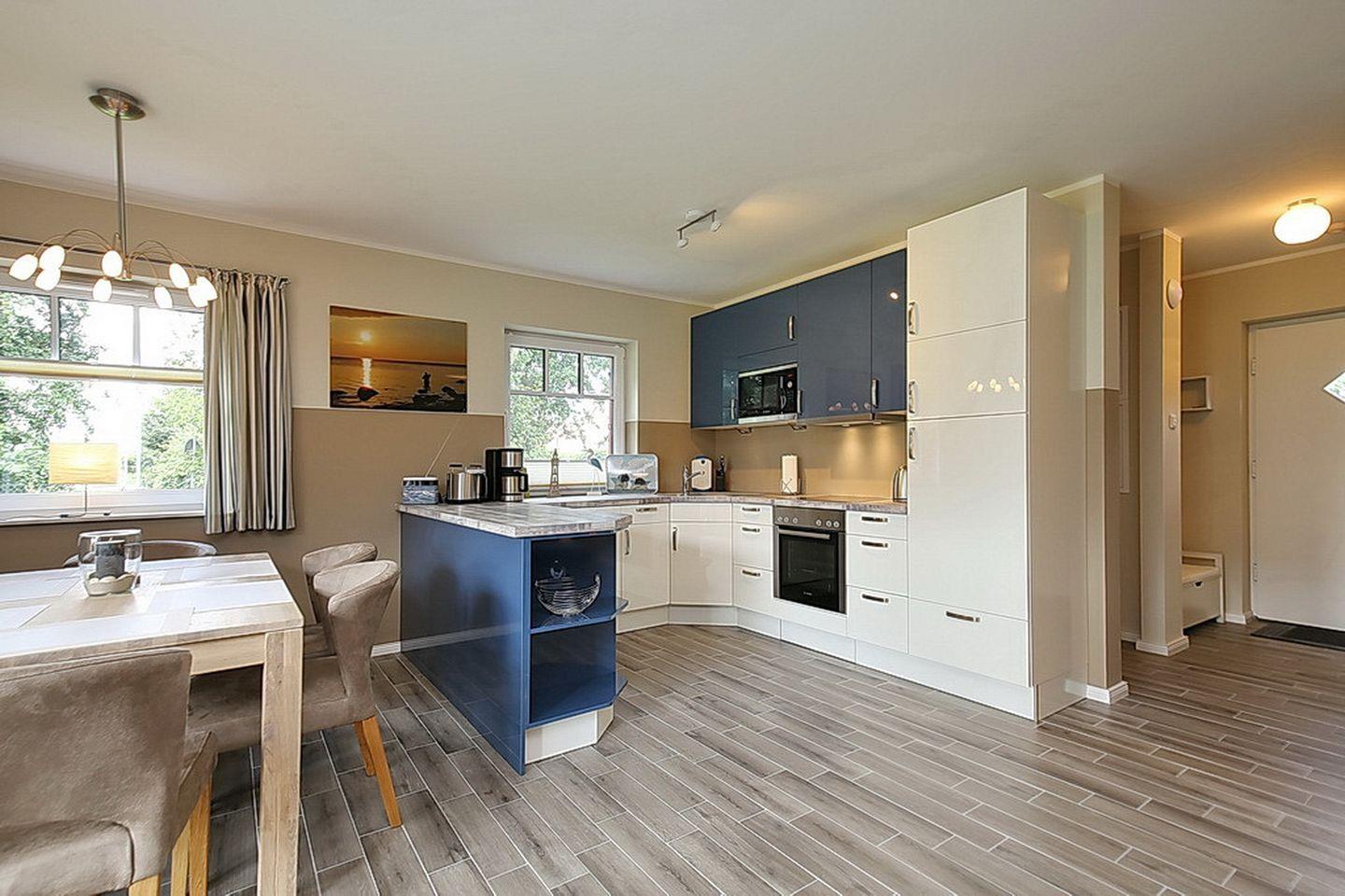 Modern und sehr geschmackvoll eingerichtet ist das Wohnzimmer. Für deine Unterhaltung stehen dir ein Flachbild-TV, ein DVD-Player und eine Stereoanlage zur Verfügung. Der Zugang zur großzügigen Südterrasse, die selbstverständlich möbliert ist, erfolgt direkt vom Wohnzimmer aus. In der hochwertig eingerichteten Küchenzeile findest du einen Geschirrspüler, eine Mikrowelle, einen Herd mit Cerankochfeld und Backofen, einen Kühlschrank mit Gefrierfach, eine Kaffeemaschine und vieles mehr vor.