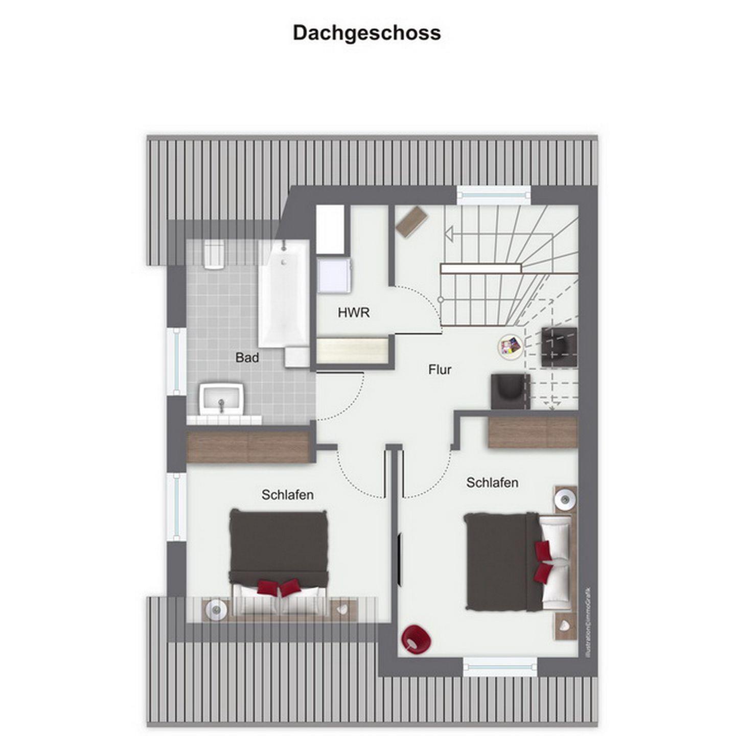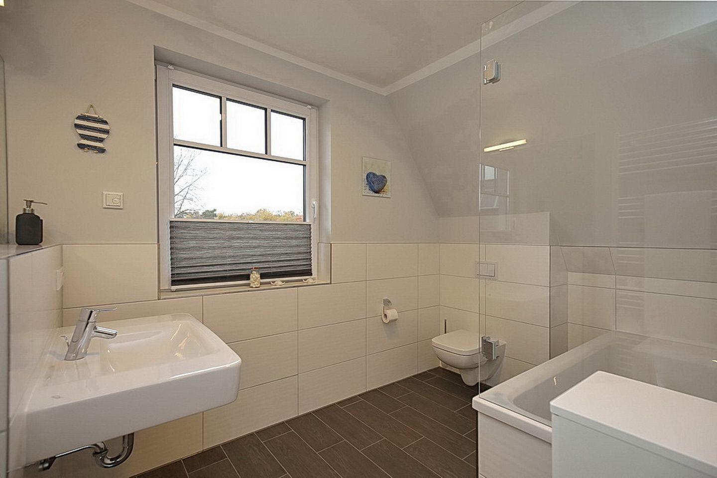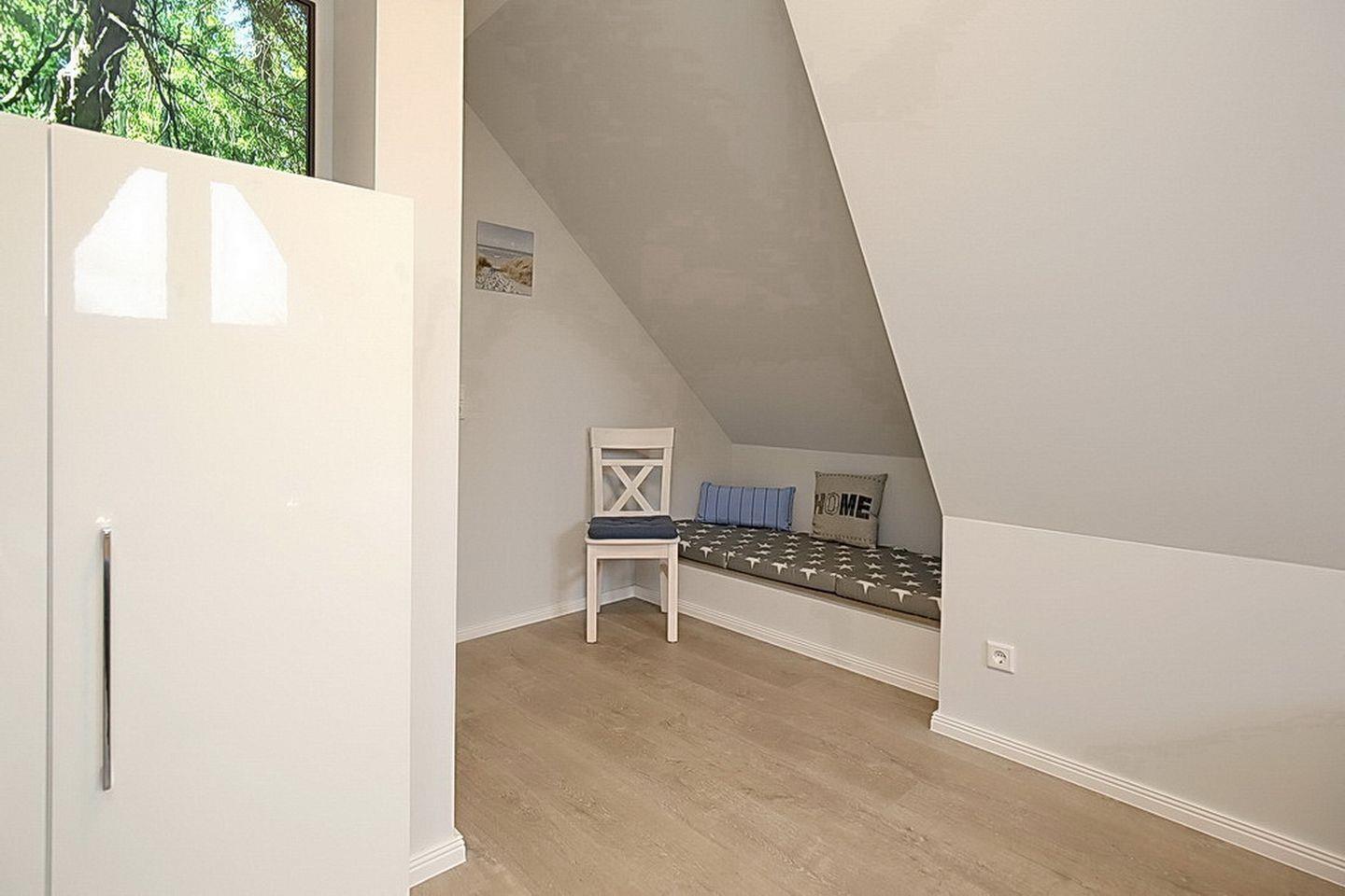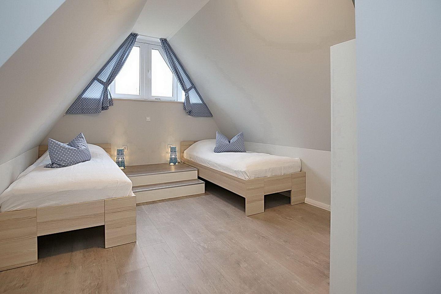 In den Schlafzimmern im Dachgeschoss stehen dir zwei Doppelbetten (2 x 90 x 200 cm), jeweils ein TV sowie Kleiderschränke mit ausreichend Platz für deine Urlaubsgarderobe zur Verfügung. Des Weiteren verfügt das Dachgeschoss über ein Bad mit Badewanne und Duschabtrennung sowie Fön und Schwingspiegel sowie ein Waschbecken mit Unterschränken.