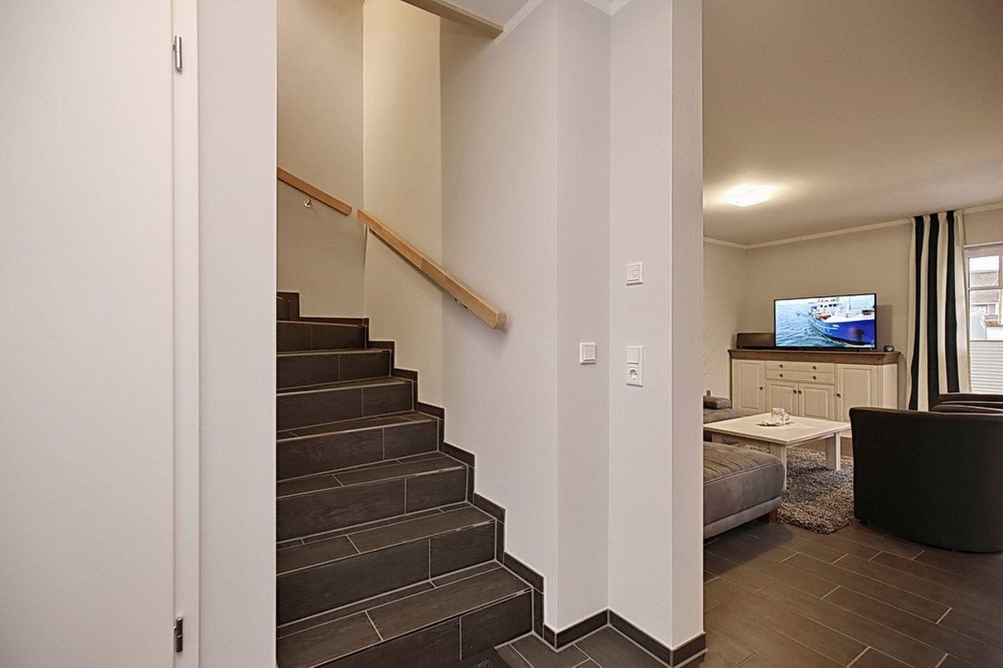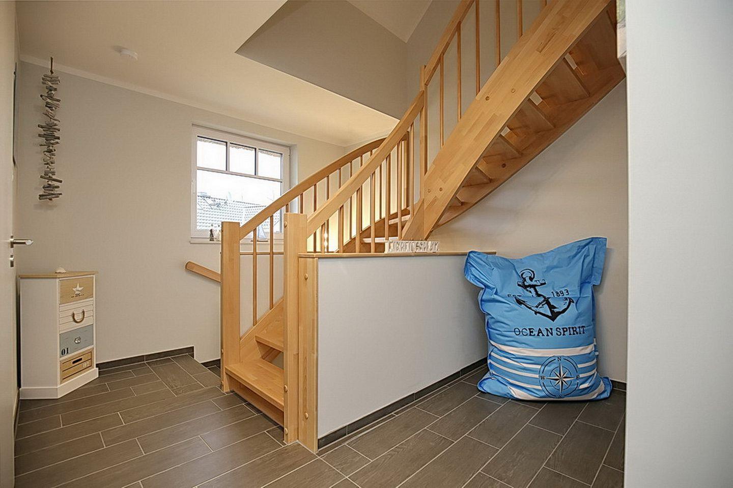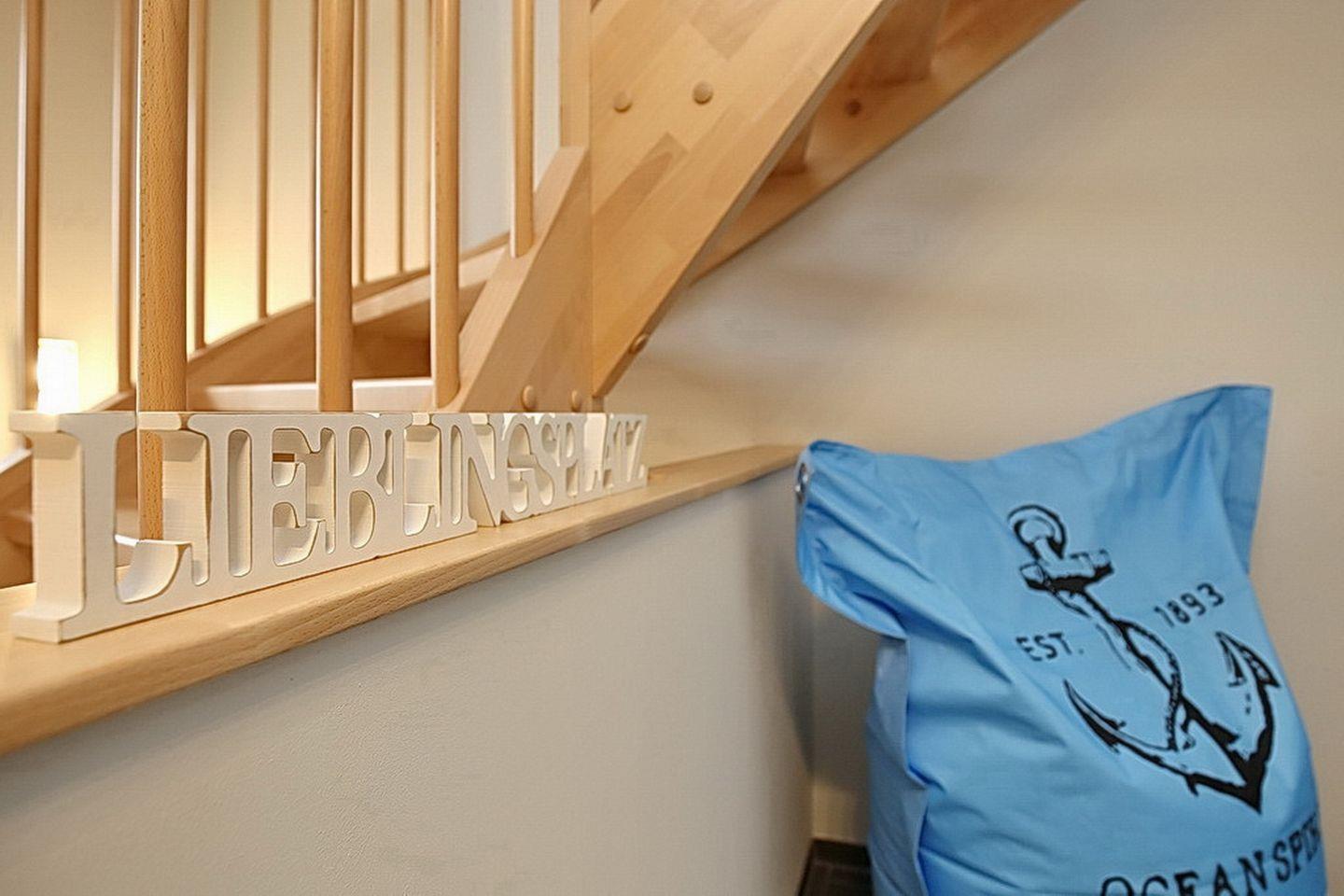 Im Erdgeschoss des Ferienhauses befinden sich der Wohnraum, eine gemütliche Essgruppe, ein Sofa sowie die integrierte Küchenzeile. Für die jüngeren Besucher steht dir kostenlos ein Kinderhochstuhl zur Verfügung. Auch das Duschbad mit bodengleicher Dusche und Fön sowie der Eingangsbereich befinden sich hier.
