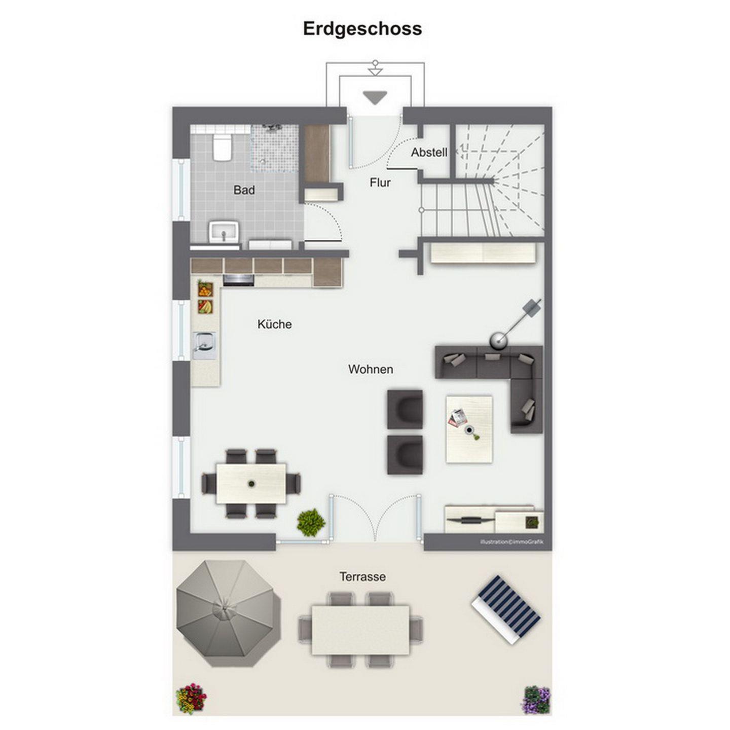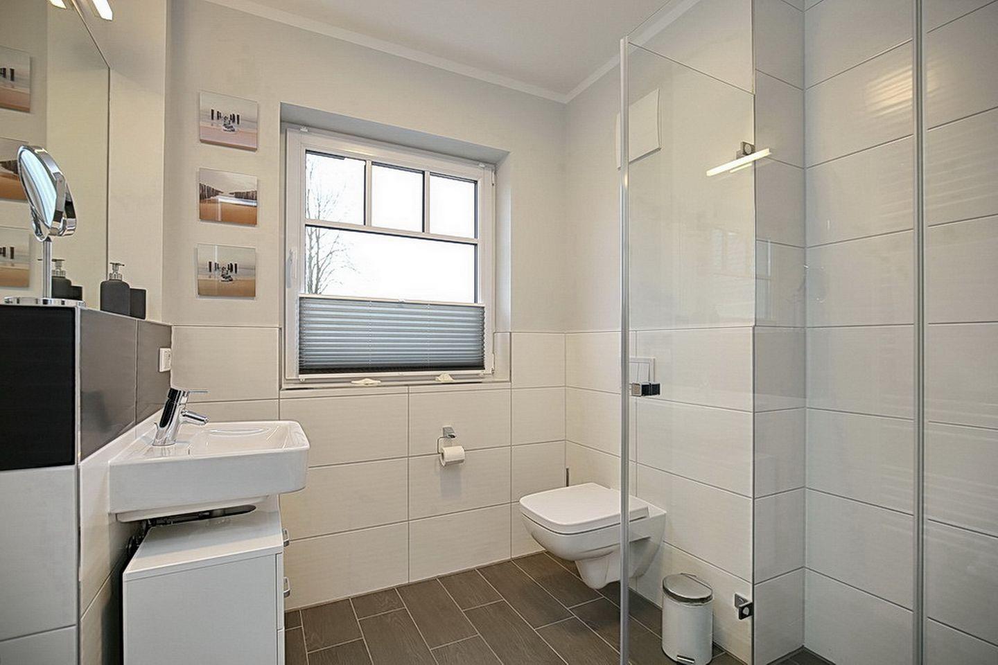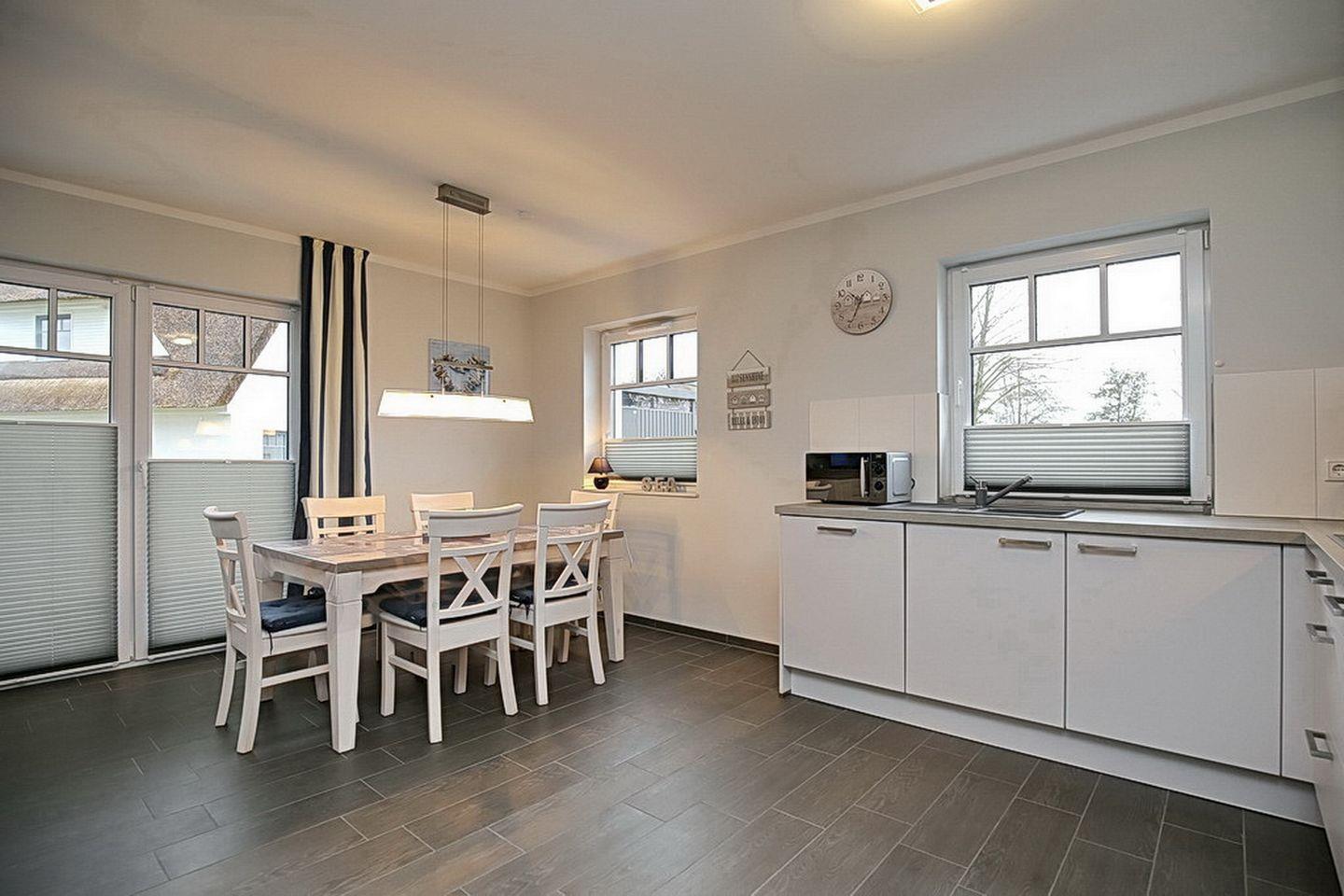 Im Erdgeschoss des Ferienhauses befinden sich der Wohnraum, eine gemütliche Essgruppe, ein Sofa sowie die integrierte Küchenzeile. Für die jüngeren Besucher steht dir kostenlos ein Kinderhochstuhl zur Verfügung. Auch das Duschbad mit bodengleicher Dusche und Fön sowie der Eingangsbereich befinden sich hier.