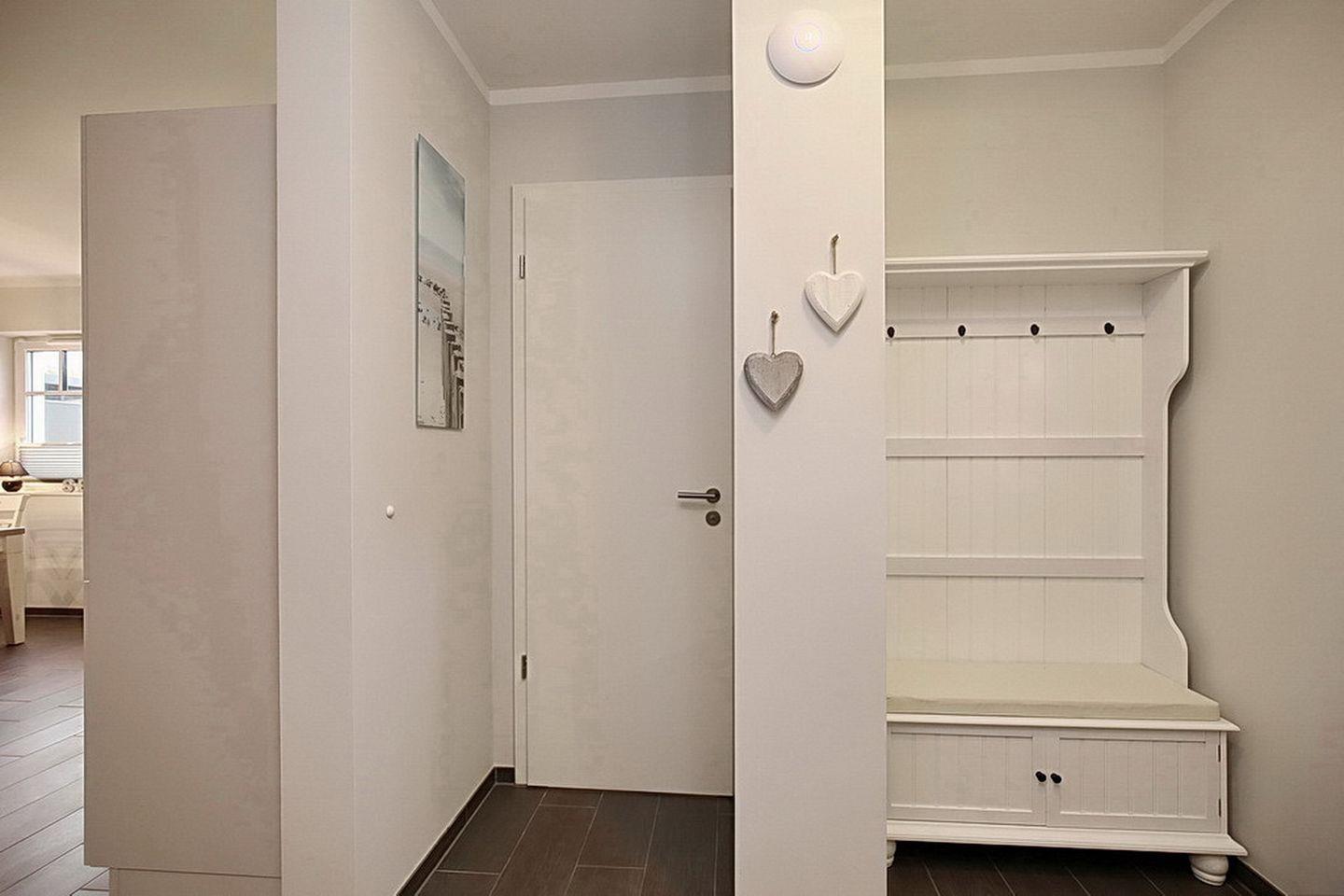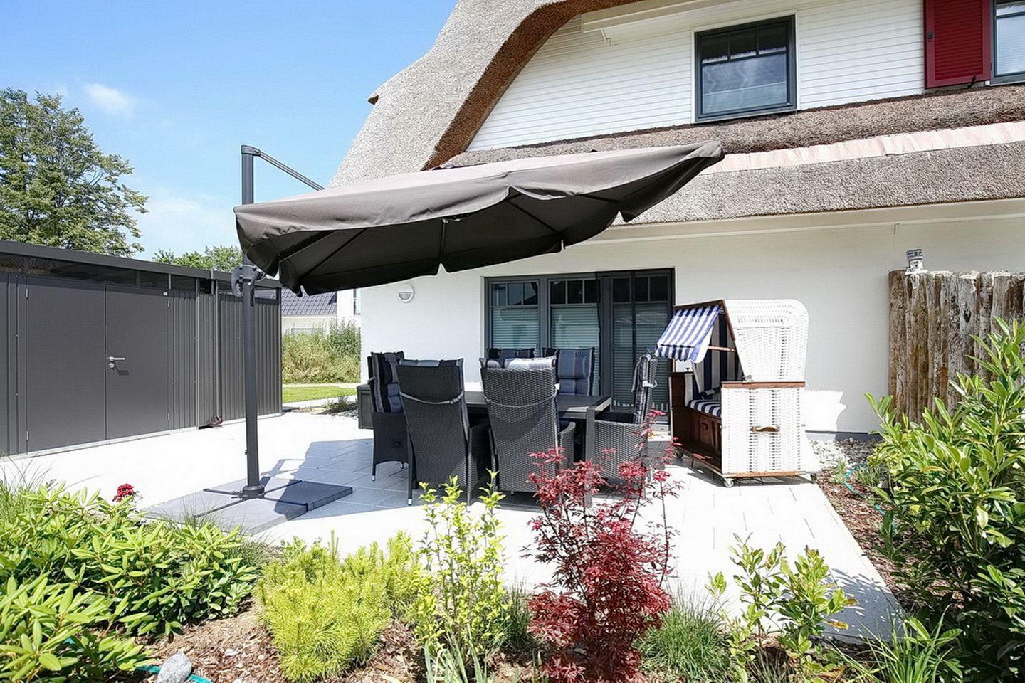 Der Zugang zur übergroßen Süd-West-Terrasse, die selbstverständlich u.a. mit einem Strandkorb möbliert ist, erfolgt direkt vom Wohnzimmer aus. Bequem von der Terrasse aus erreichst du die eigene kostenpflichtige Blockhaussauna (den Schlüssel erhältst du in der Rezeption). Hier genießt du entspannende Saunagänge.