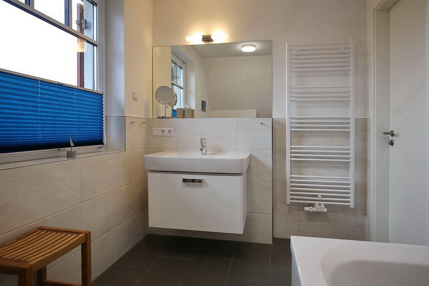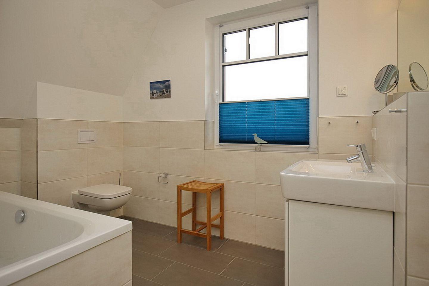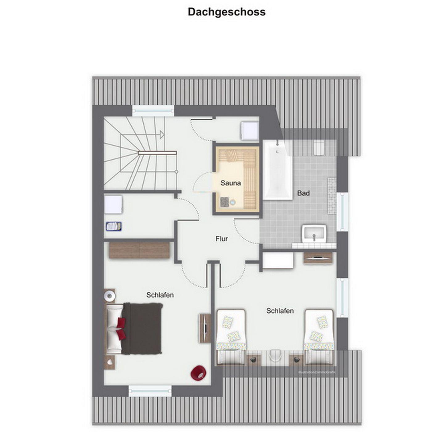 In den Schlafzimmern im Dachgeschoss stehen dir ein Doppelbett (2 x 90 x 200 cm) und zwei Einzelbetten (100 x 200 cm), jeweils ein TV sowie Kleiderschränke mit ausreichend Platz für deine Urlaubsgarderobe zur Verfügung. Beide Schlafzimmer verfügen über eine Verdunkelungsmöglichkeit. Des Weiteren verfügt das Dachgeschoss über ein Bad mit Badewanne sowie den Flur.