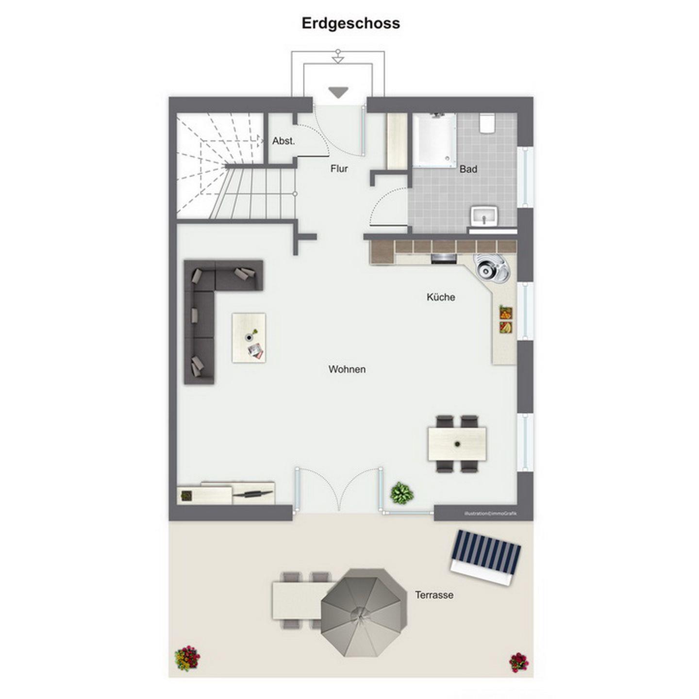 Im Erdgeschoss des Ferienhauses befinden sich der Wohnraum, eine gemütliche Essgruppe, eine Eck-Couch sowie die integrierte Küchenzeile. Auch das Duschbad sowie der Eingangsbereich befinden sich hier.