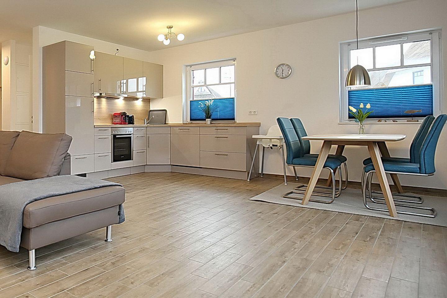 Der Zugang zur großzügigen, u.a. mit einem Strandkorb ausgestatteten Süd-West-Terrasse erfolgt direkt vom Wohnzimmer aus. In der hochwertig eingerichteten Küchenzeile findest du einen Geschirrspüler, einen Herd mit 4-Platten-Cerankochfeld und Backofen, einen Kühlschrank mit Gefrierfach, eine Kaffeemaschine, eine Tassimo-Maschine und vieles mehr vor.