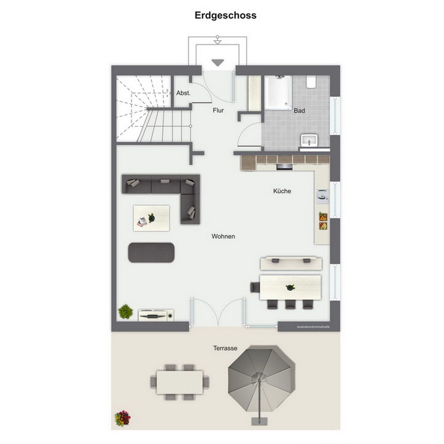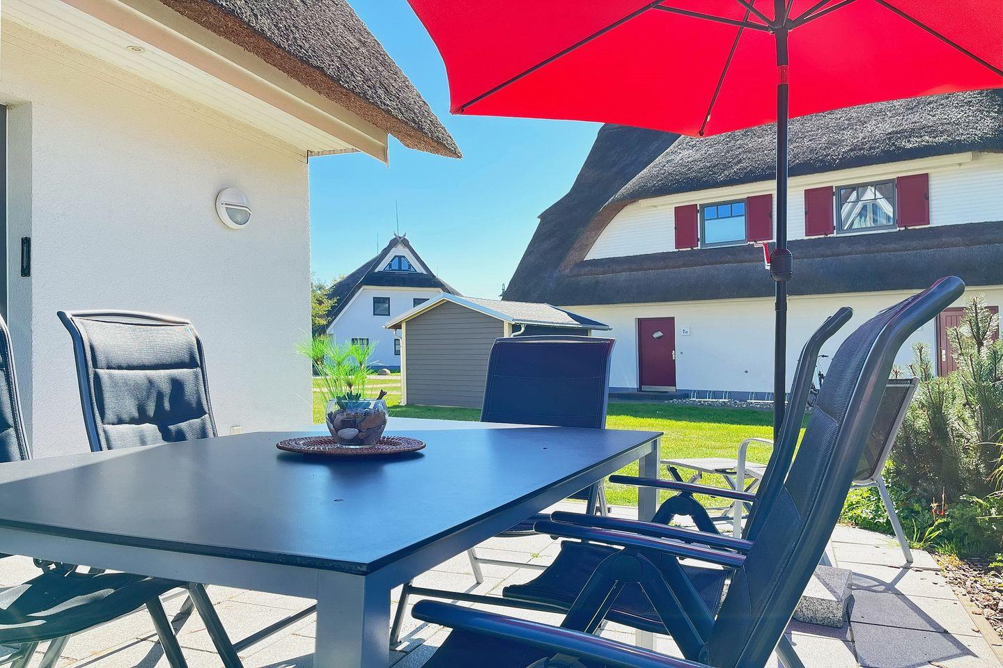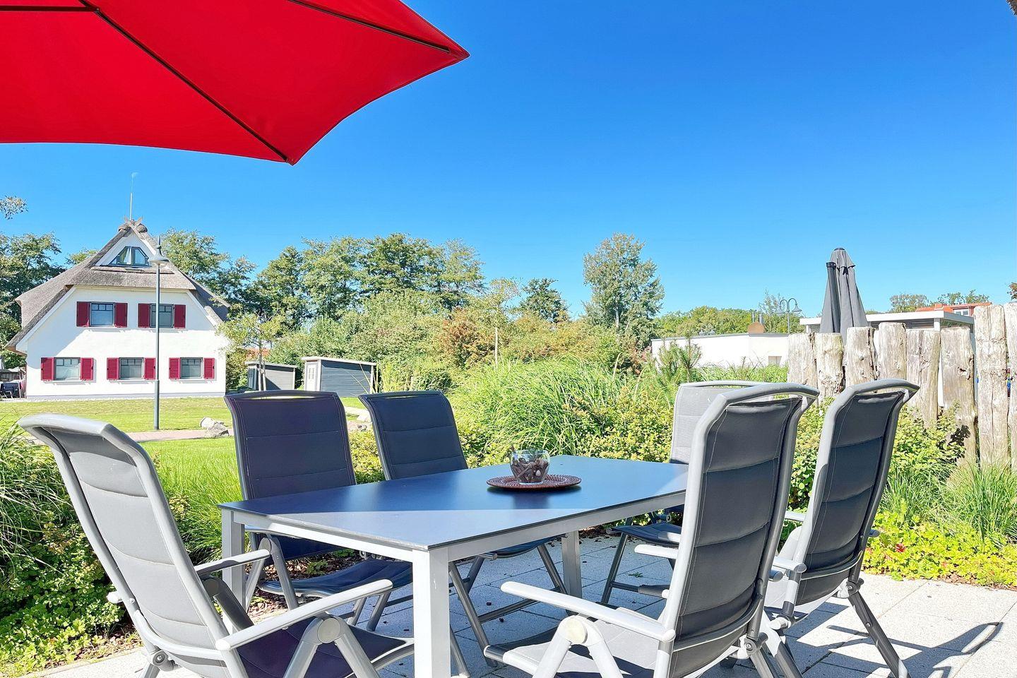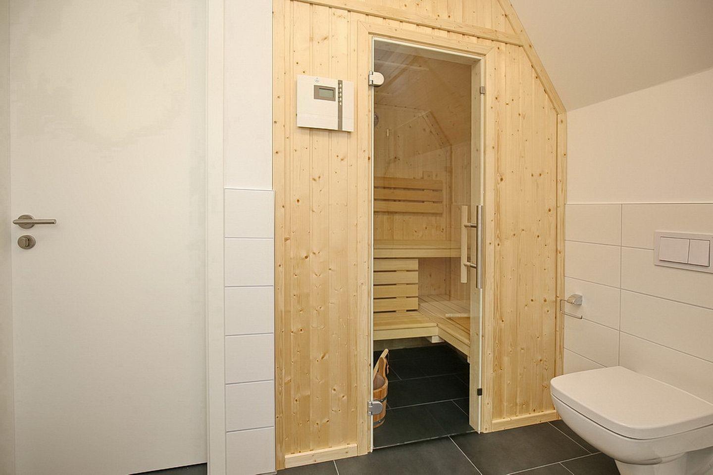 Ein Elektrogrill sorgt für entspanntes Grillen auf der Süd-West Terrasse, welche mit modernen und bequemen Möbeln ausgestattet ist. Man kann den Blick über die angrenzenden Wiesen und Felder streifen lassen. Nach einem Tag an der frischen Ostseeluft kannst du in der innenliegenden Finnsauna bei einem wohlriechenden Aufguss entspannen. Im Flur des Obergeschosses lädt eine Leseecke zum Verweilen ein.