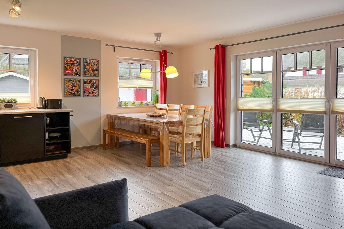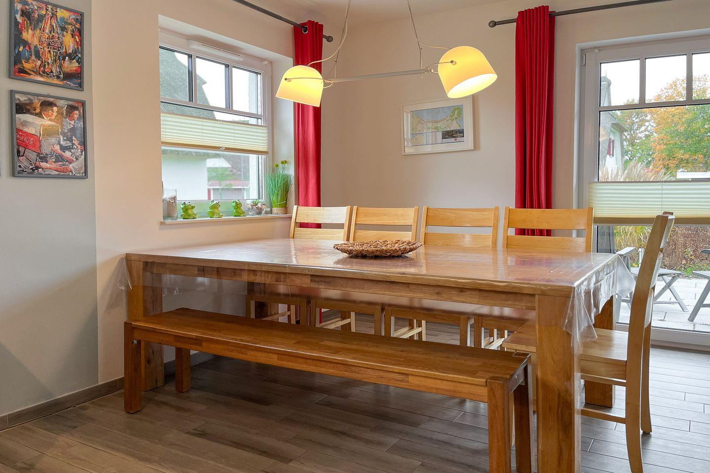 Das Haus ist modern und geschmackvoll eingerichtet. In der komplett ausgestatteten Küche mit Cerankochfeld, Backofen, Mikrowelle, Kühl-/Gefrierkombination, Geschirrspülmaschine und Kaffeefiltermaschine findest du alles, um dich kulinarisch zu versorgen. Am großzügigen Massivholzesstisch könnt ihr mit Familie und Freunden nicht nur euer Essen genießen, sondern auch in gemütlicher Atmosphäre die Abende verbringen. Für deine Unterhaltung stehen einige Brettspiele, Lesematerialien, ein großer LED Fernseher und eine Stereoanlage bereit. Eine große Wohnlandschaft lädt zum Verweilen ein. Diese kann bei Bedarf zu einer großzügigen Schlafgelegenheit für 2 Erwachsene umfunktioniert werden.