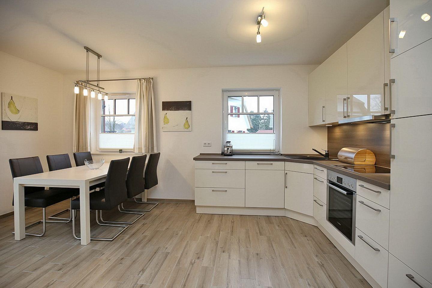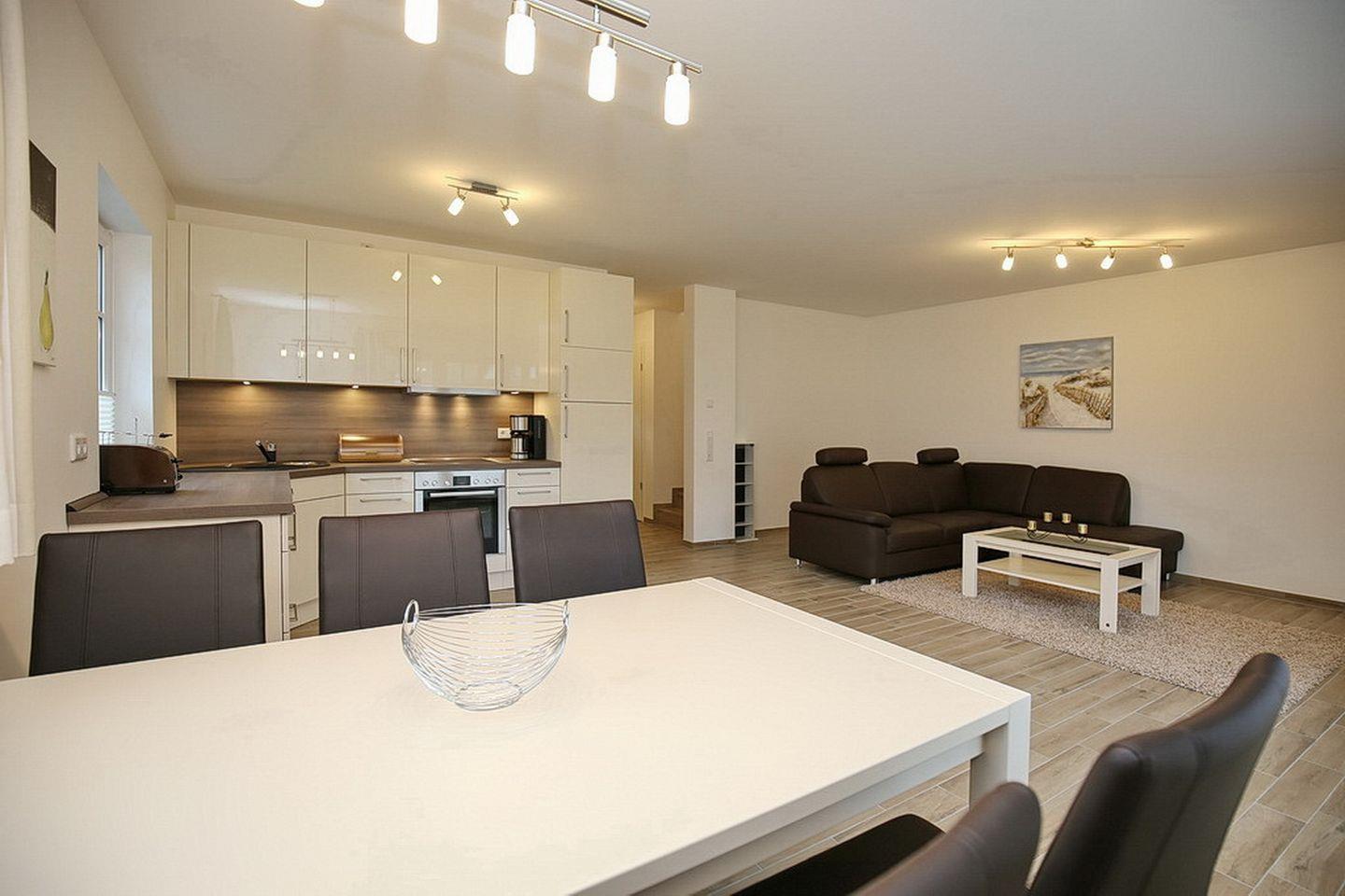 Im Erdgeschoss des Ferienhauses befindet sich der großzügige Wohnraum mit gemütlichem Essbereich, einem Schlafsofa (125 x 175 cm) für zwei Personen sowie der integrierten Küchenzeile. Die moderne Küchenzeile bietet Backofen, 4-Platten-Cerankochfeld, Mikrowelle, Geschirrspüler und einen Kühlschrank mit Gefrierfach.