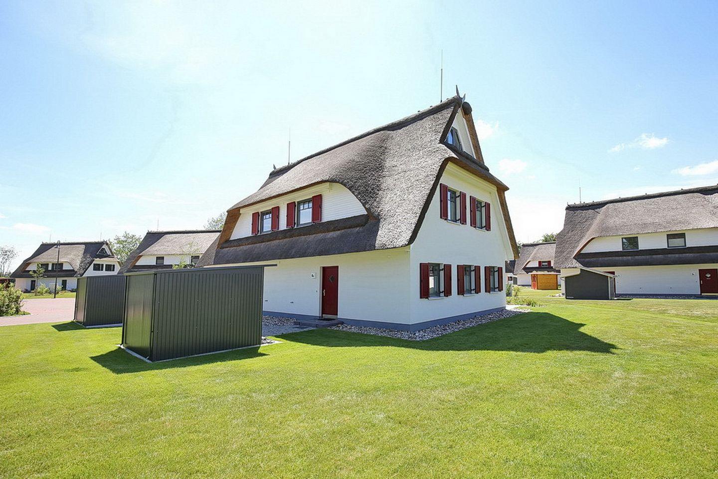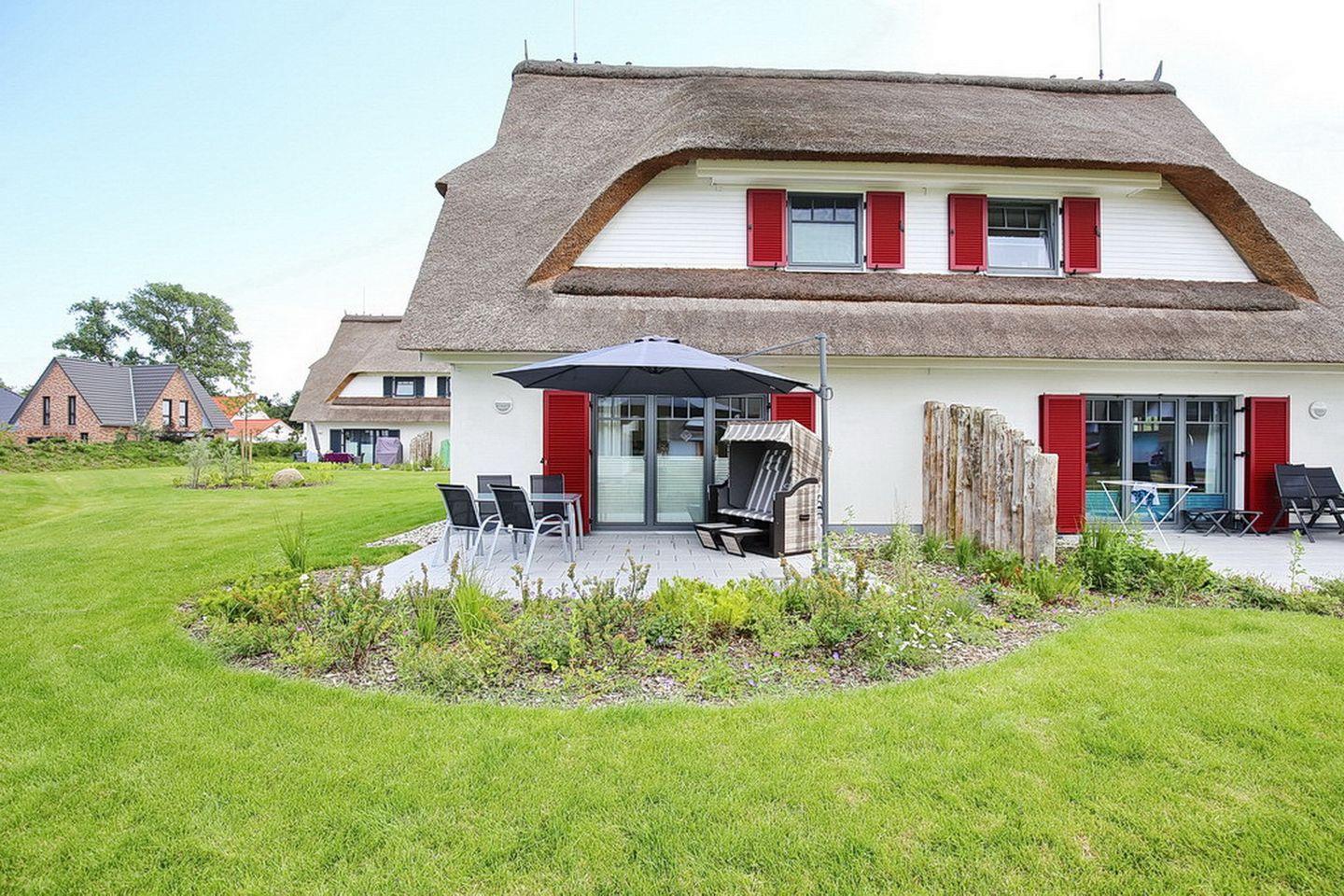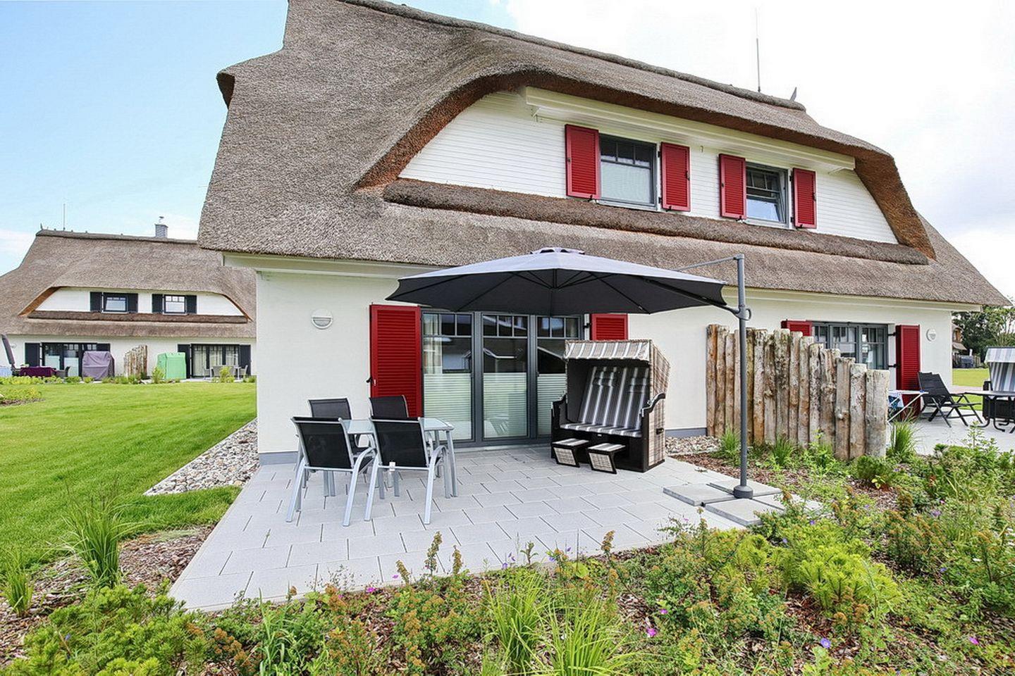 Auf zwei Etagen vereint diese großzügige Doppelhaushälfte mit Reetdach einen Wohnraum mit Zugang zur Terrasse, zwei Schlafzimmer und zwei moderne Bäder. Auf 88 m² hast du viel Platz für deinen Urlaub. Zum Strand sind es etwa 400 m.