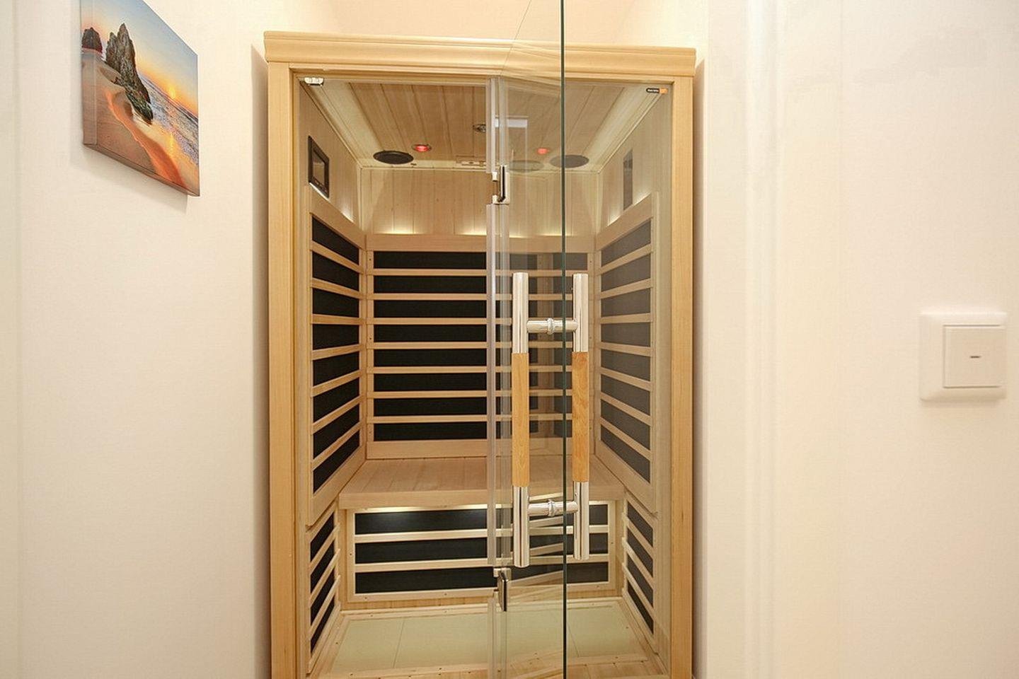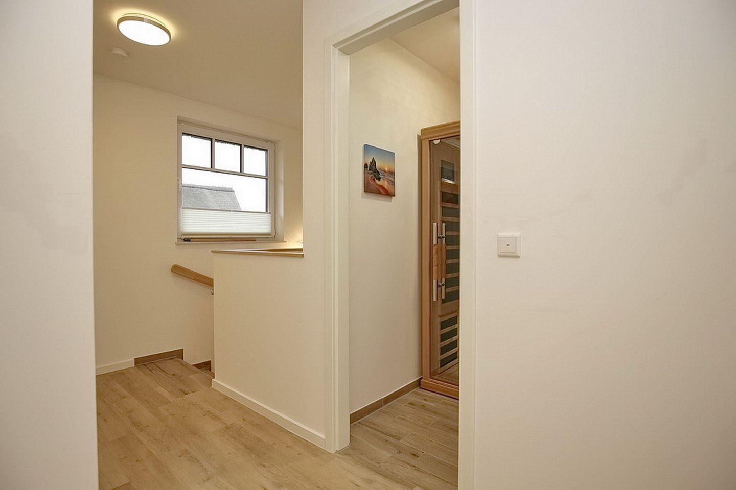 Im Obergeschoss bewohnst du zwei Schlafzimmer mit einem Doppelbett (2 x 90 x 200 cm) und zwei Einzelbetten (90 x 200 cm). Beide Schlafzimmer verfügen über eine Verdunkelungsmöglichkeit. Ein Badezimmer mit Badewanne lädt zusätzlich zum Entspannen ein. In dieser Nichtraucherwohnung sind keine Haustiere erlaubt. Ein Kinderhochstuhl sowie eine Waschmaschine sind inklusive. Die Besonderheiten in dem Ferienhaus sind die kleine Infrarotsauna, die vorhandenen Bücher und DVDs sowie eine Auswahl an Spielen. Ein WLAN-Anschluss (ohne Gewähr) ist vorhanden.