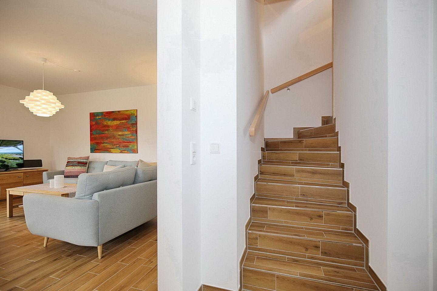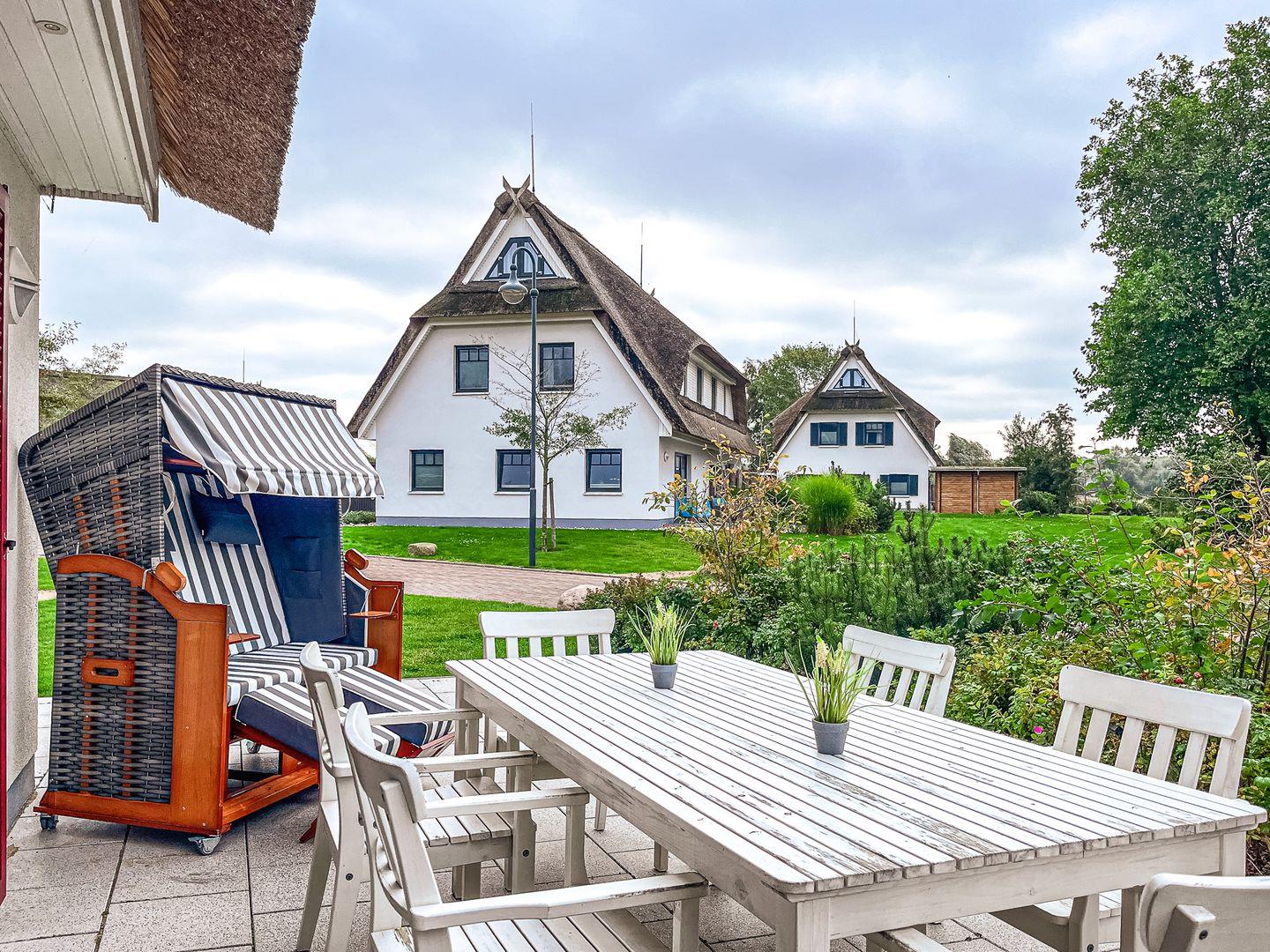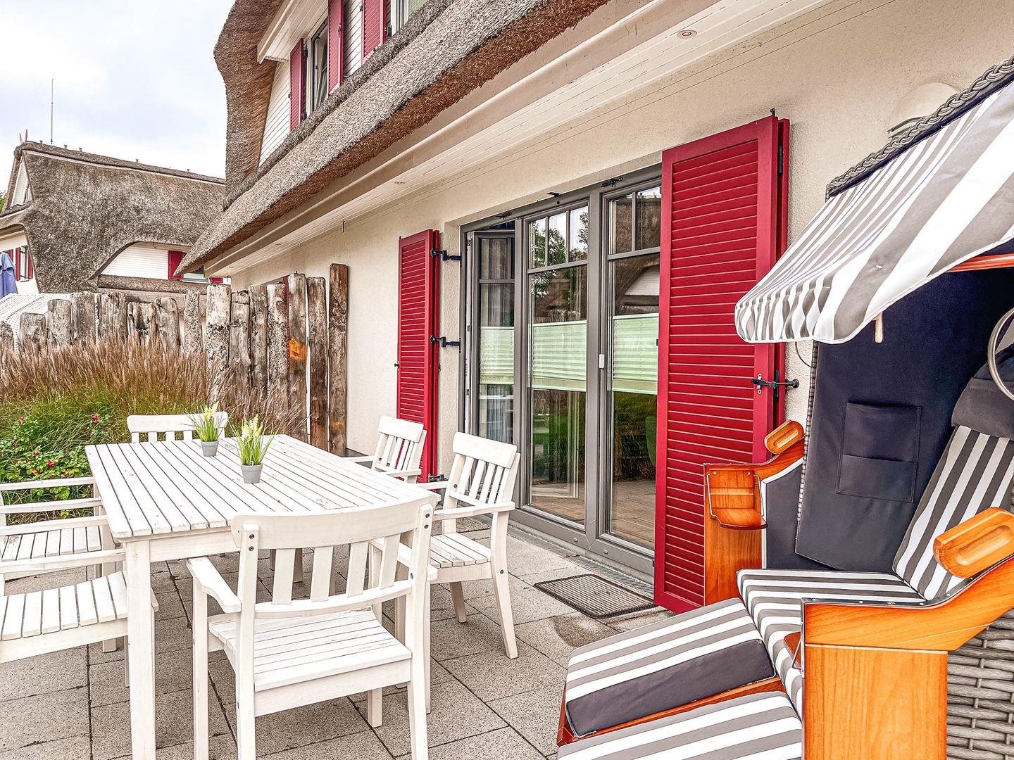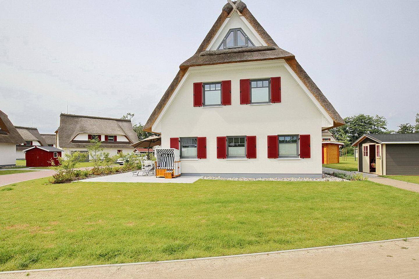 Auf drei Etagen vereint die großzügige Doppelhaushälfte mit Reetdach einen Wohnraum mit Zugang zur Terrasse, drei Schlafzimmer und zwei moderne Bäder. Zusammen mit dem Spitzboden hast du hier auf ca. 100 m² viel Platz für deinen Urlaub.