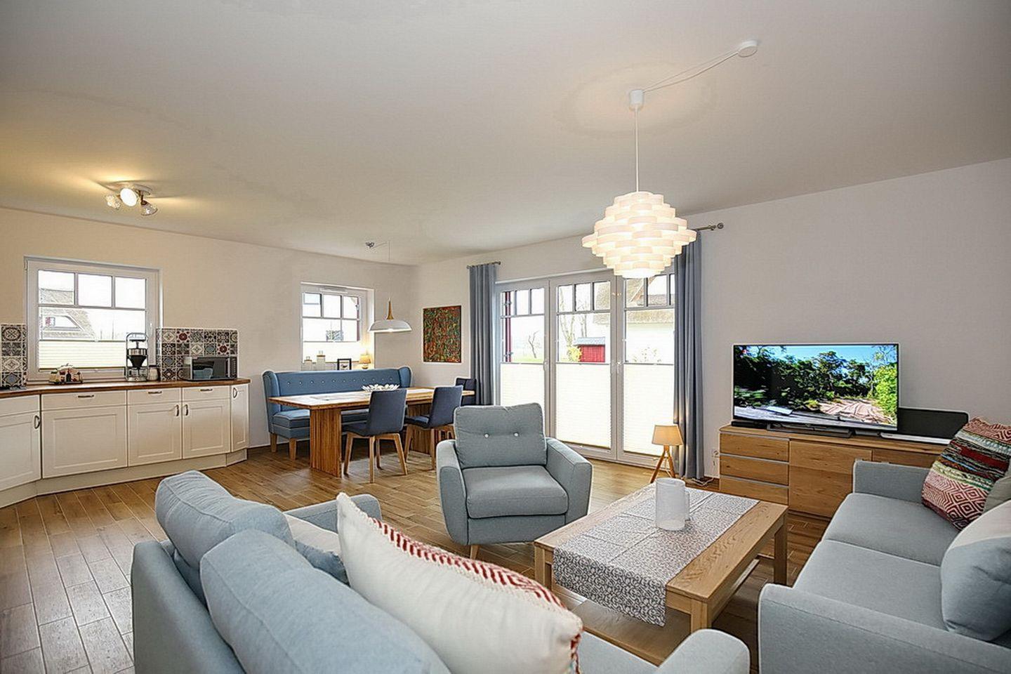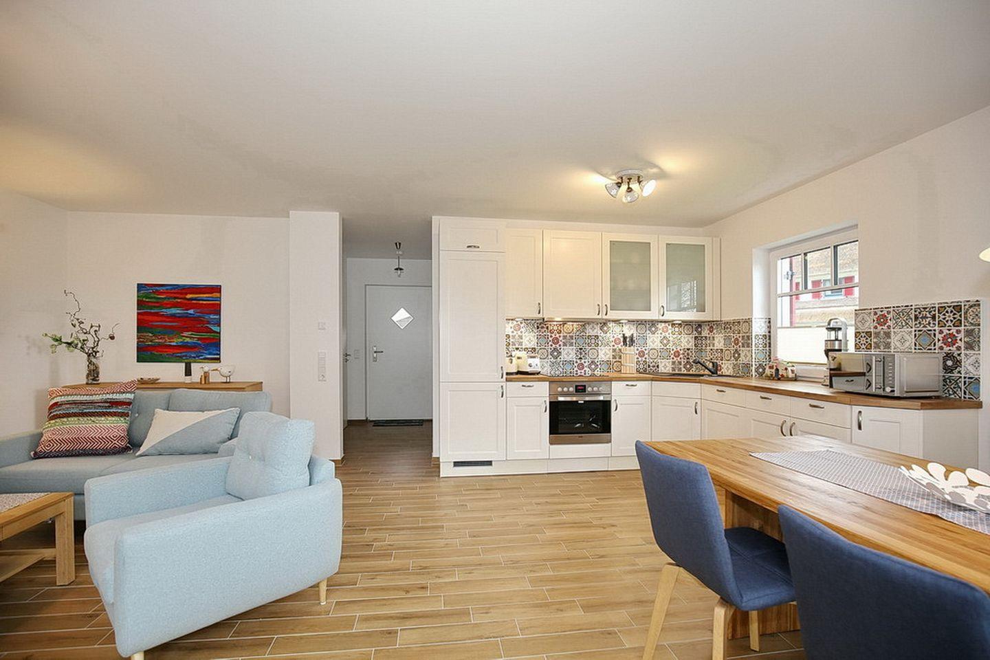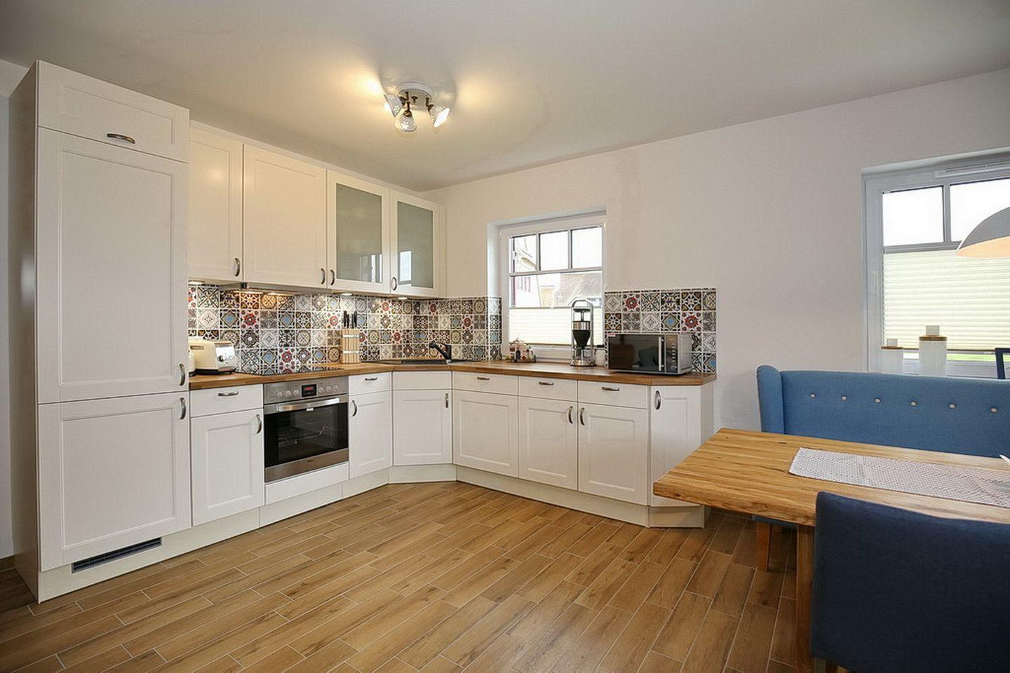 Auf drei Etagen vereint die großzügige Doppelhaushälfte mit Reetdach einen Wohnraum mit Zugang zur Terrasse, drei Schlafzimmer und zwei moderne Bäder. Zusammen mit dem Spitzboden hast du hier auf ca. 100 m² viel Platz für deinen Urlaub.