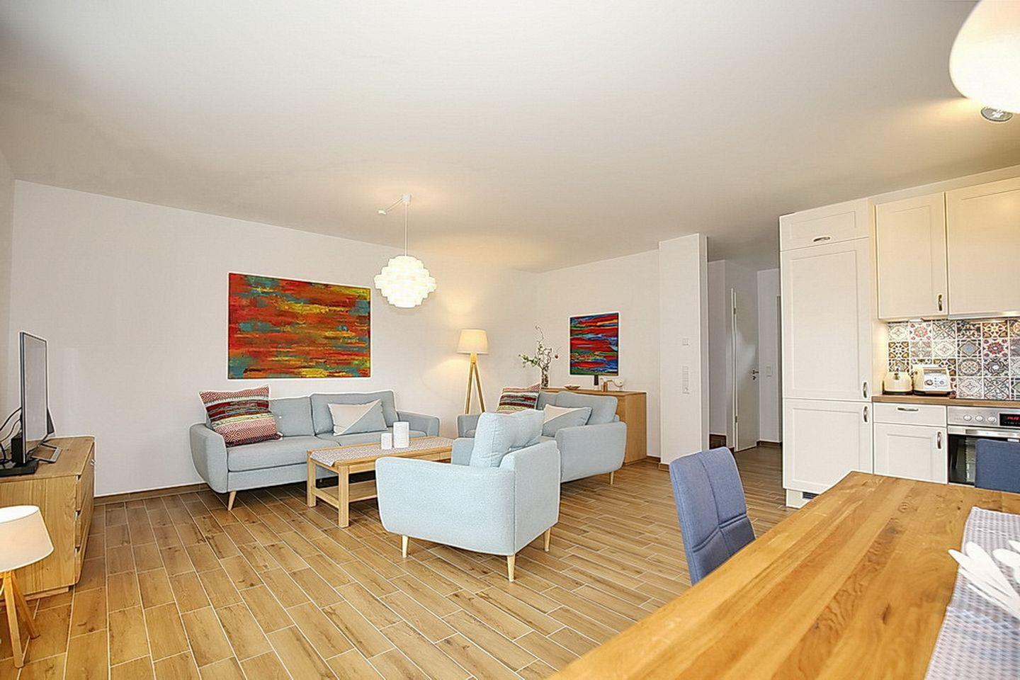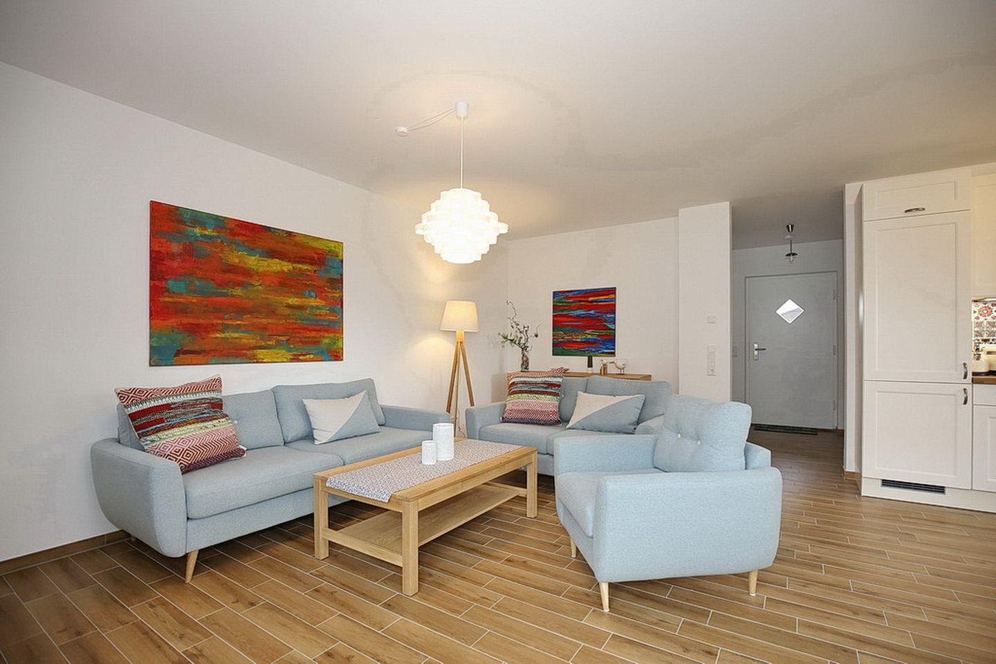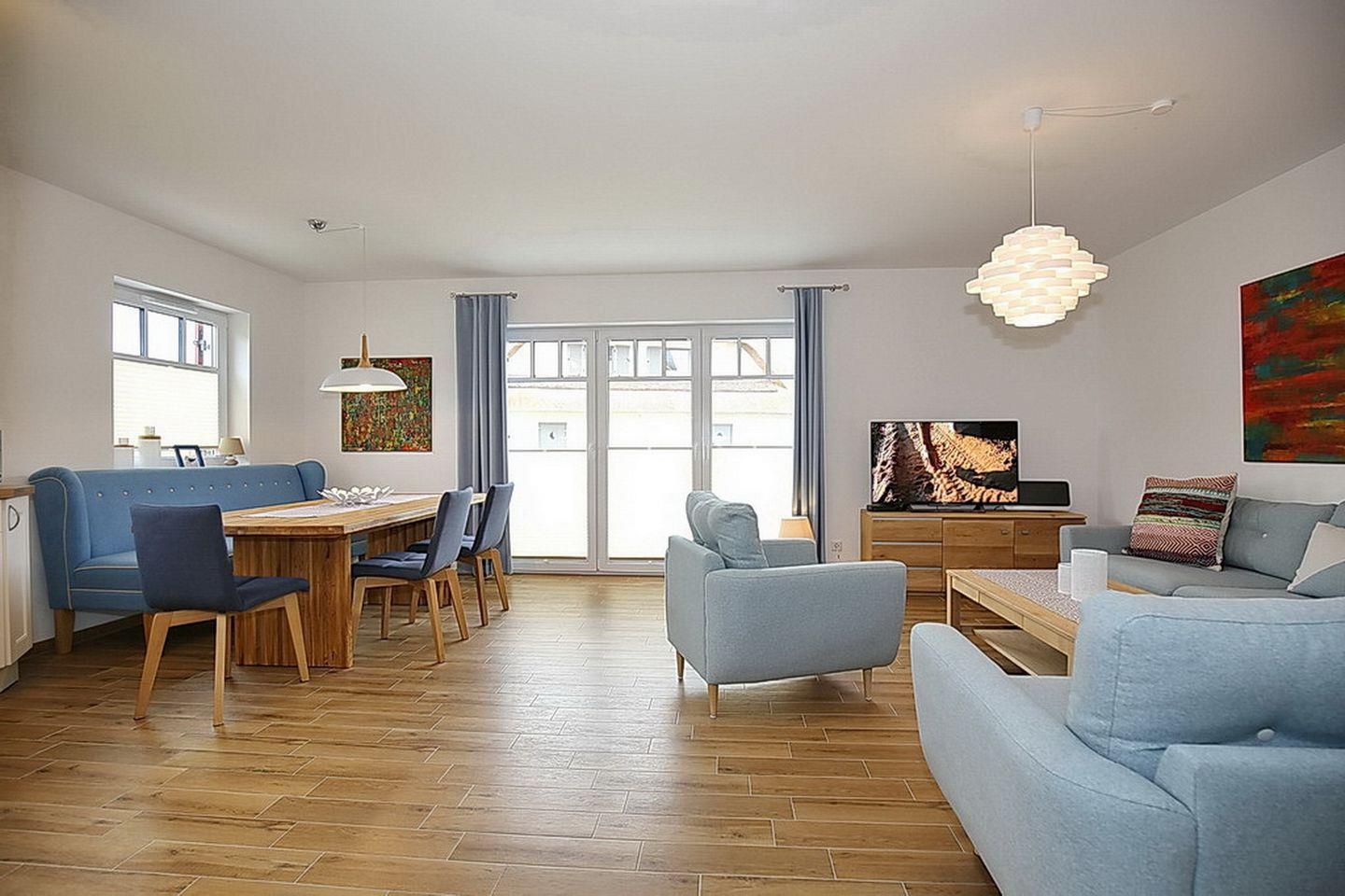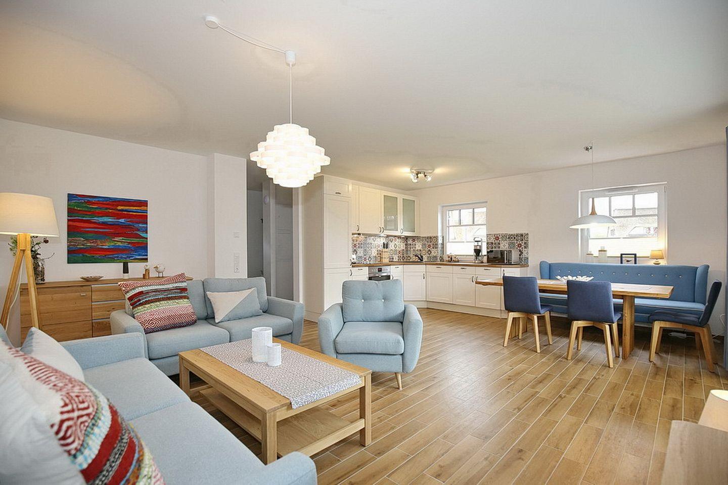 Auf drei Etagen vereint die großzügige Doppelhaushälfte mit Reetdach einen Wohnraum mit Zugang zur Terrasse, drei Schlafzimmer und zwei moderne Bäder. Zusammen mit dem Spitzboden hast du hier auf ca. 100 m² viel Platz für deinen Urlaub.