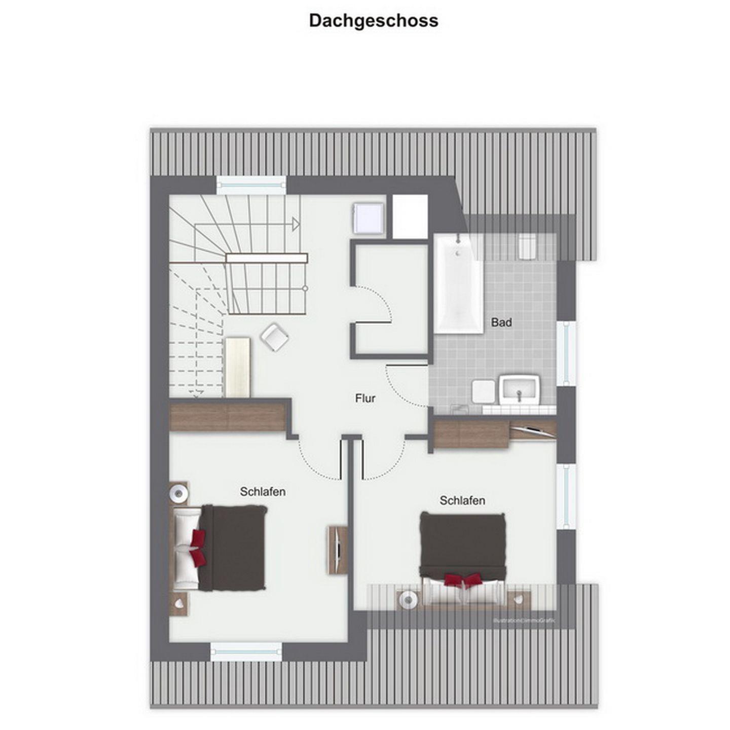 In den zwei Schlafzimmern im Obergeschoss stehen dir zwei Doppelbetten (2 x 90 x 200 cm) und Schränke mit Platz für deine Urlaubsgarderobe zur Verfügung. Das geräumige Badezimmer ist mit einem Waschbecken und einer Badewanne ausgestattet.
