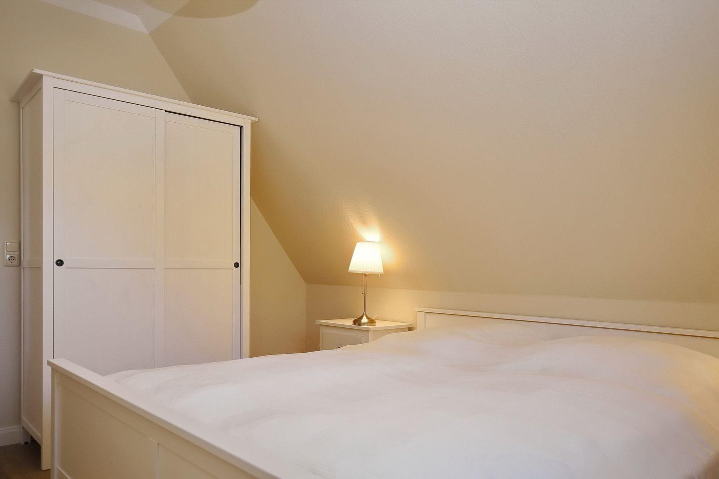 Ein Schlafzimmer ist mit einem Doppelbett (2 x 90 x 200 cm) und einem Kleiderschrank für deine Urlaubsgarderobe eingerichtet. Die Fenster werden mit Vorhängen abgedunkelt.