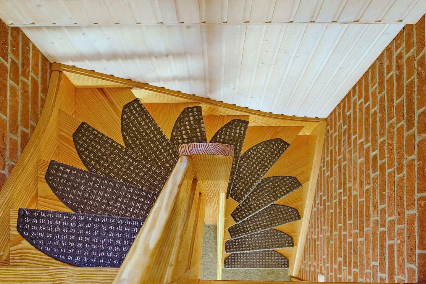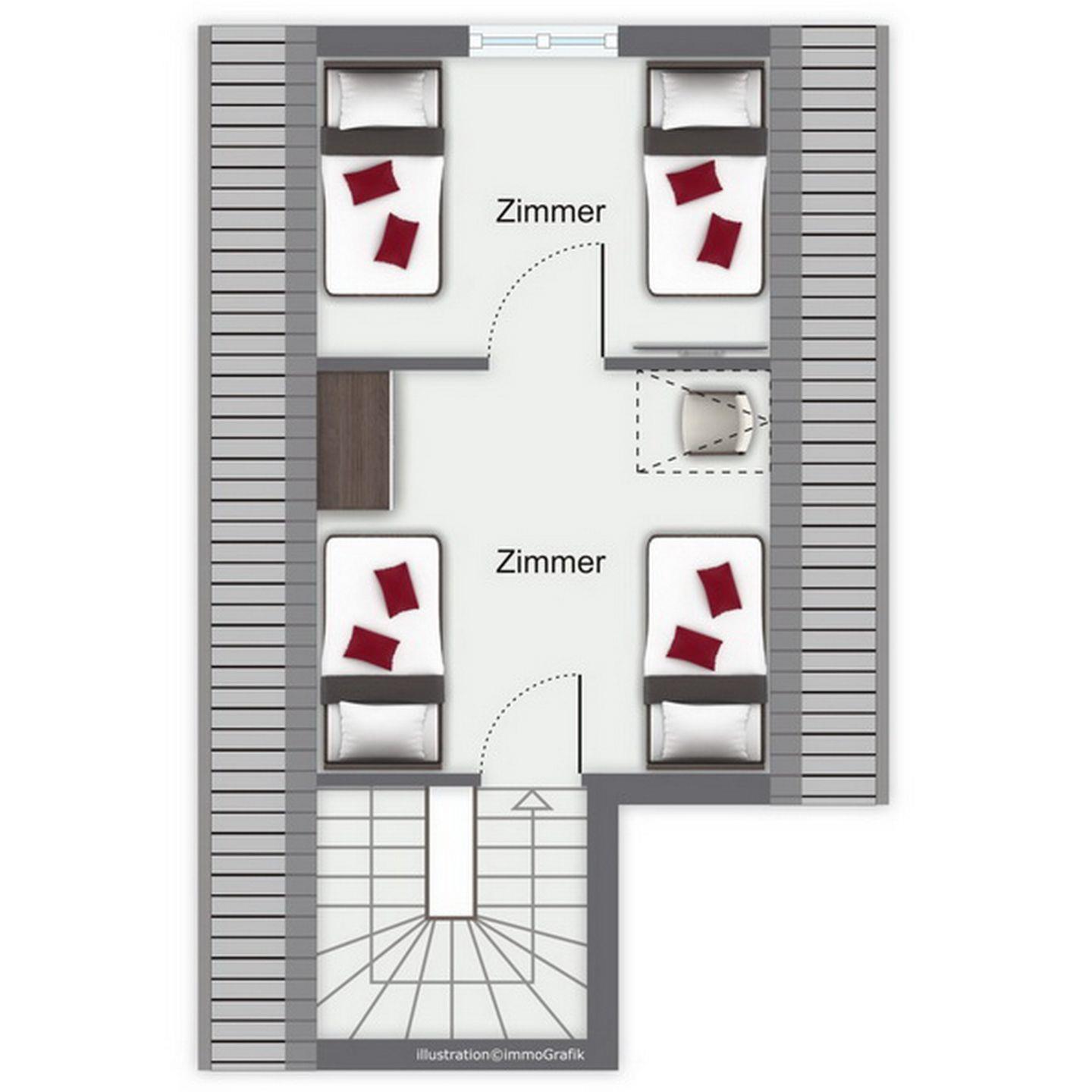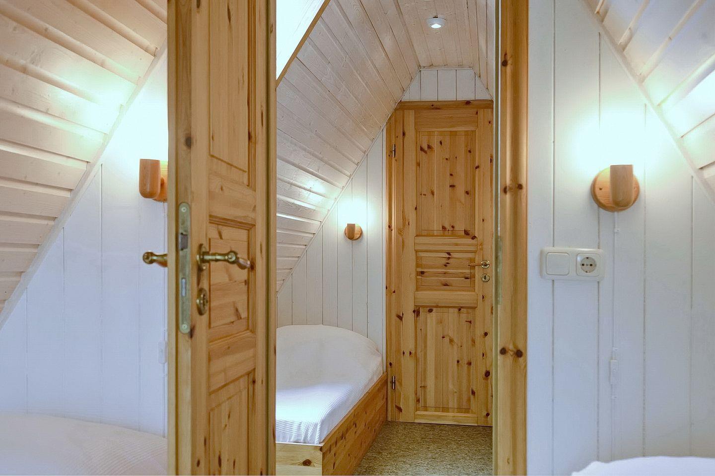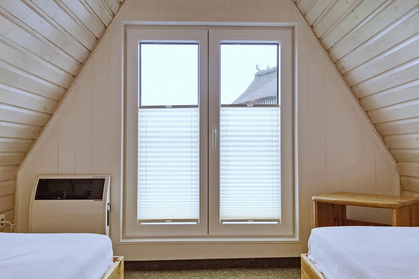 Über eine Holzwendeltreppe erreichst du die im Dachgeschoss hintereinander gelegenen Schlafzimmer mit je 2 Einzelbetten (80 x 190 cm). Für deine Garderobe nutzt du die im Treppenbereich befindliche Kommode mit Schiebetür und die Garderobestange. Die Fenster sind mit Plissees und Rollläden ausgestattet.