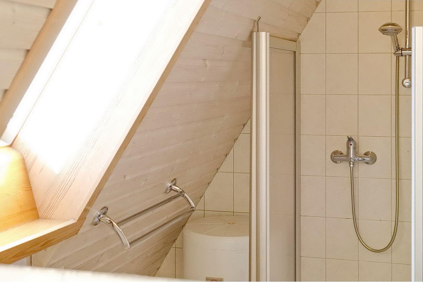 Das Badezimmer mit Fenster, Dusche und WC befindet sich ebenfalls im Erdgeschoss.