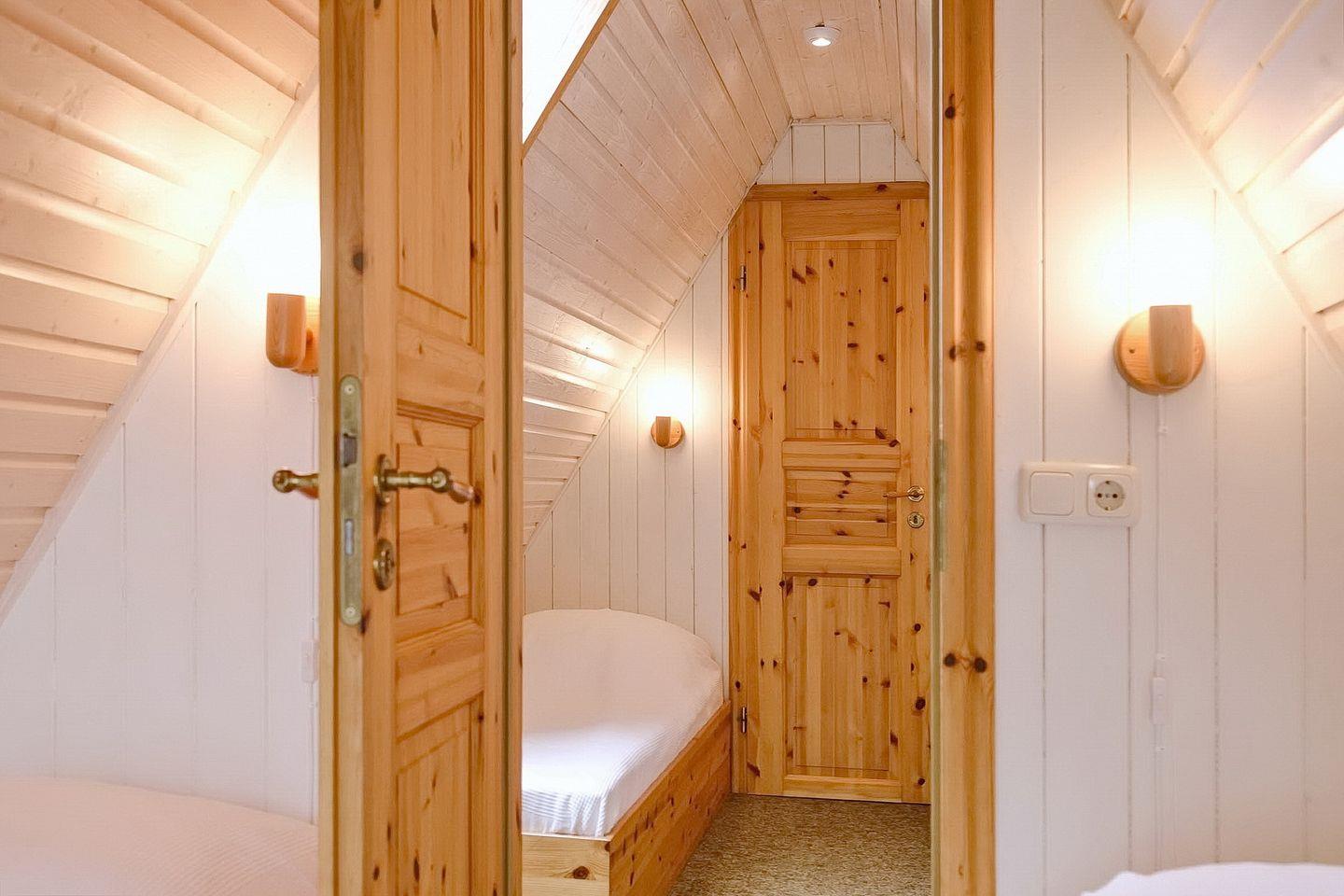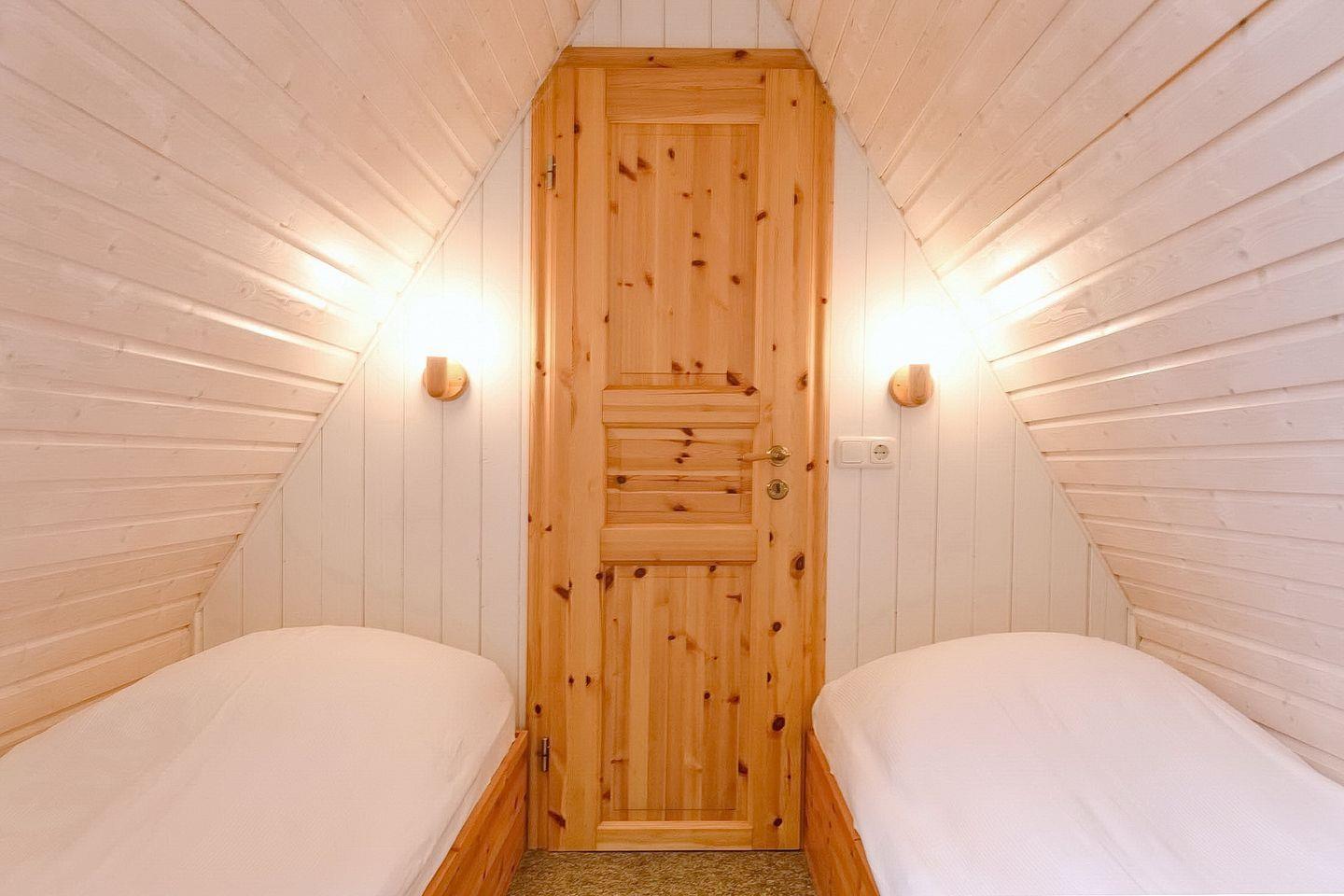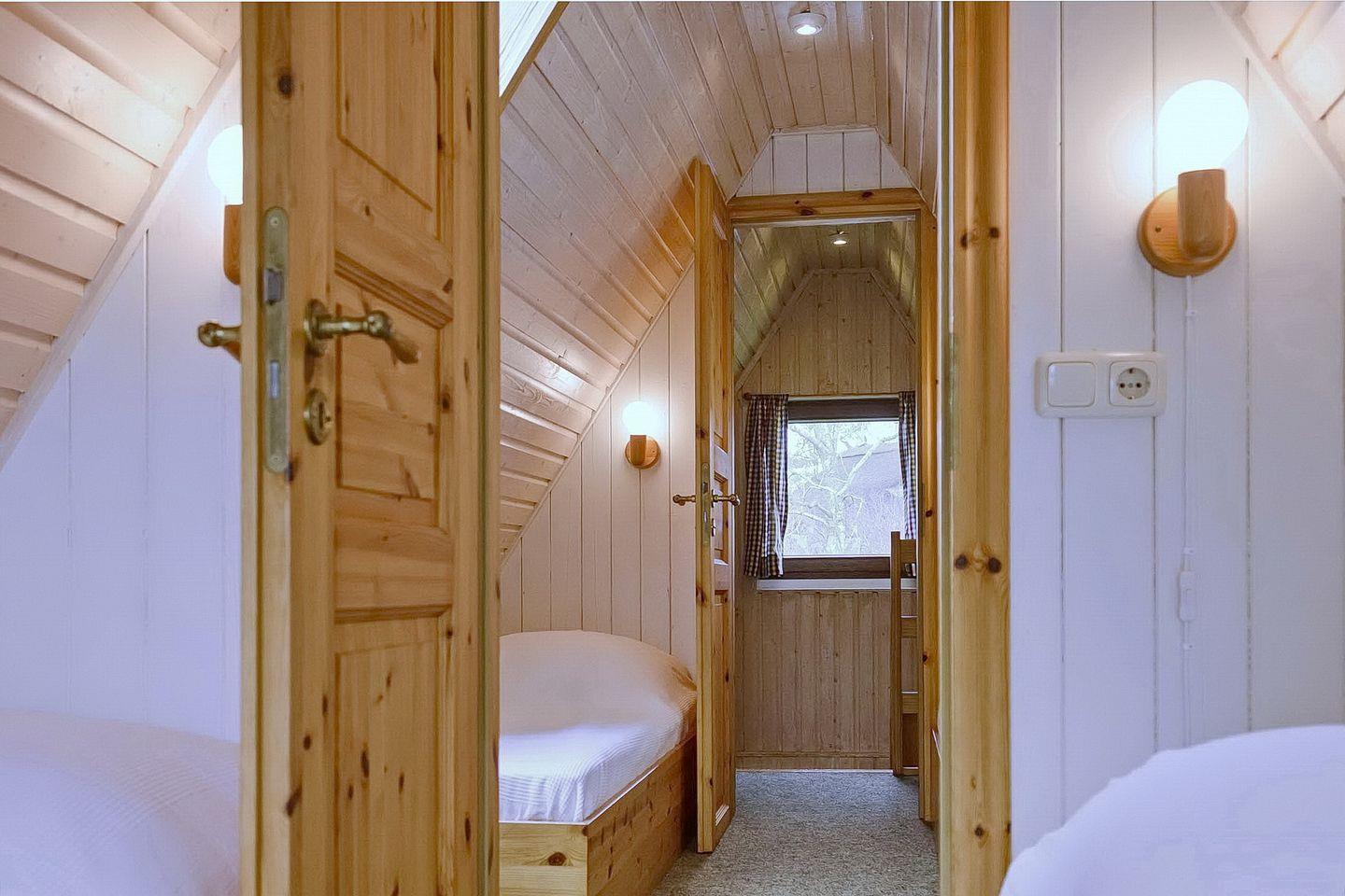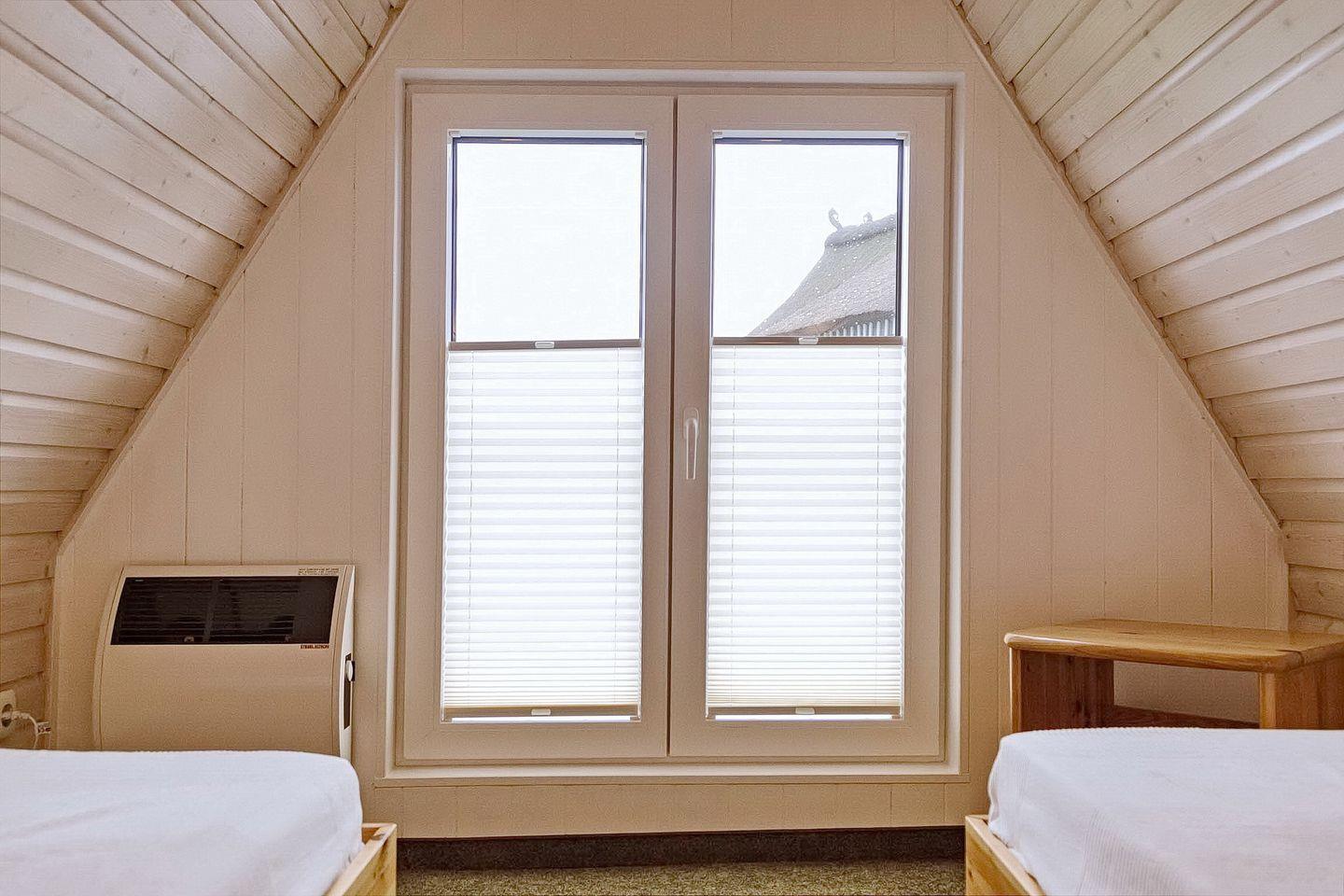 Über eine Holzwendeltreppe erreichst du die im Dachgeschoss hintereinander gelegenen Schlafzimmer mit je 2 Einzelbetten (80 x 190 cm). Für deine Garderobe nutzt du die im Treppenbereich befindliche Kommode mit Schiebetür und die Garderobestange. Die Fenster sind mit Plissees und Rollläden ausgestattet.