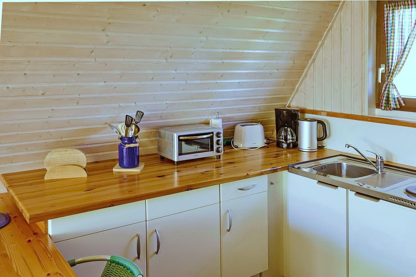 Die integrierte Küchenzeile verfügt über einen 2-Plattenherd ohne Backofen, ein Minibackofen, einen Kühlschrank mit Gefrierfach, eine Kaffeemaschine, einen Wasserkocher und einen Toaster. An dem an der Küchenzeile angeschlossenen Esstisch mit 4 Stühlen kannst du deine Mahlzeiten einnehmen.