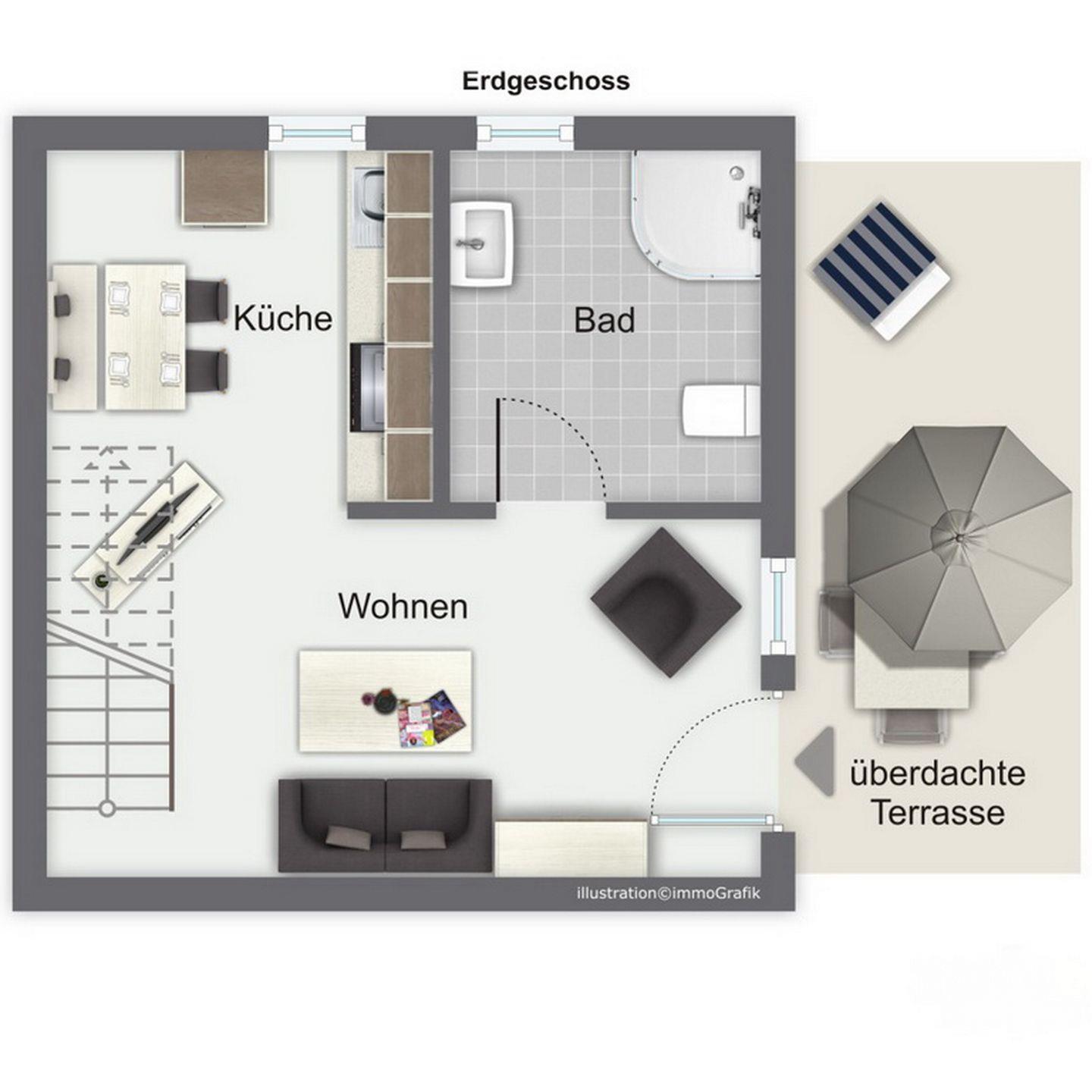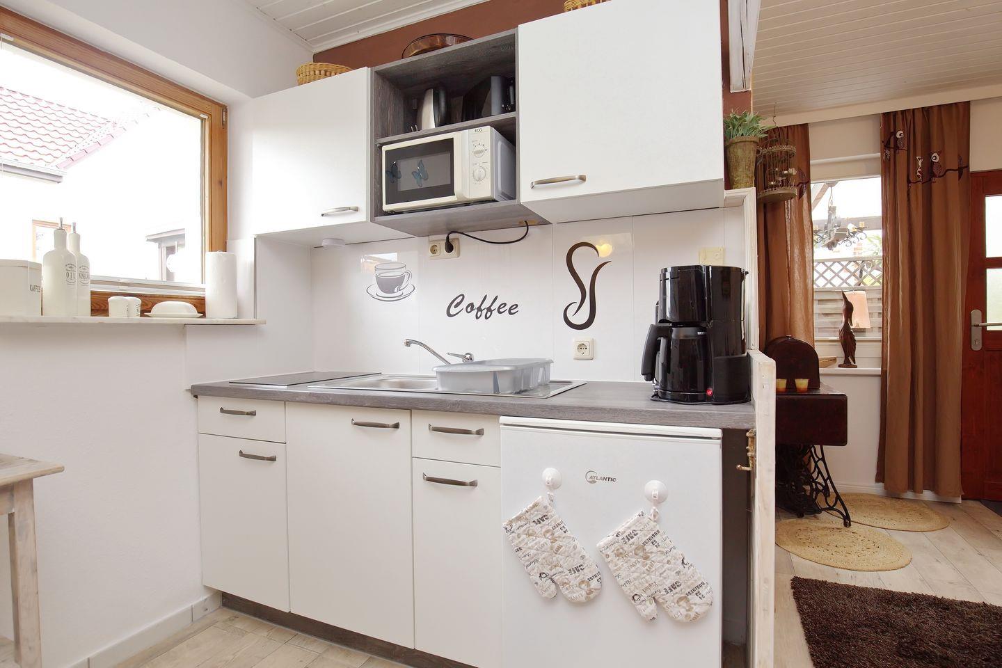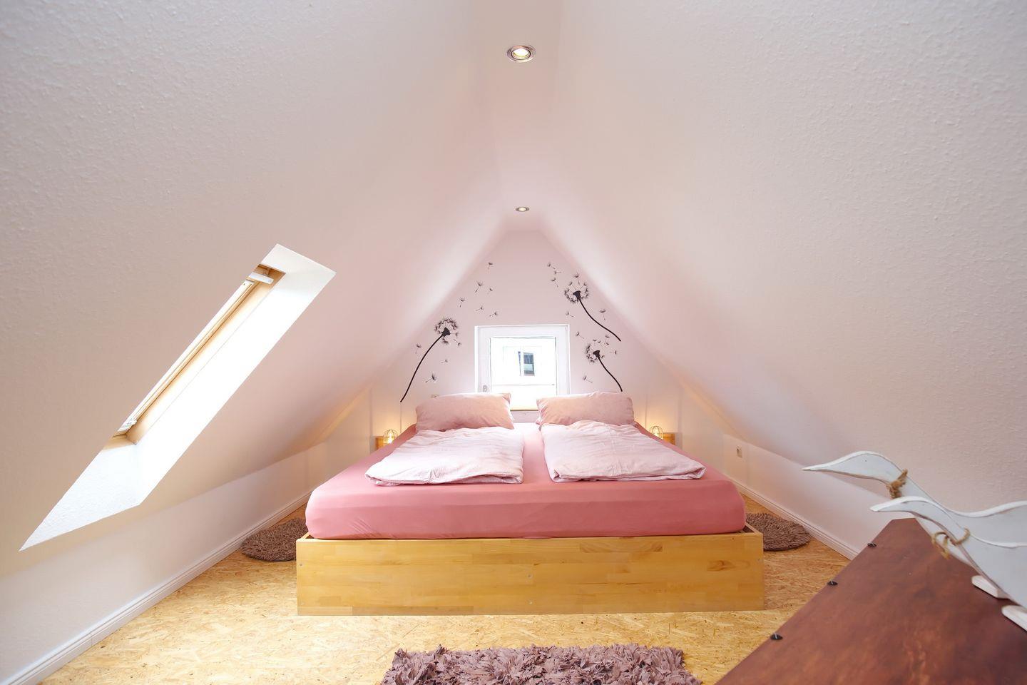 Für die Zubereitung deiner Mahlzeiten nutzt du in der kleinen Küchenzeile: Mikrowelle, Kühlschrank mit Gefrierfach und das 2-Plattenkochfeld. Über die innenliegende (steile) Treppe gelangst du in das Schlafzimmer unter dem Dach. Hier träumst du in einem bequemen Doppelbett. Abgedunkelt werden die Fenster mit Rollos. Dein Urlaubsgepäck findet seinen Platz im Kleiderschrank im Wohnraum.